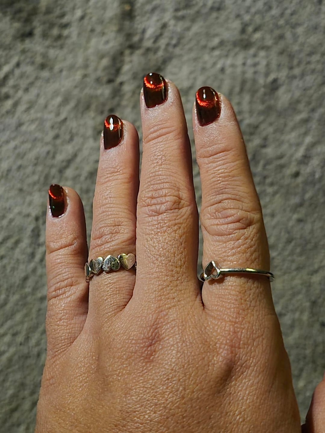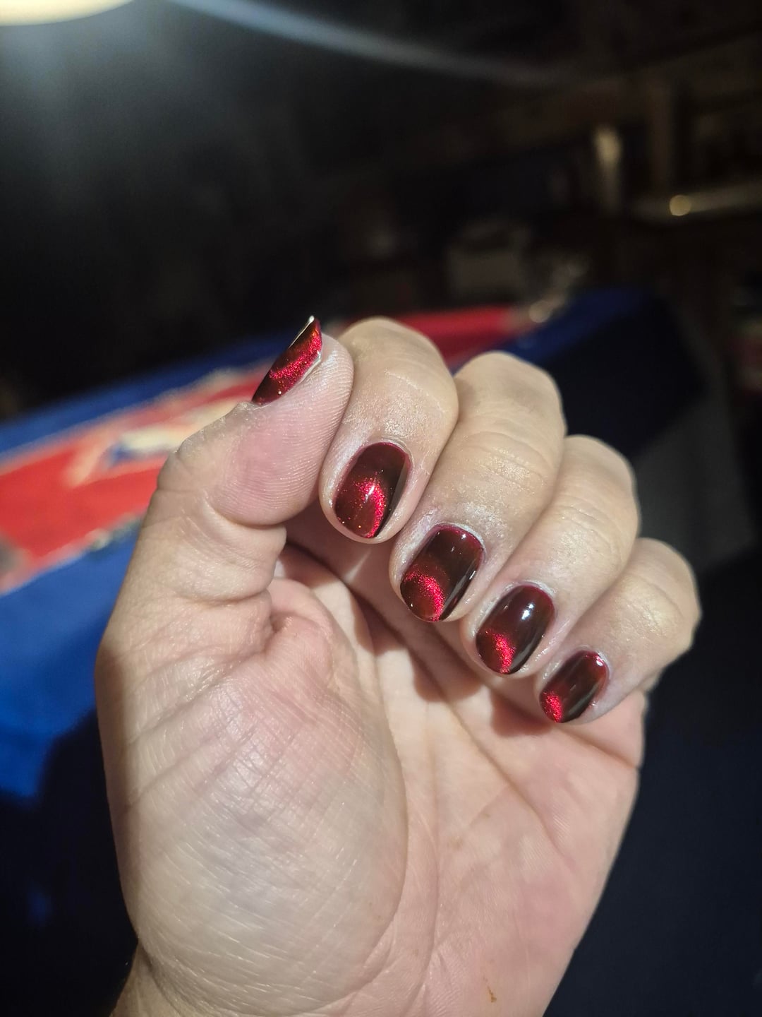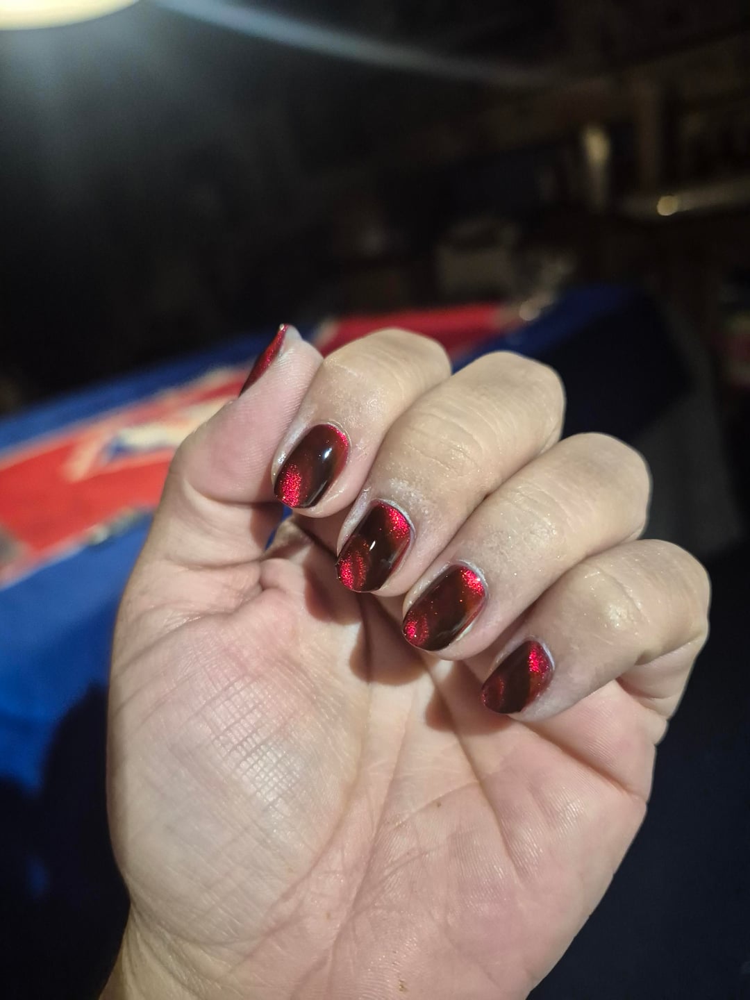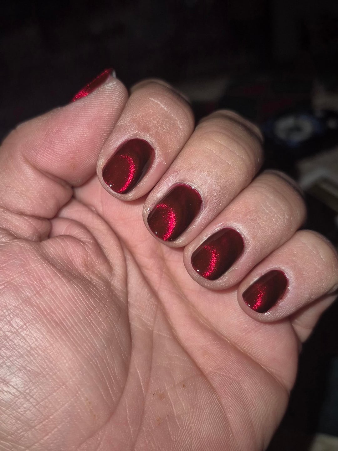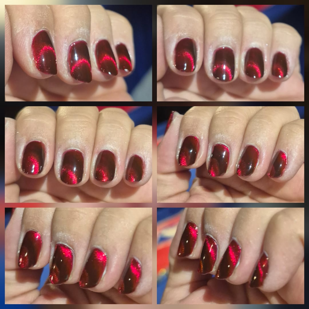 The first few shots and the gif are from day 1, the middle (8, 9 and 10) are from day 4, and the last one is day 7, 5m before this post. My day 1 hands are dry af from acetone clean up and no oil yet, but I was so mesmerized I had to take pics after I finished in my wild basement led lighting. I magnetized each coat, then after I finished doing the second coat on my first hand I went right in with my topcoat and magnetized again. Then I did the second coat on my other hand and again went right in with topcoat.