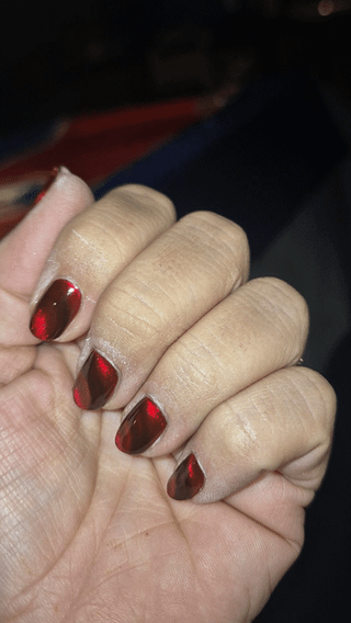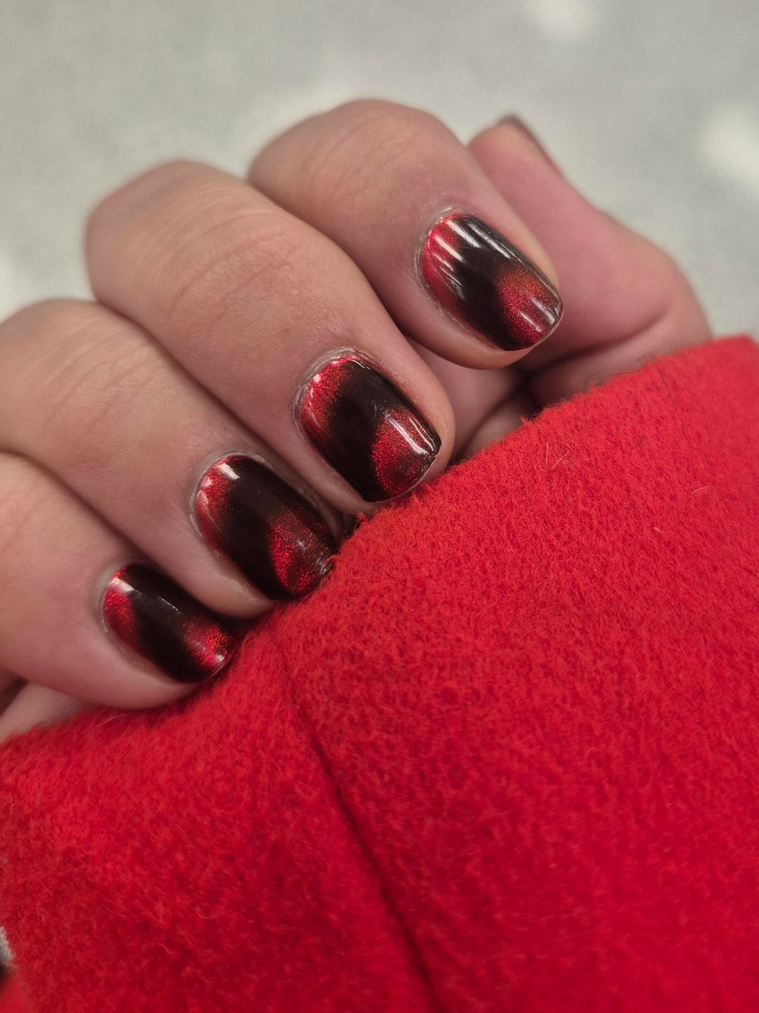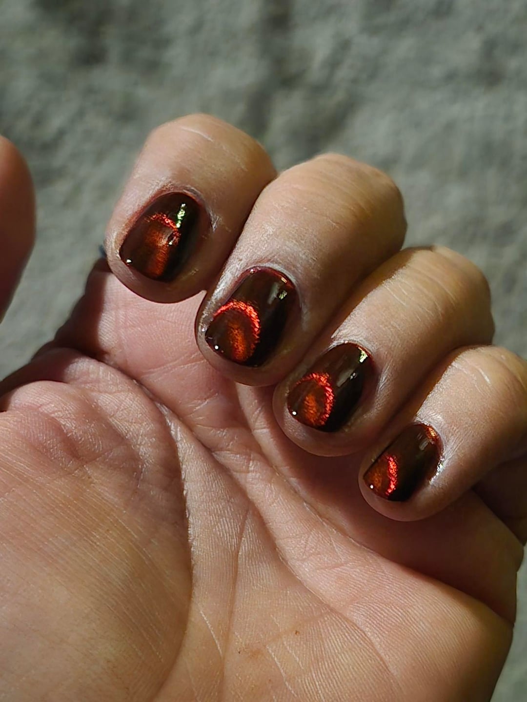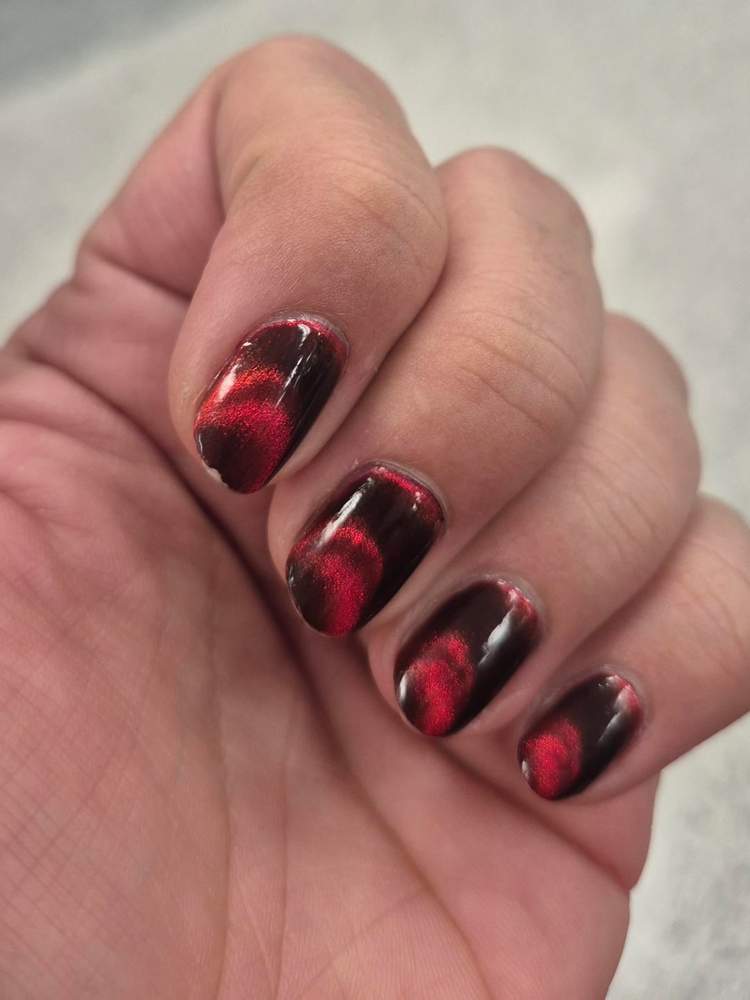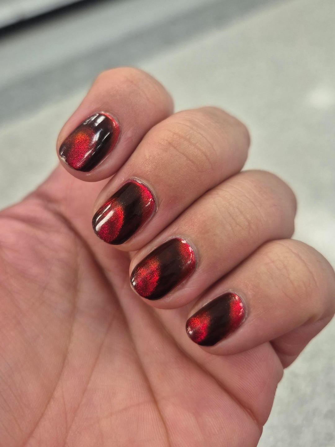 So I did these last week. Used Emily de Molly's Fiery Attraction, in 2 coats, with a ring magnet. I'm kind of in love with the turnout, may just use my ring magnet for everything. Had way too much fun driving around in the sunlight wiggling my hands around.