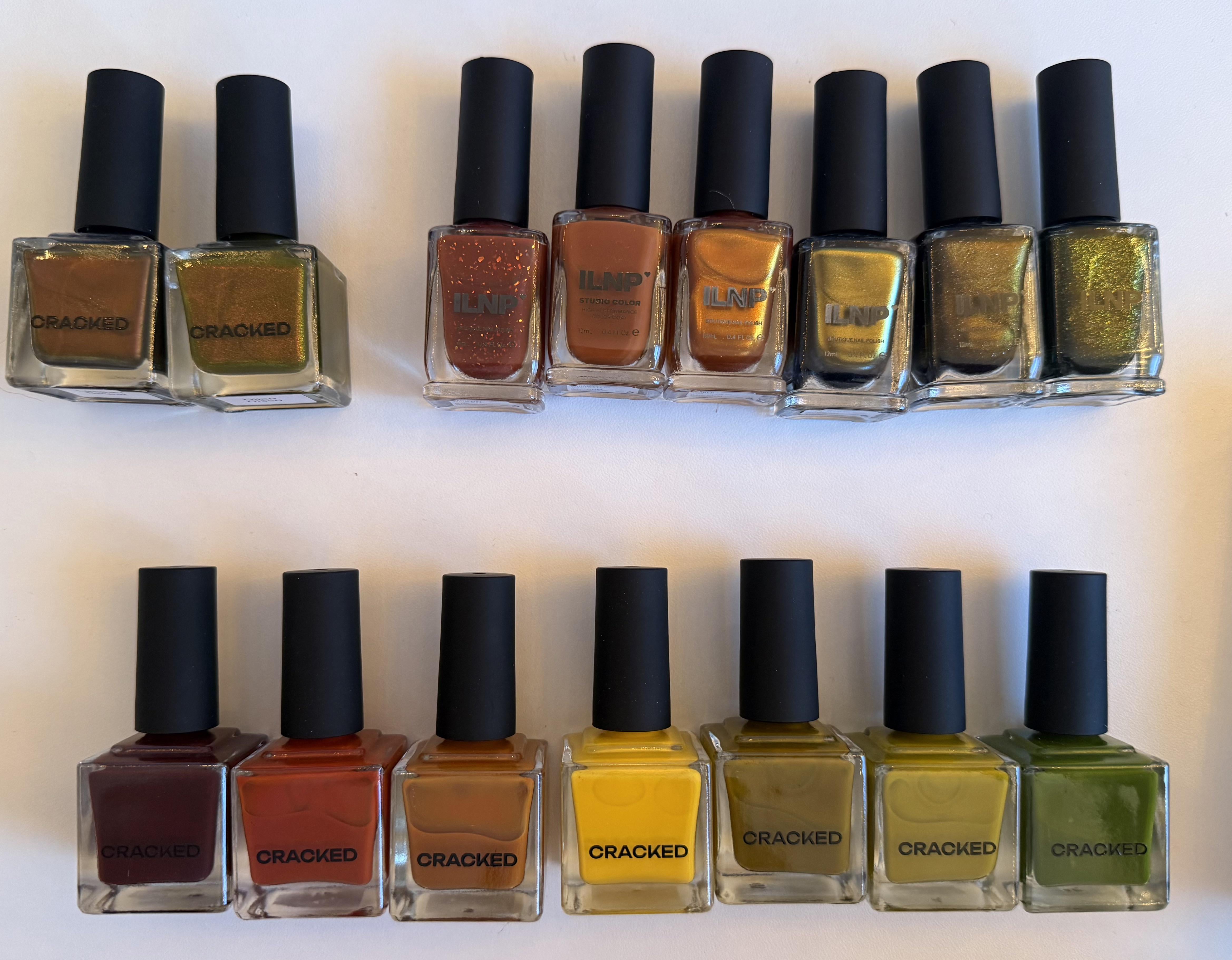 I made one order from ILNP and my first ever order from Cracked Polish and both packages just arrived! Obviously had to line up all the new polishes, and I thought you all would get a chuckle out of how unintentionally cohesive this colour palette is 😂