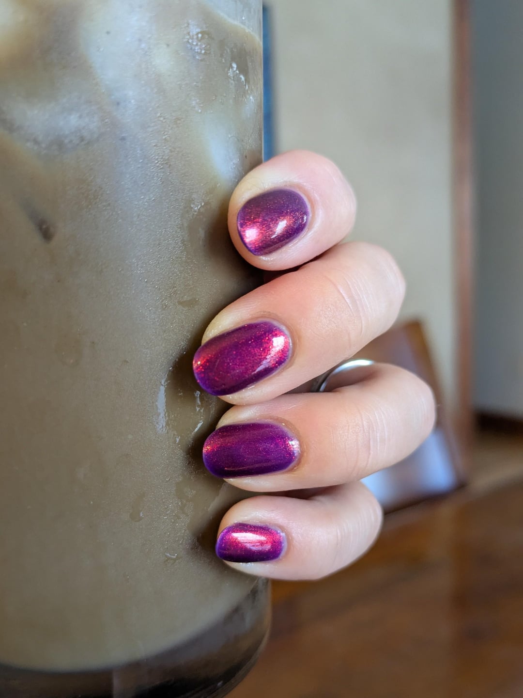 1 coat Morgan Taylor Stick With It, 3 coats Sassy Sauce Cock a Doodle Doom, 1 coat Essie Gel Couture Top Coat
