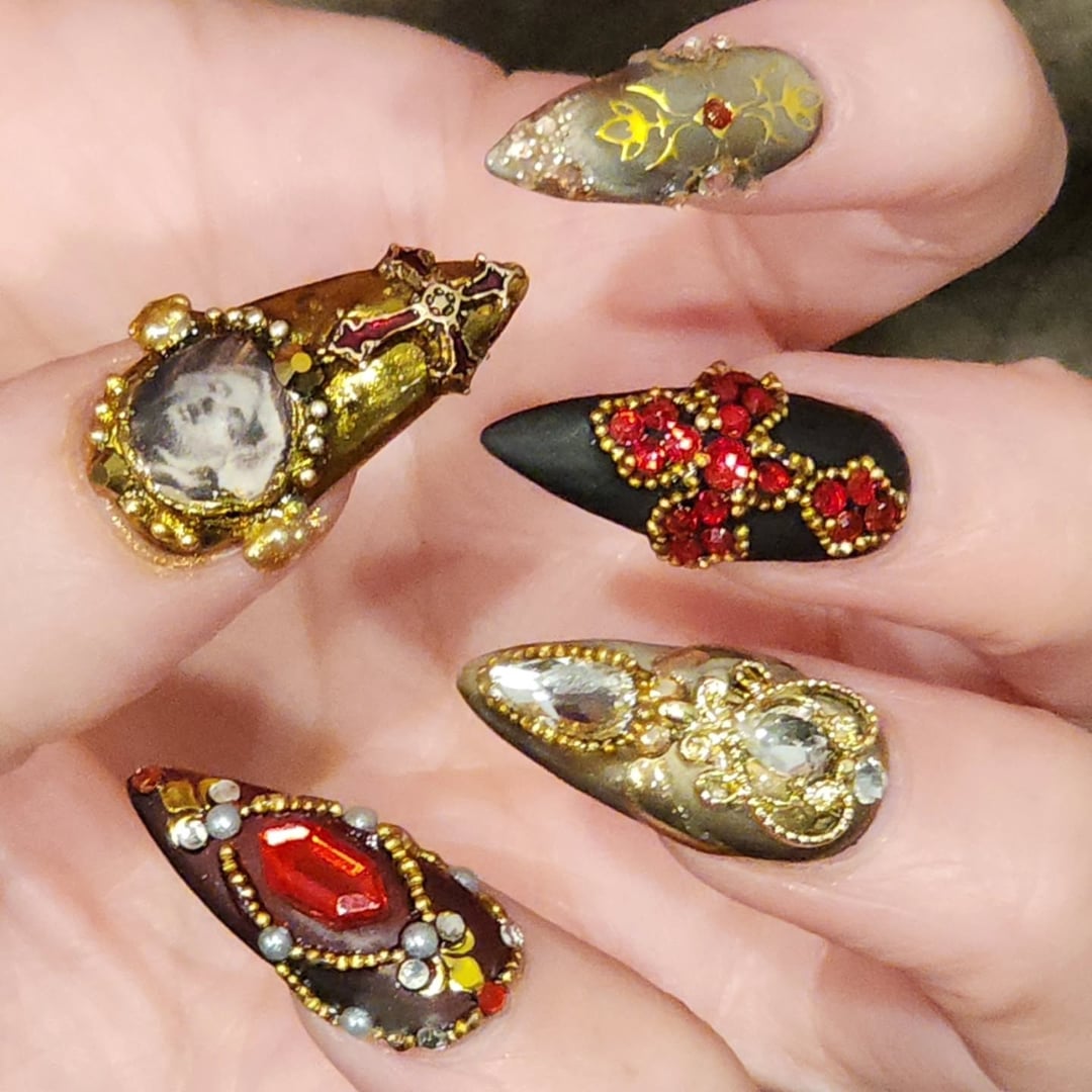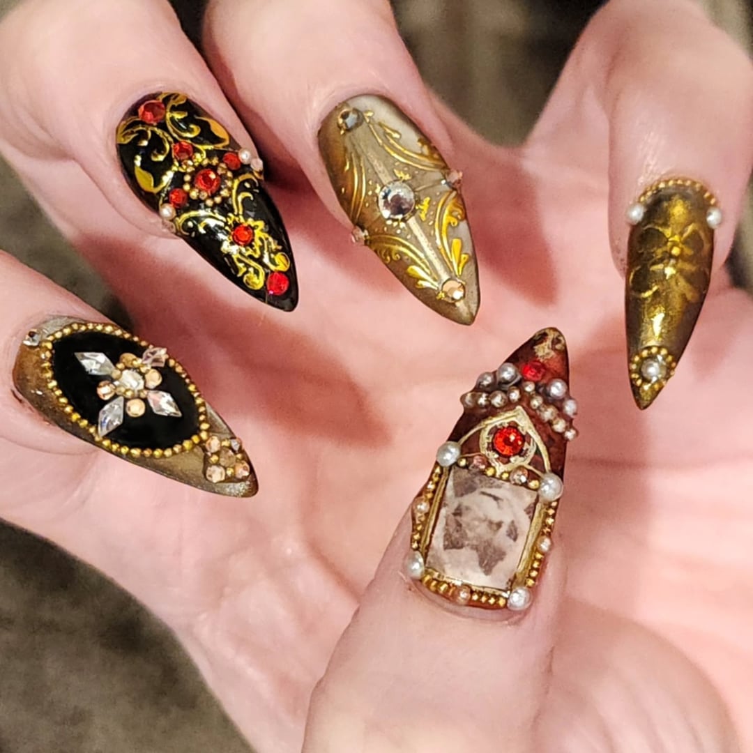 These took me about 12 hours over the course of two days; I placed every tiny little gold ball and gem individually. I also made the stickers (Psyche Revived by Cupid's Kiss & The Ecstasy of Saint Teresa) using my printer and peel-off base coat. My shoulders and back hurt so badly haha but it's worth it to be able to wear these for the next three weeks. Maybe my favorite set I've ever done. I'm so proud of them!