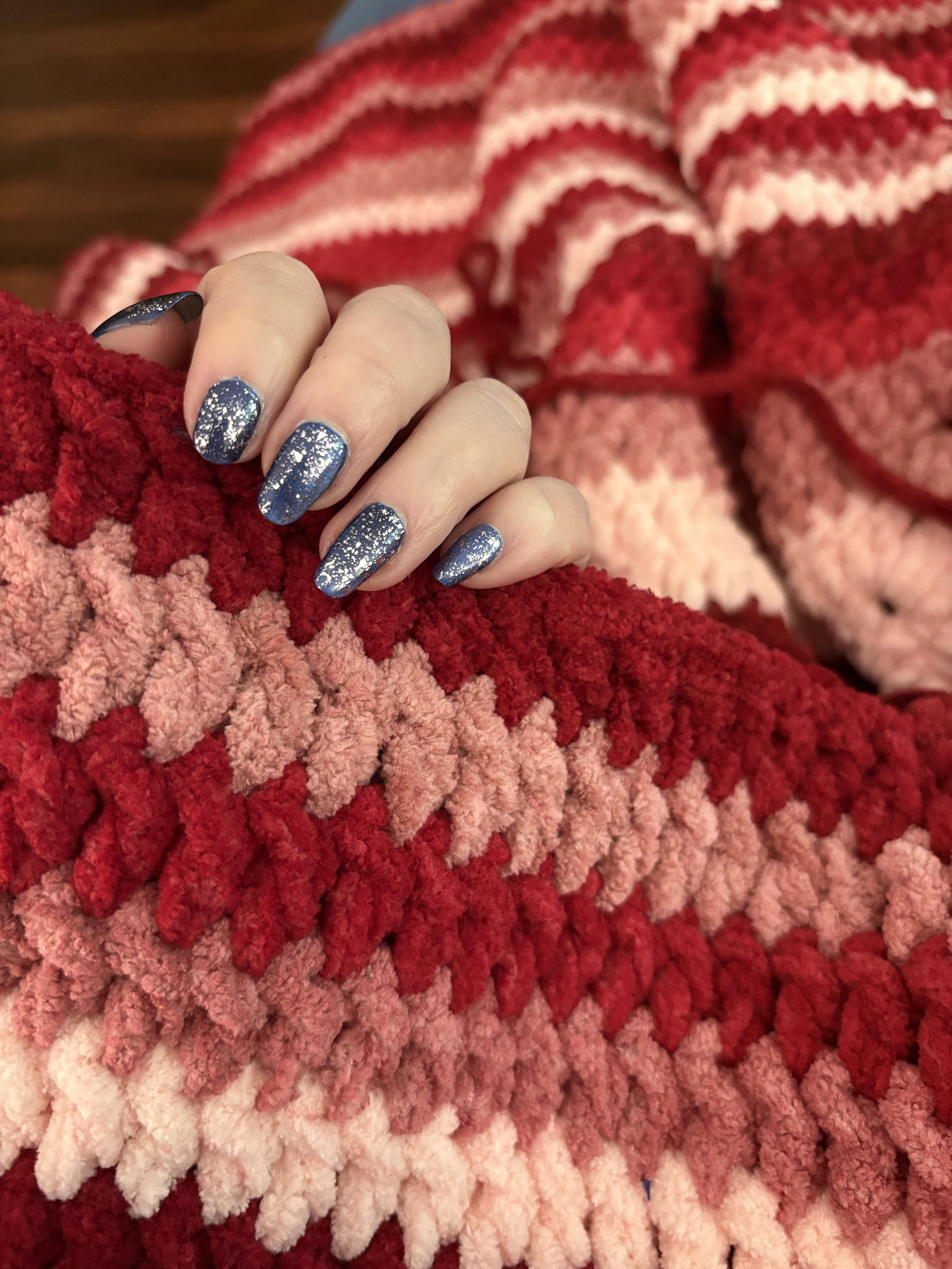 Painted my nails last night. Got too eager (ok hungry) 20 mins after the top coat and tried to snack. Some of my nails looked… less than perfect. I was looking at my nails stressed out thinking about how I’d have to cut into crocheting time to redo them the next day (so many gifts to make for Christmas and I’m running out of time lol). Had the genius thought to throw a topper on and voila! Winter wonderland nails!