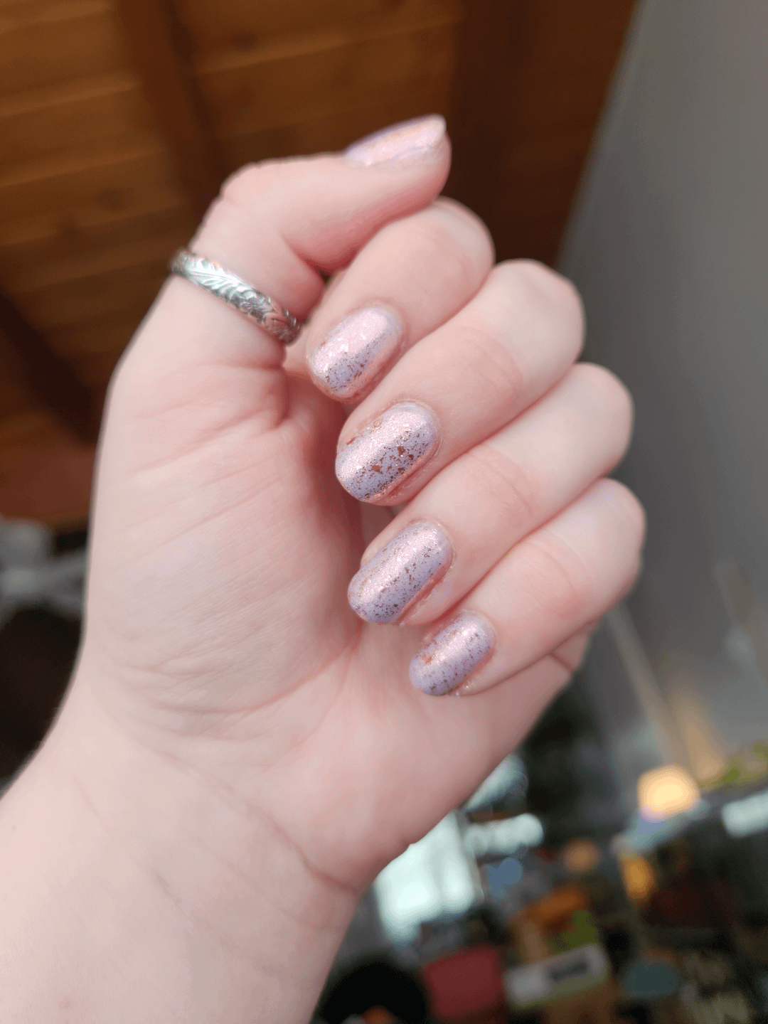 1 coat lights lacquer fill me in base coat, 3 coats lights lacquer wver after, 1 coat holo taco rose gold flakie taco, 1 coat seche vive top coat