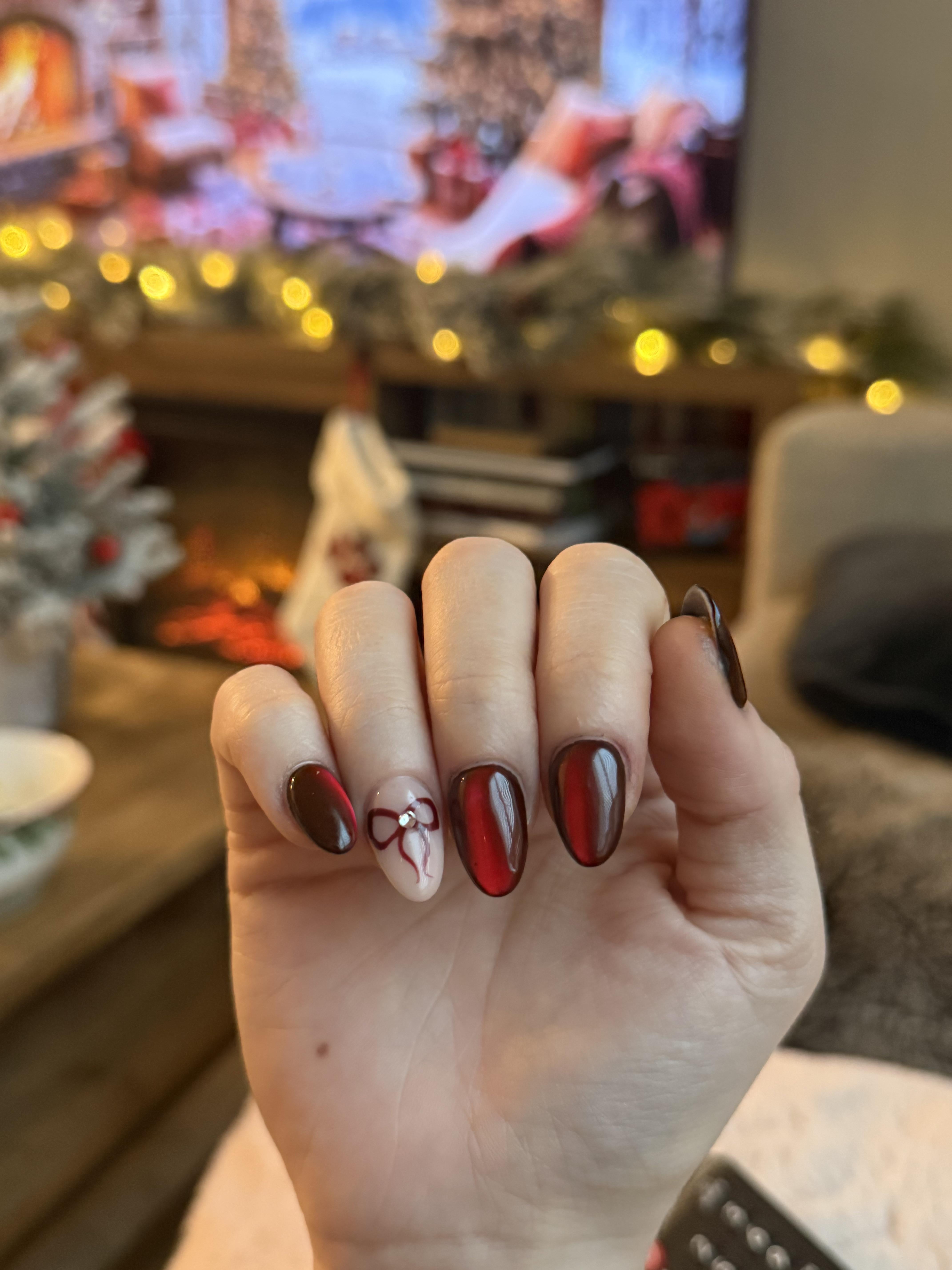 Black dip base, silver velvet (cat eye), red jelly coat