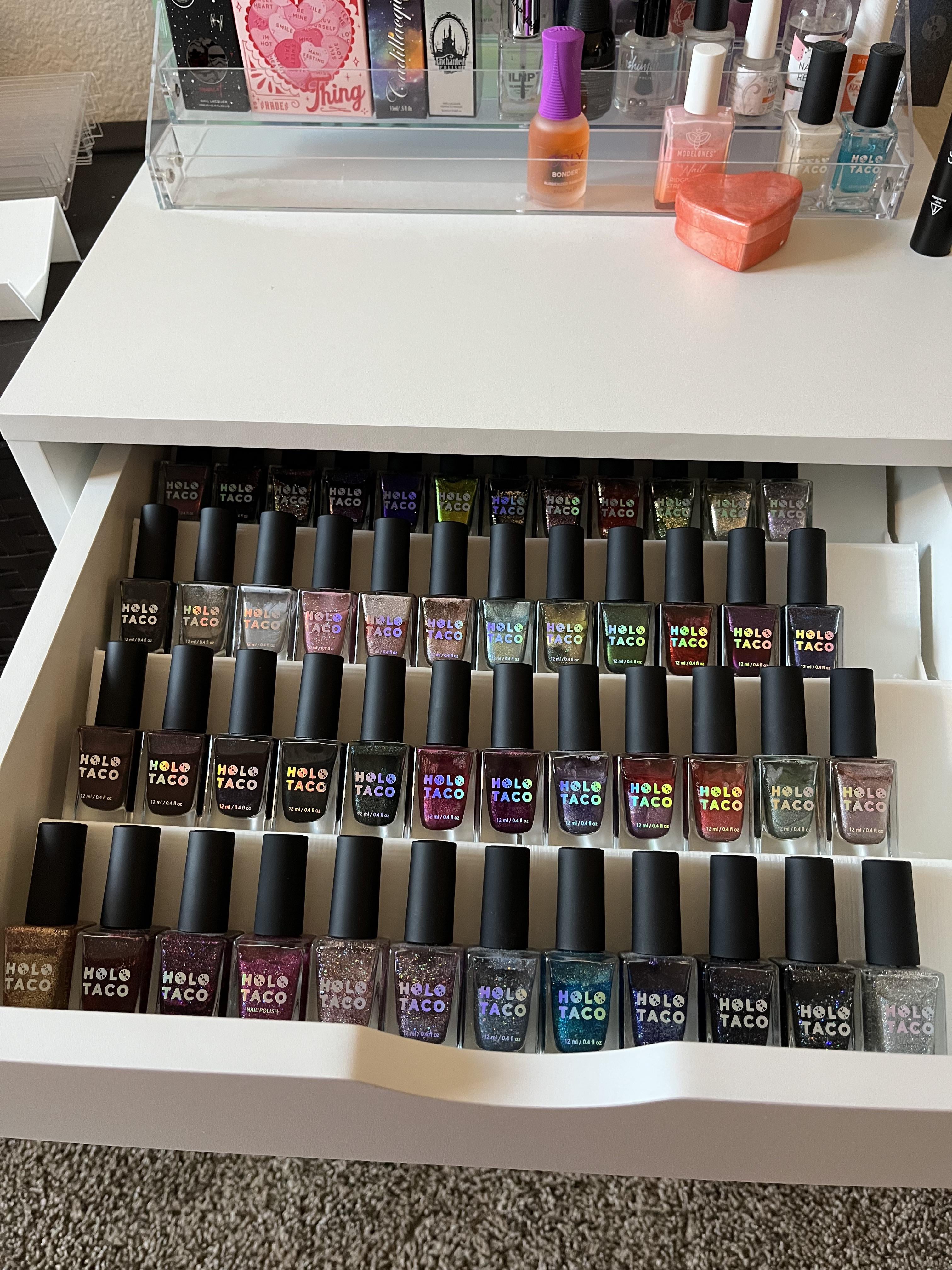 I have 4 pretty full drawers of polish organized by brand, finish, and color. I love the way they’re organized BUT I am moving and I have always been curious about putting them in rainbow order!! Moving presents the perfect opportunity.