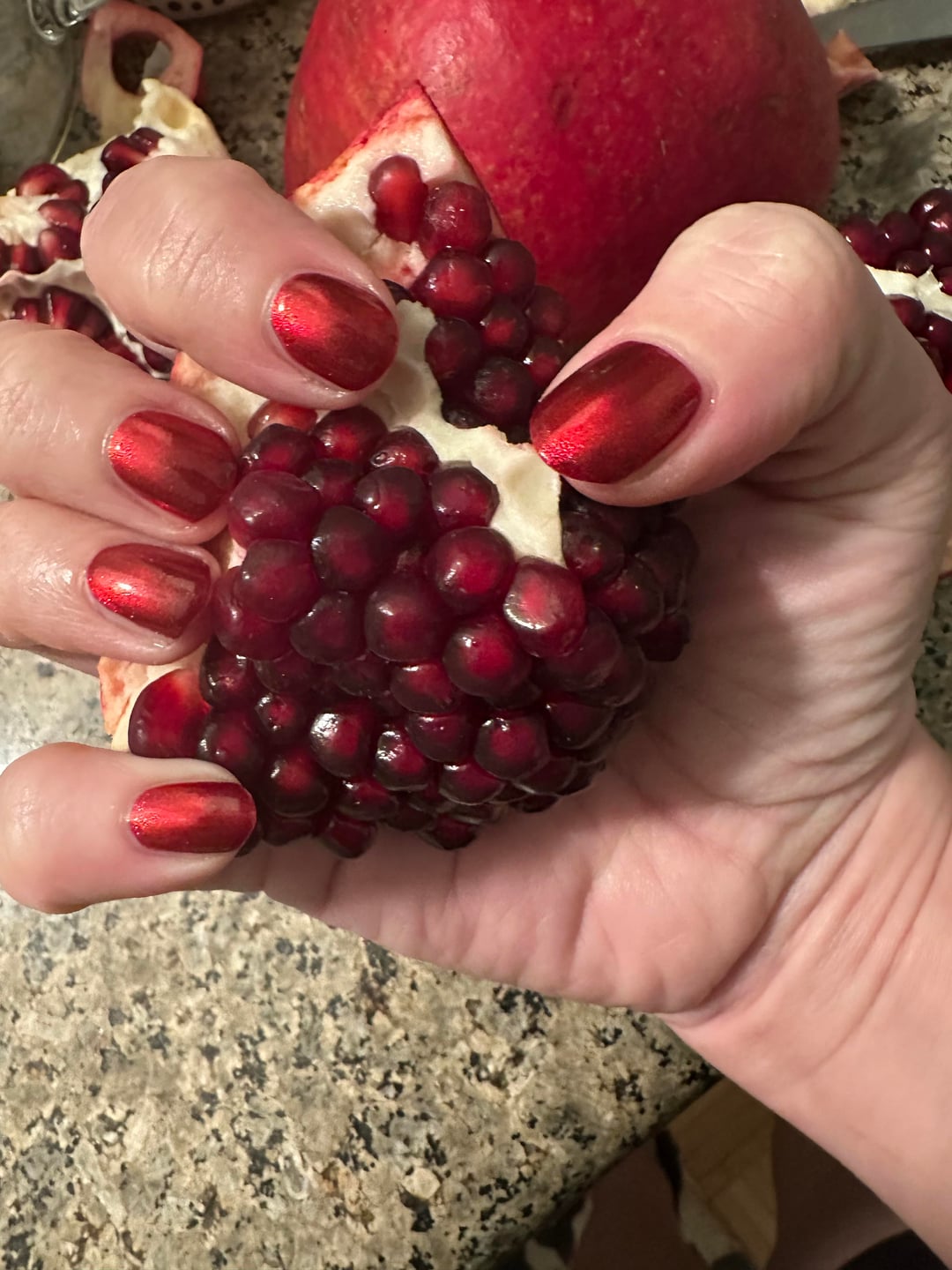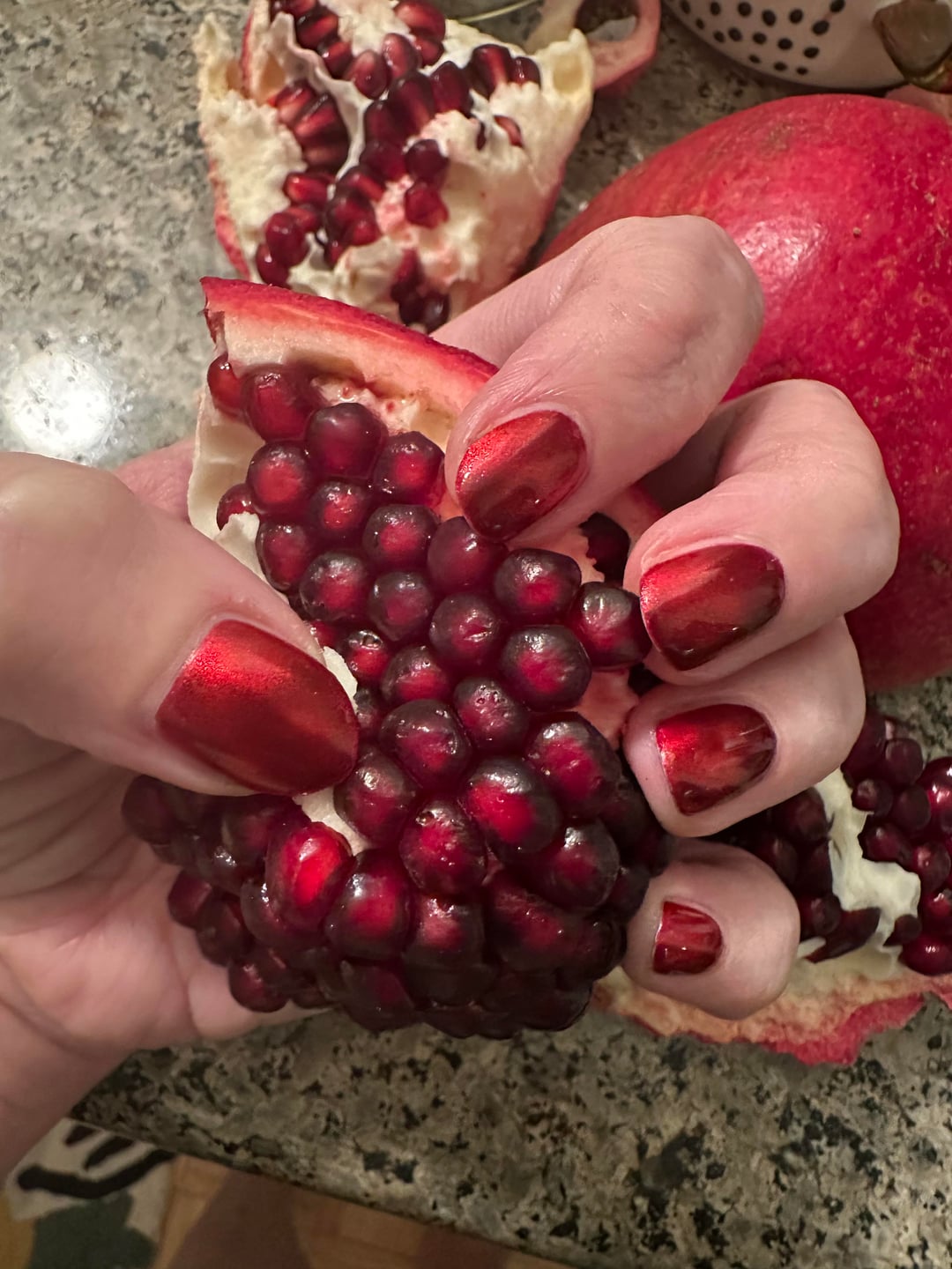 Bees Knees Lacquer Pomegranate Seeds, with a fresh pomegranate.