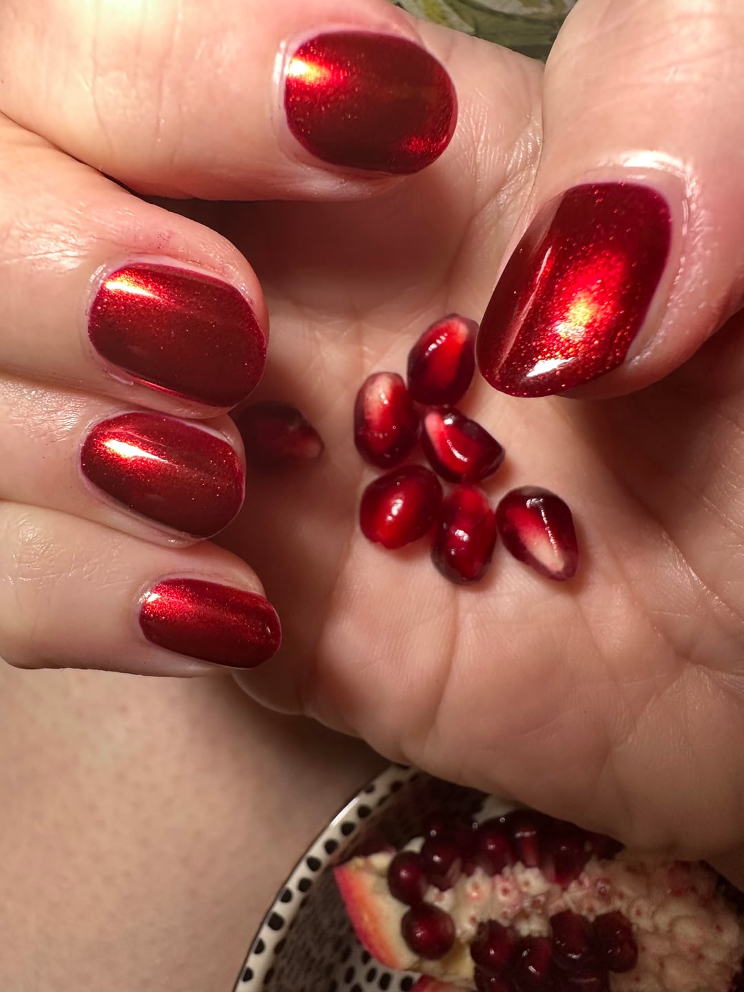 I didn’t care for this polish much when glass bead magnetized with my spinning horseshoe magnet, but it looks pretty different magnetized with the lab stirrer, nail face up. I feel like this method really does give a much more accurate facsimile of pomegranate seeds!