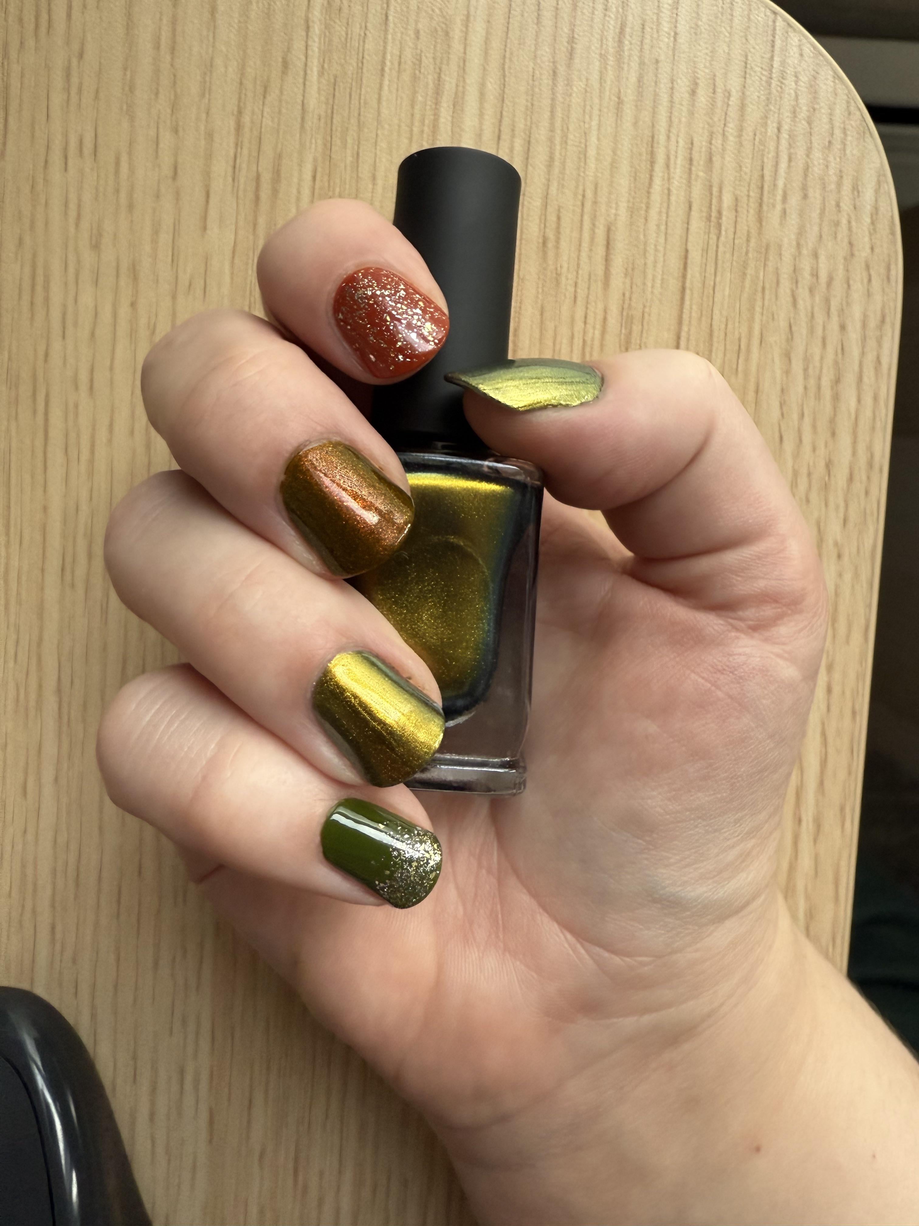 This was my first time ever doing a skittle mani and my first time (I think pretty unsuccessfully lol) attempting to do a glitter gradient. But whatever, it feels festive!