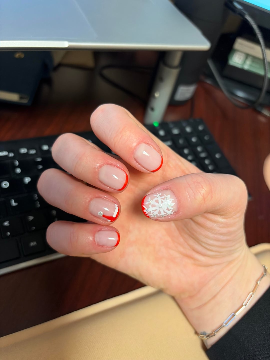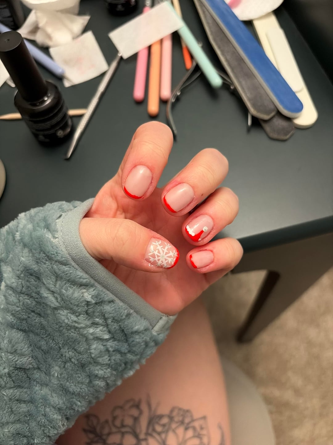 I LOVE how the Santa hats turned out, they’re so! Darn! Cute!! The snowflake on my left thumb came out a lot better, but unless you’re looking closely at the right thumb that snowflake looks fine. I don’t have rhinestones but I think those would’ve been super cute instead of the silver glitter.