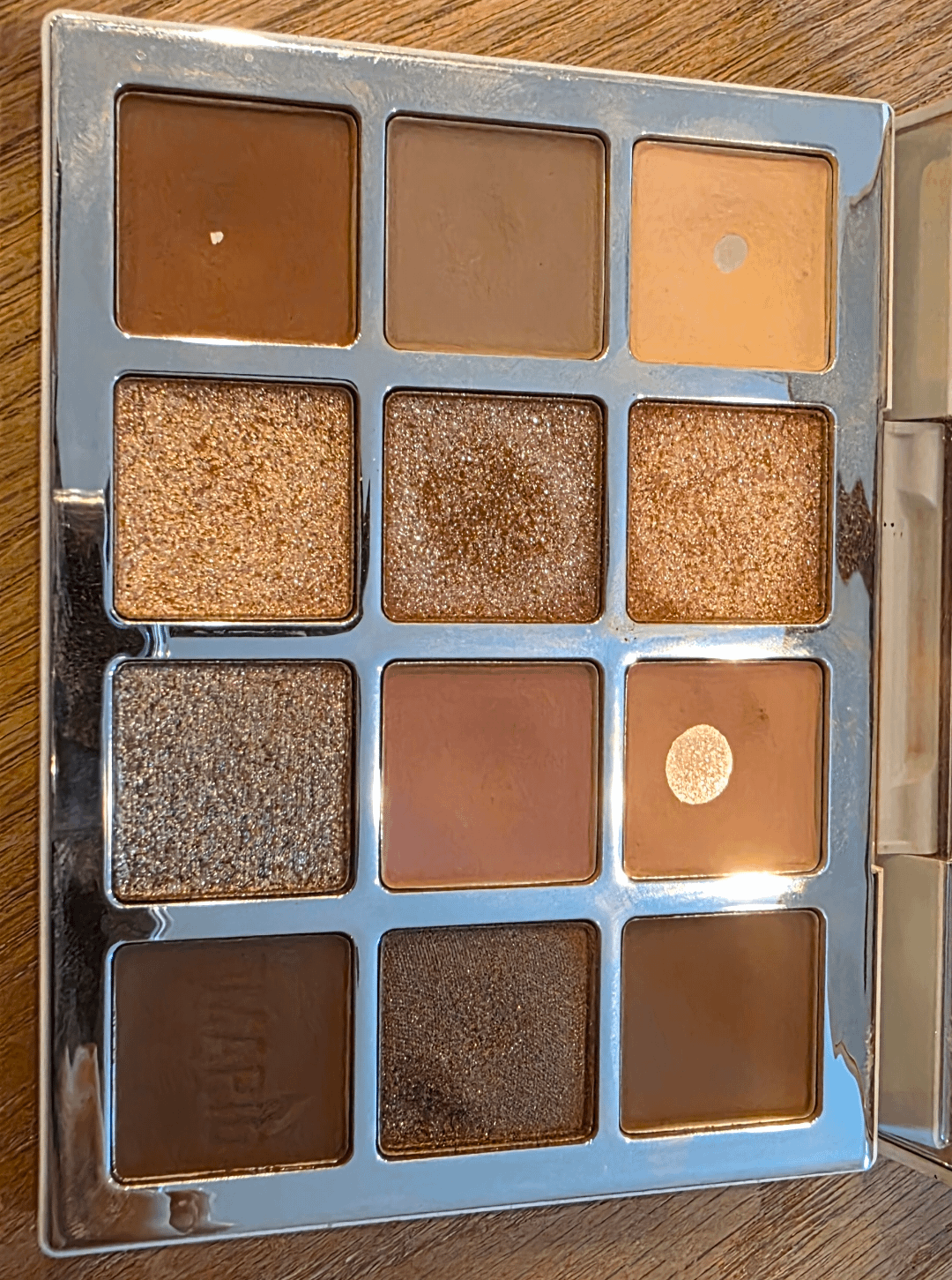 This is a really nice well rounded palette but I won't fully pan. The cooler shades don't suit me and I don't use glitters. Once the mid toned brown (bigger pan, shade EE3) is fully panned this palette becomes pretty hard for me to use.