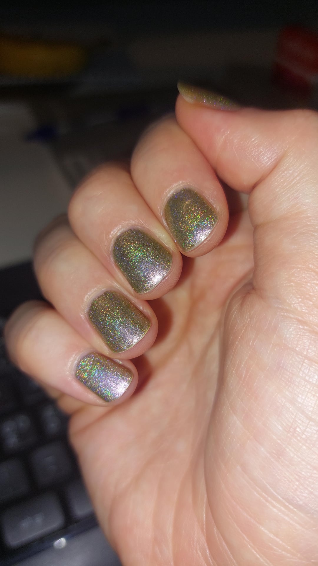 This is two coats of Depend's 2090 from the Chameleon collection of 2013. One coat of FUN lacquers holographic clear polish and one coat seche Vite.