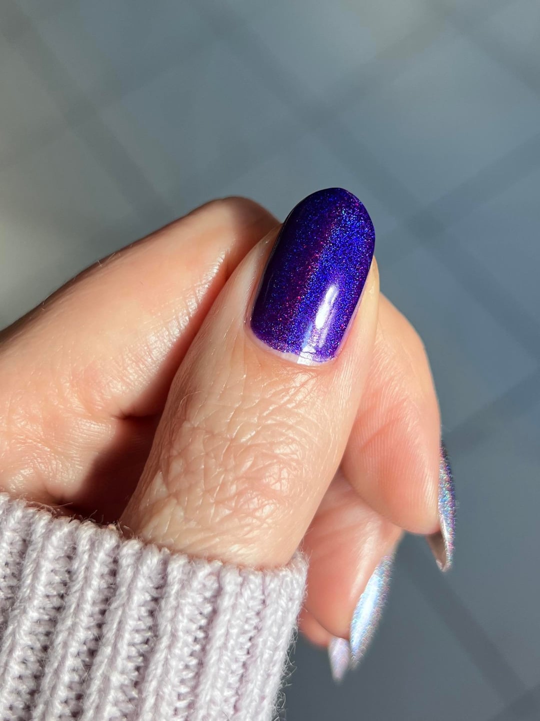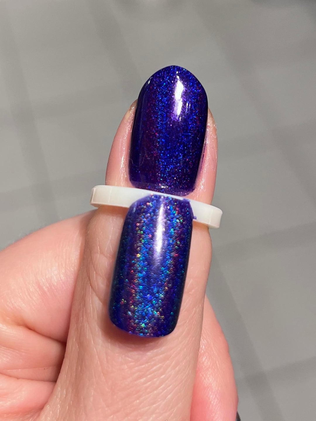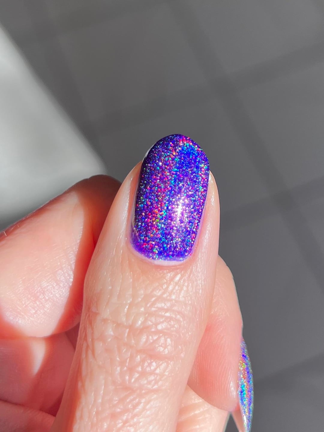I’m vaguely speculating, but aren’t there some purple pigments that tend to bleed into the topcoat? 🤔 That might explain why this holo polish got dulled by the topcoat whereas the other holos were not affected.