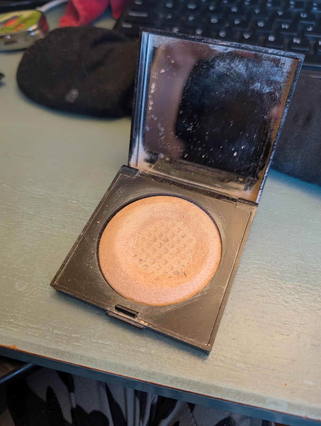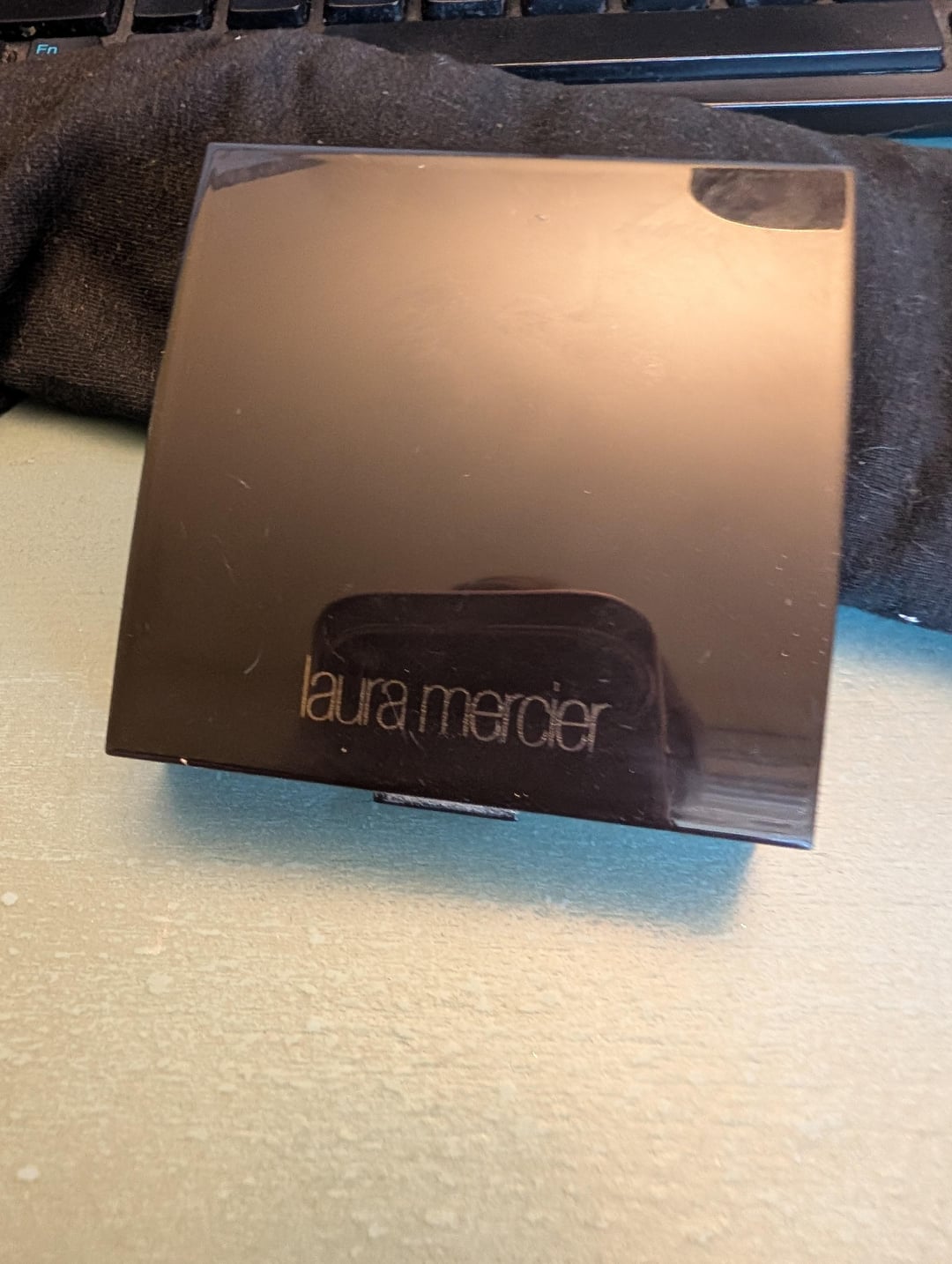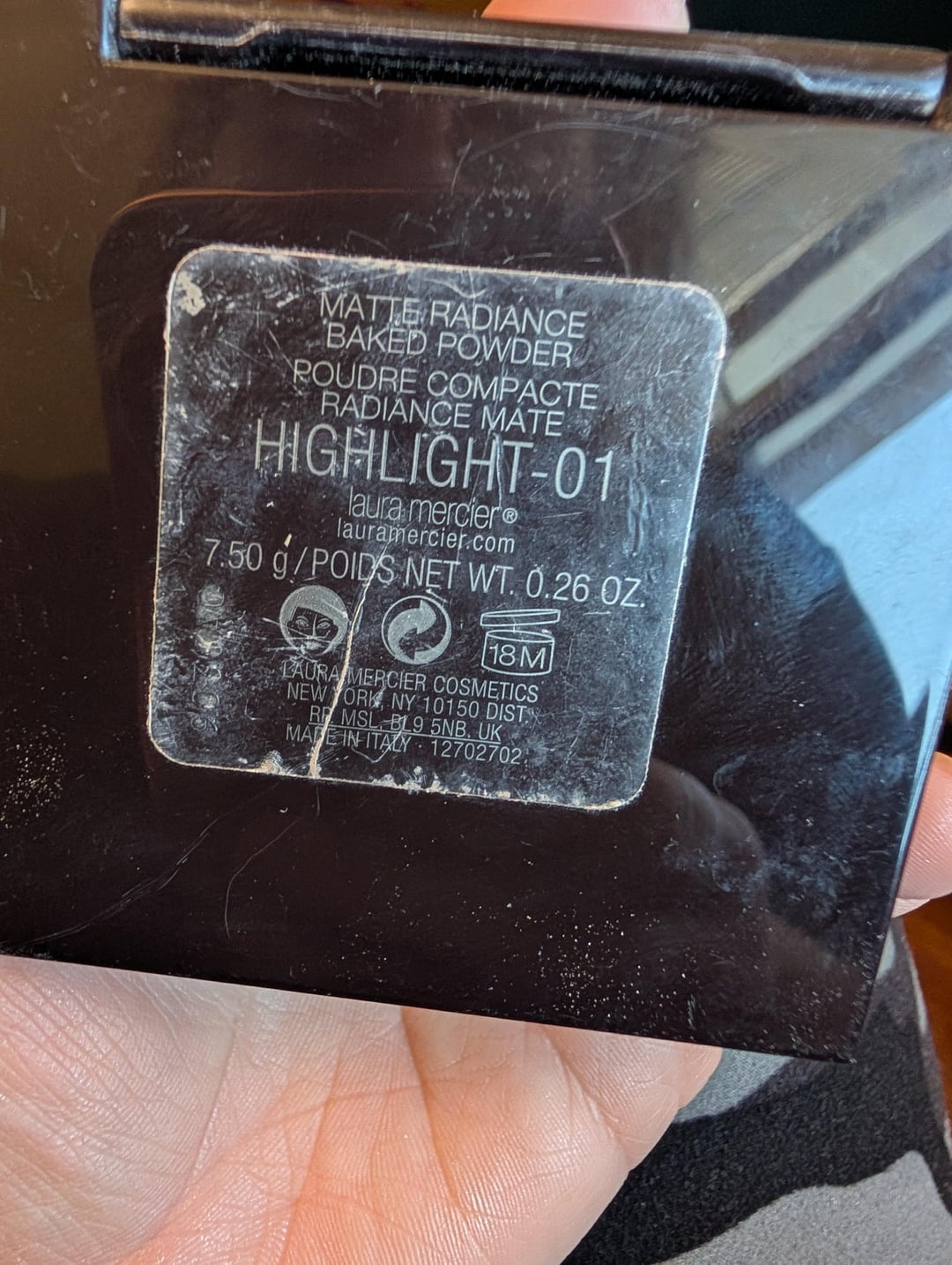 Laura mercier matte radiance baked powder in shade highlight 01. Pan in progress. This is a perfect highlight for me (moderately pale with neutral undertones). I use this on my brow bone most days I do makeup. It brightens up my eyes without looking glittery. I picked up at marshalls and I would rebuy at a discount again. Not full price. But there is significant product so 👍👍