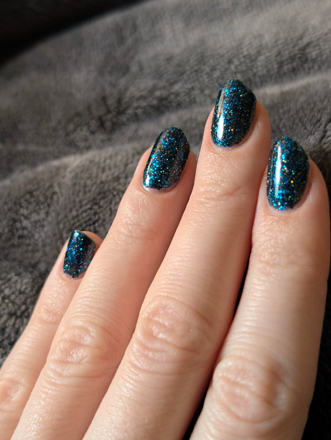 It's a deep vibrant teal glitter in a black jelly base with small holo glitters in it.
