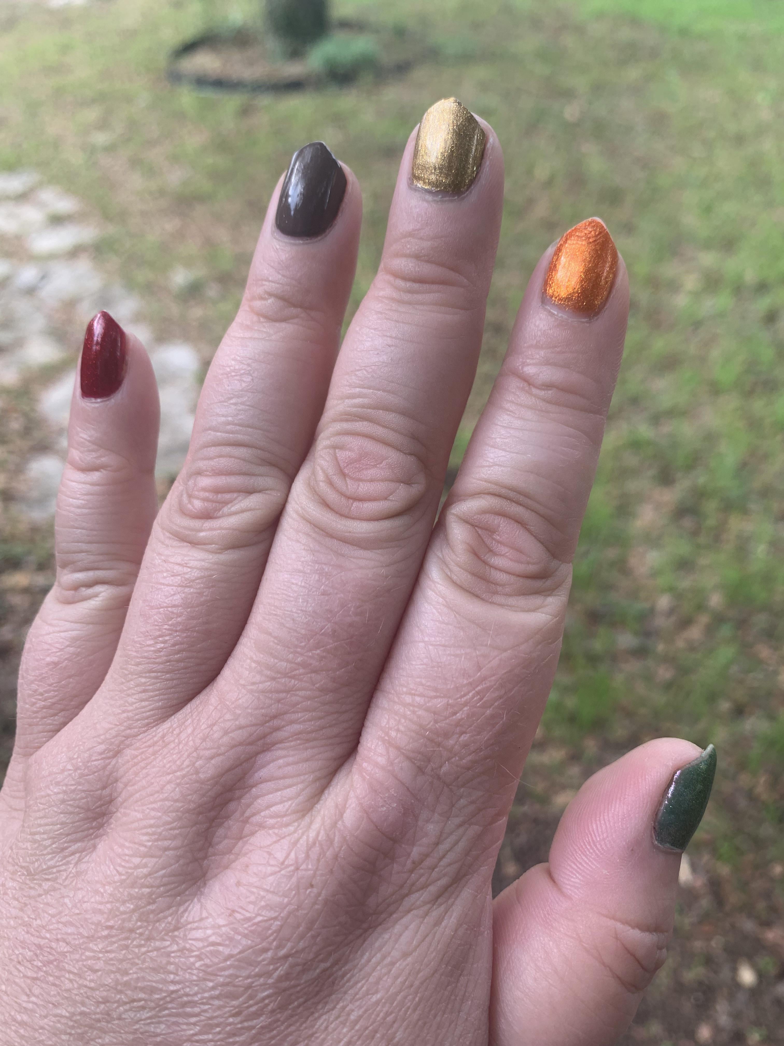 My Thanksgiving manicure gave big hand-turkey vibes and I miss it! I also miss my cute pointy nails, but two unfortunately broke and Iām going to try strengthening my nails before I try shaping them again.