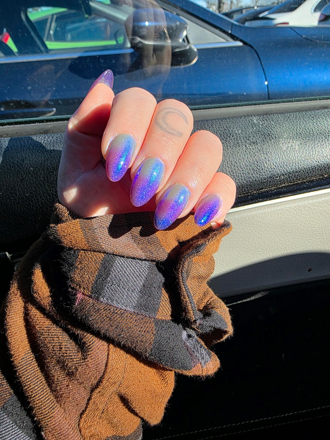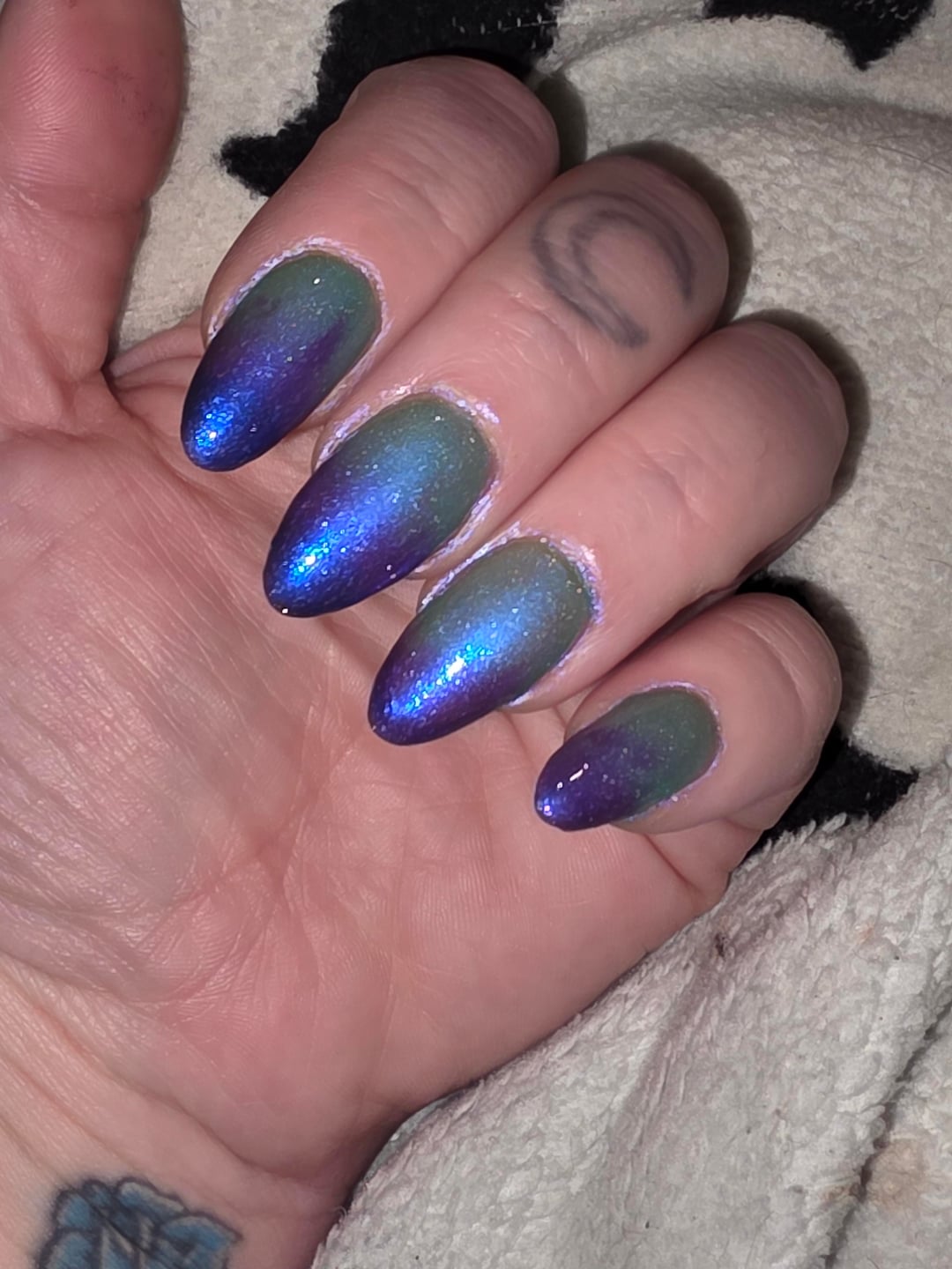 This has blown me away! This is a tri- thermal that goes from a super dark blue-violet, bluple when warm and a bright mint blue when hot. It has a bright blue shimmer throughout, and I'm pretty sure there's also some micro scattered holo and and blue/purple micro flakes which add to the bright blue shimmer. The site describes it as an aura shimmer and I couldn't agree more. My pre-cleanup from last night shows the cold state very well.