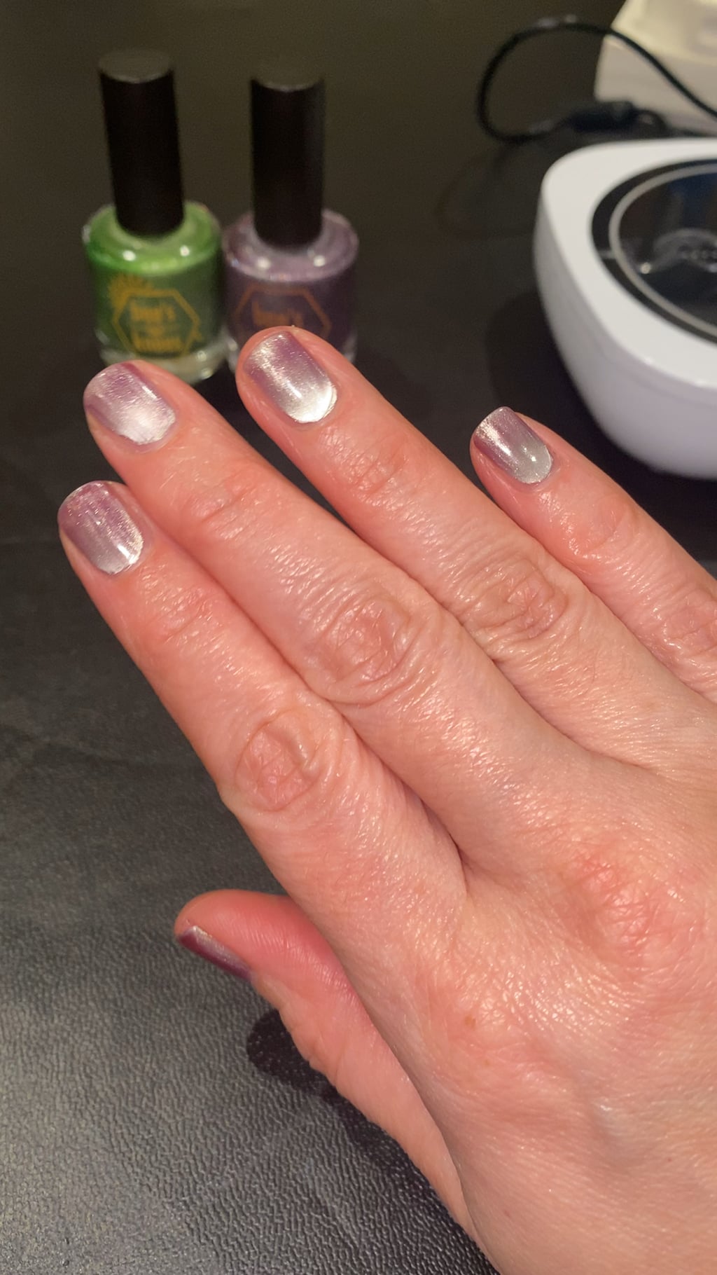 This is a lot more subtle than swatches I saw before I bought it, in some instances it looked almost black, whilst this is a very pretty soft purple. Is there something wrong with my product or are we using a dark base under it? 🤔