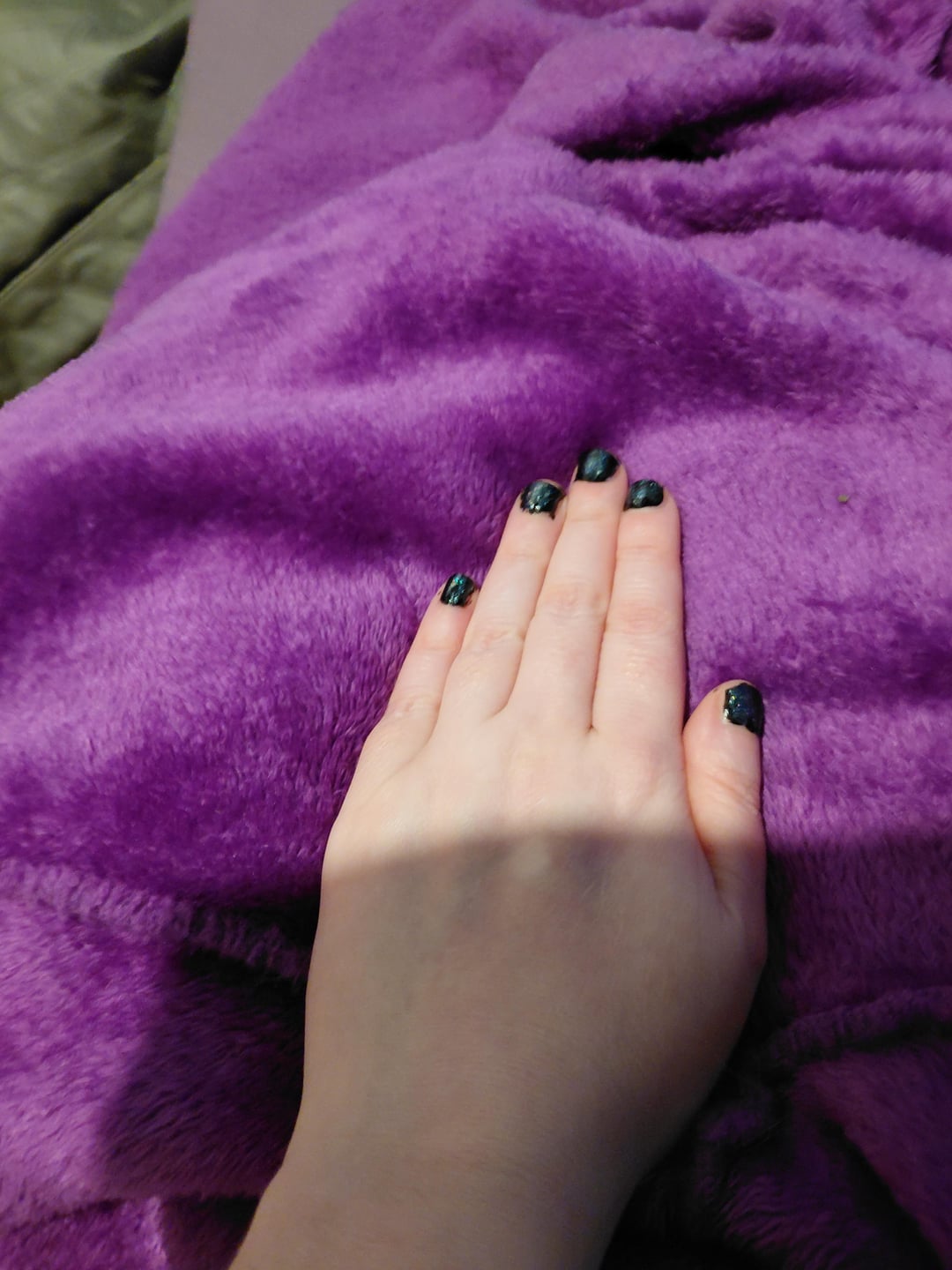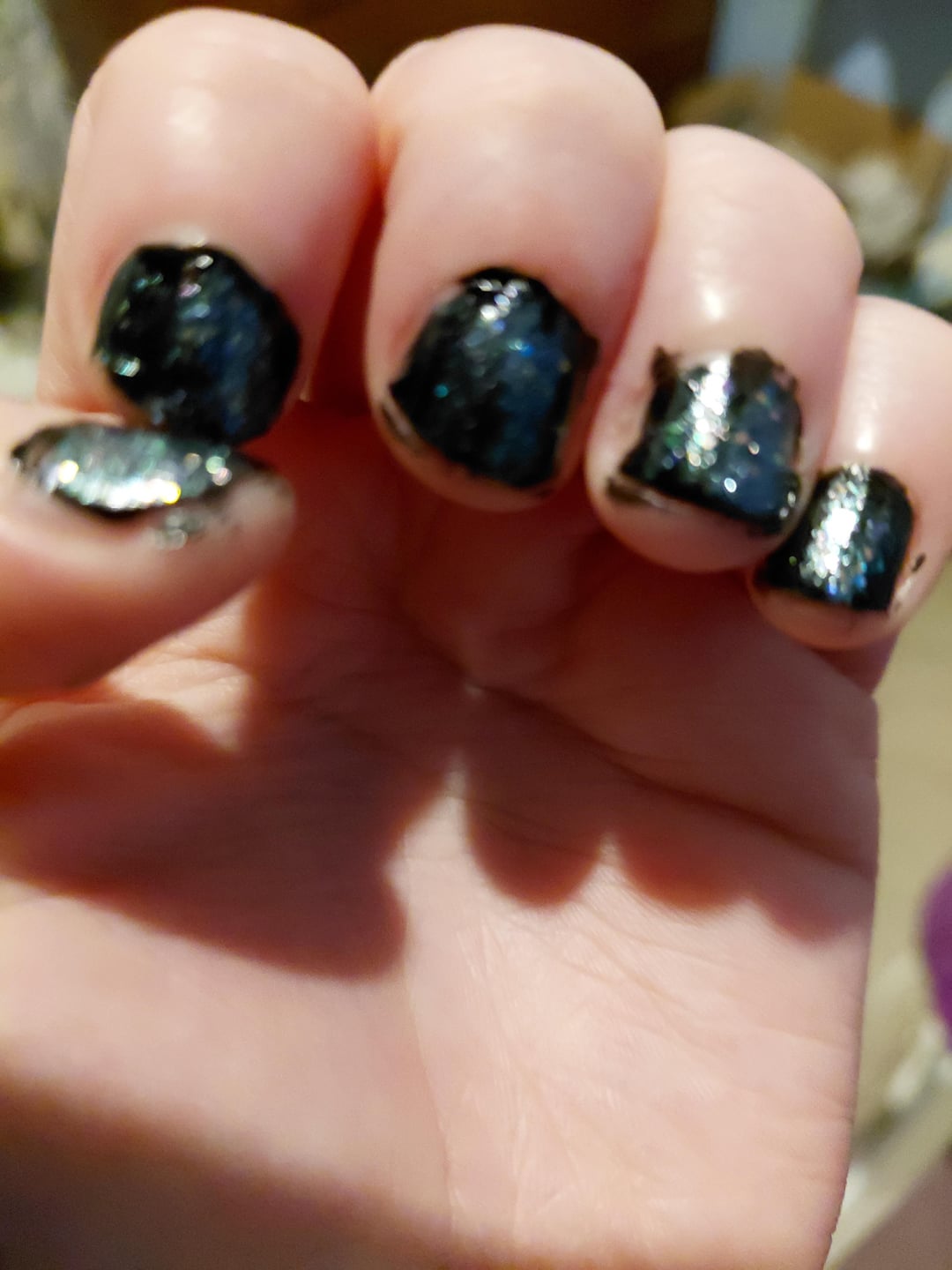 As I recently got some black and white nail varnish, I decided to try out the black, and I remembered I have some white glitter nail varnish, so I thought "Why not use the black as a base and apply the white glitter on top?"