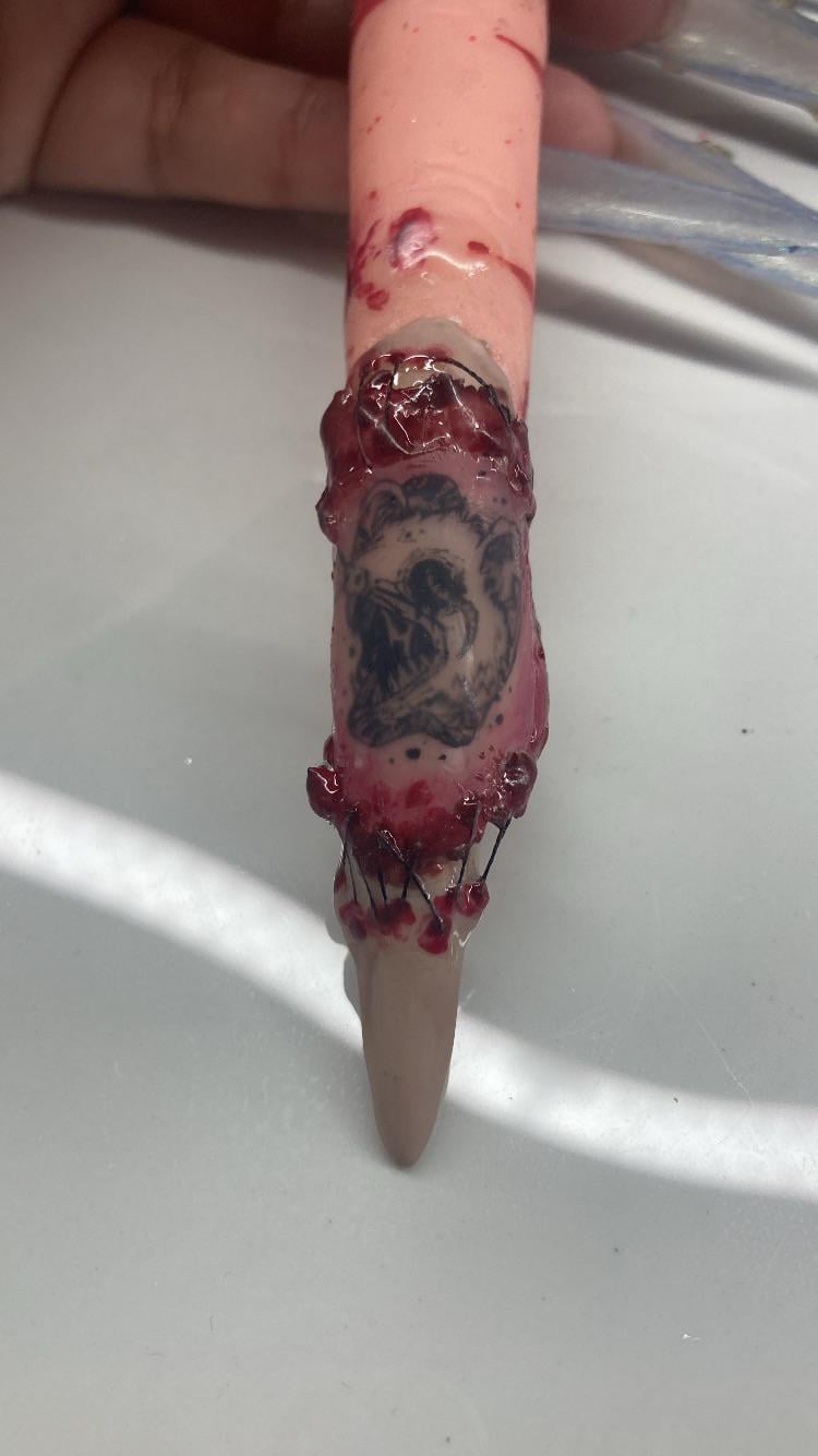 I had an appointment with my tattoo artist a few days ago and she also is into the horror aesthetic so I decided to make her a keychain of a fake finger. I kind of went with an Ed Gein inspo for the nail art and make it look like someone cut out a piece of skin with a tattoo and sewed it into their own skin. The tattoo itself is a possum and a flash design from my artist. The back of the nail also has an NFC tag that is programmed to link to her Instagram page.