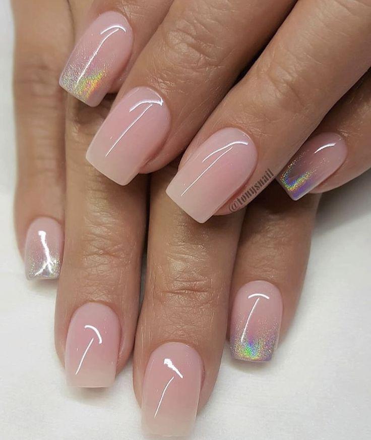 Ask for rainbow tips with ombre holographic chrome powder and specify the pink nails should be gel polish, not acrylic.