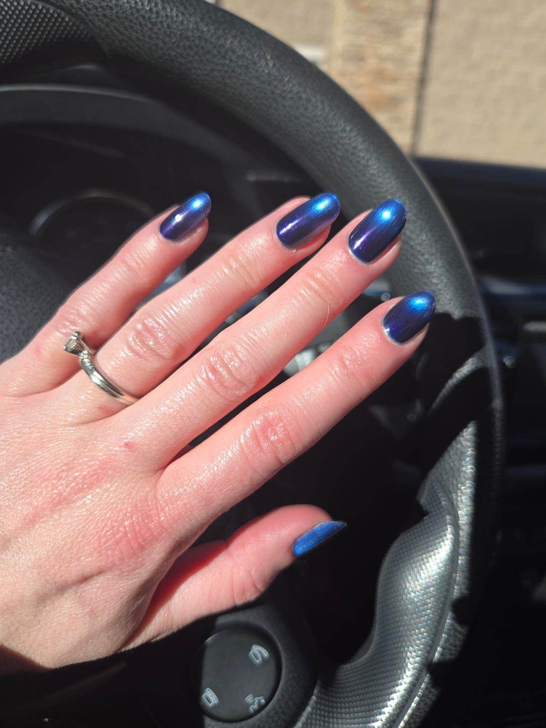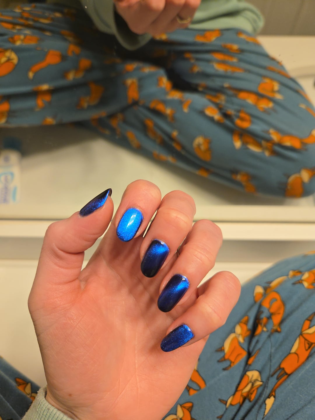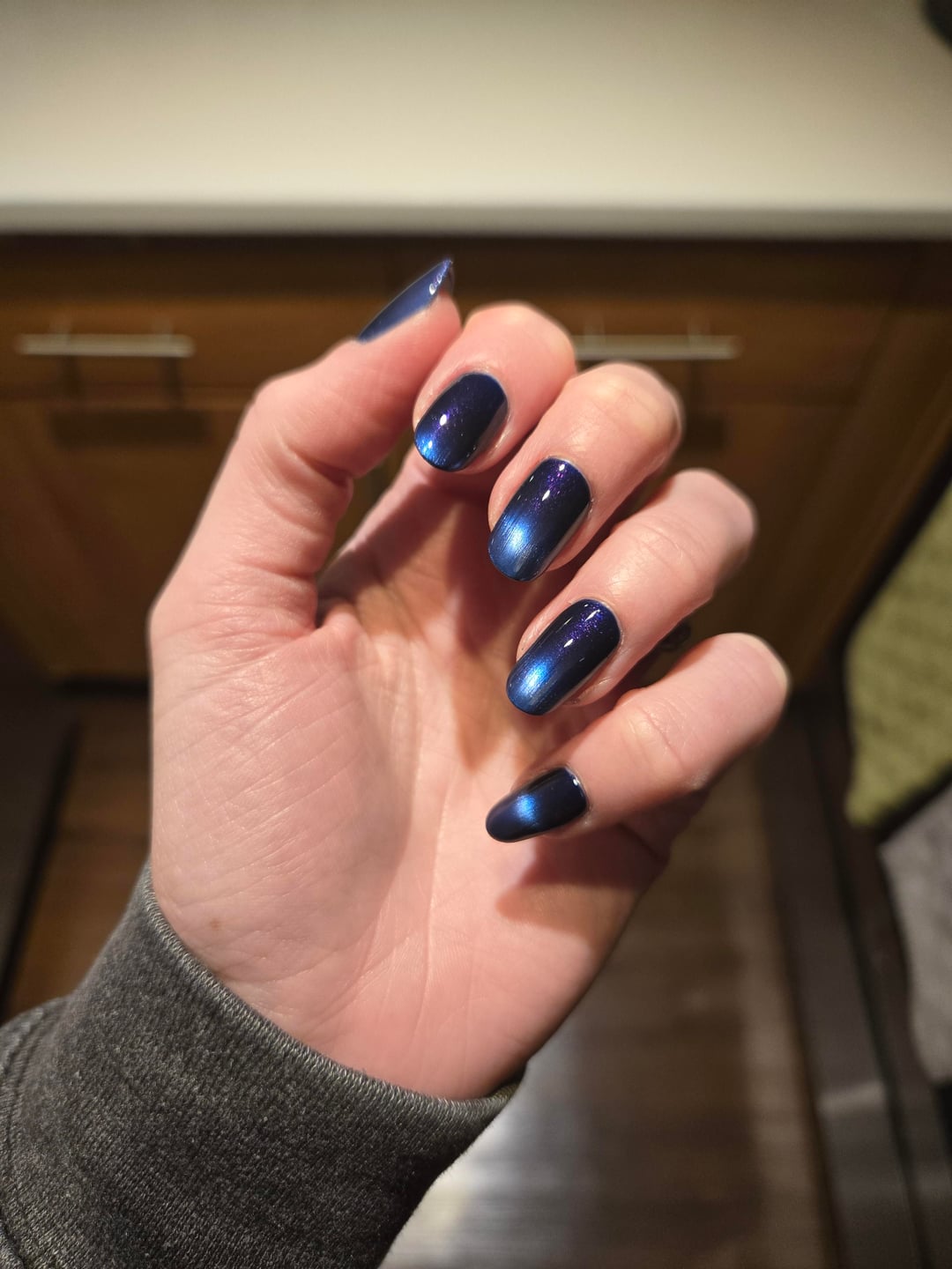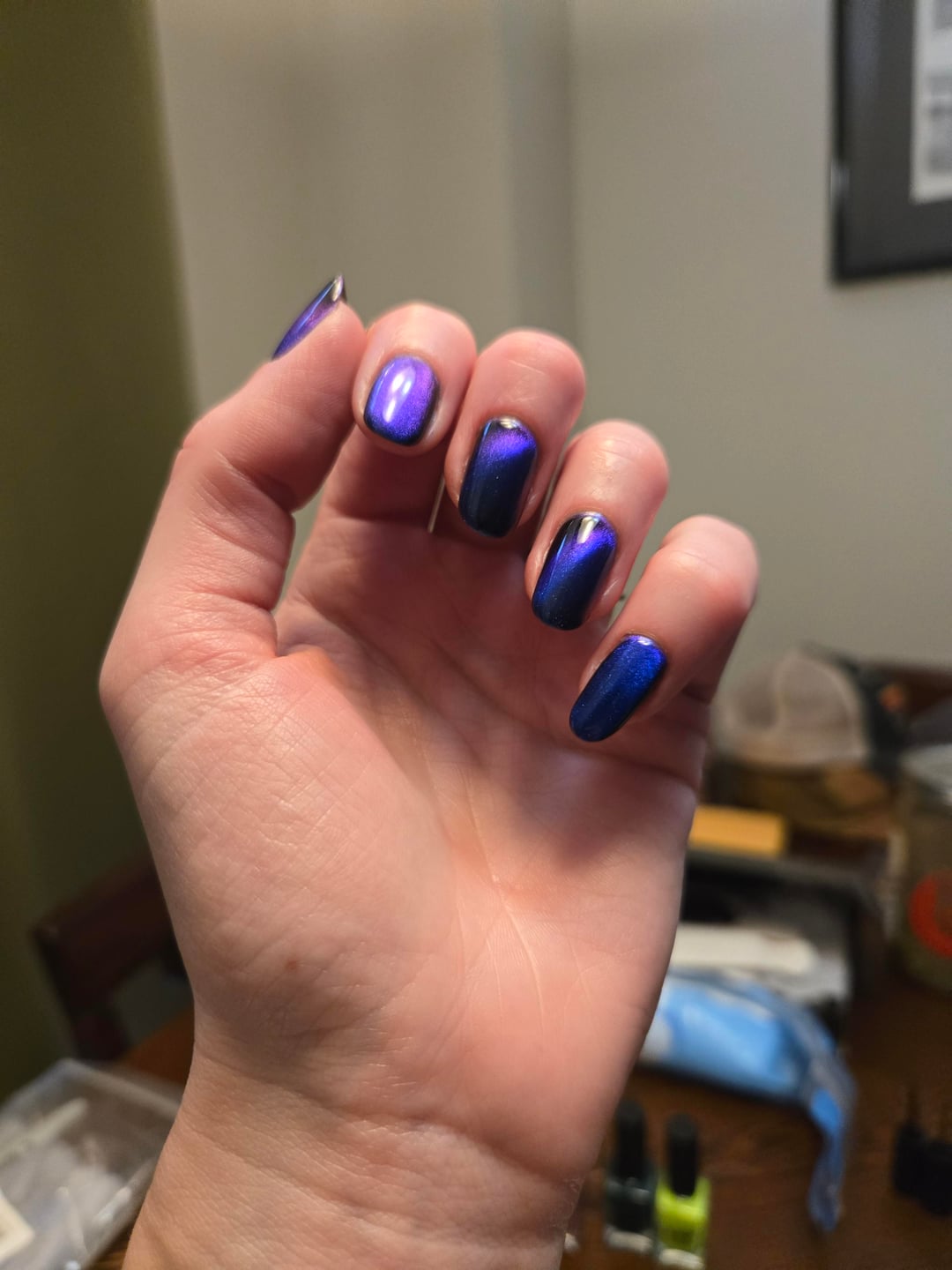8-9: 3 coats of Sassy Sauce Blue Velvet (cat eye on thumb, middle, and ring fingers and velvet on pointer and pinky)