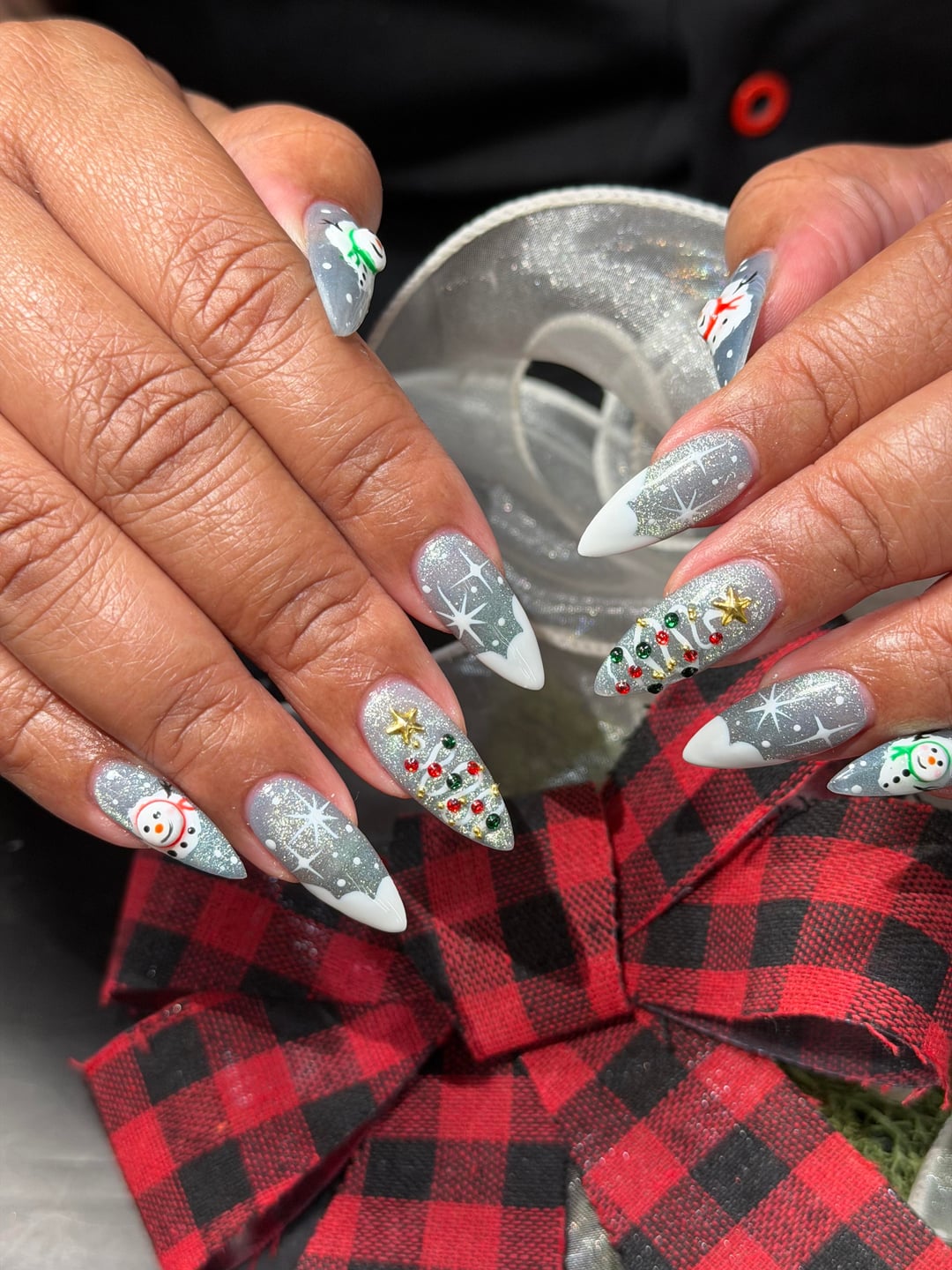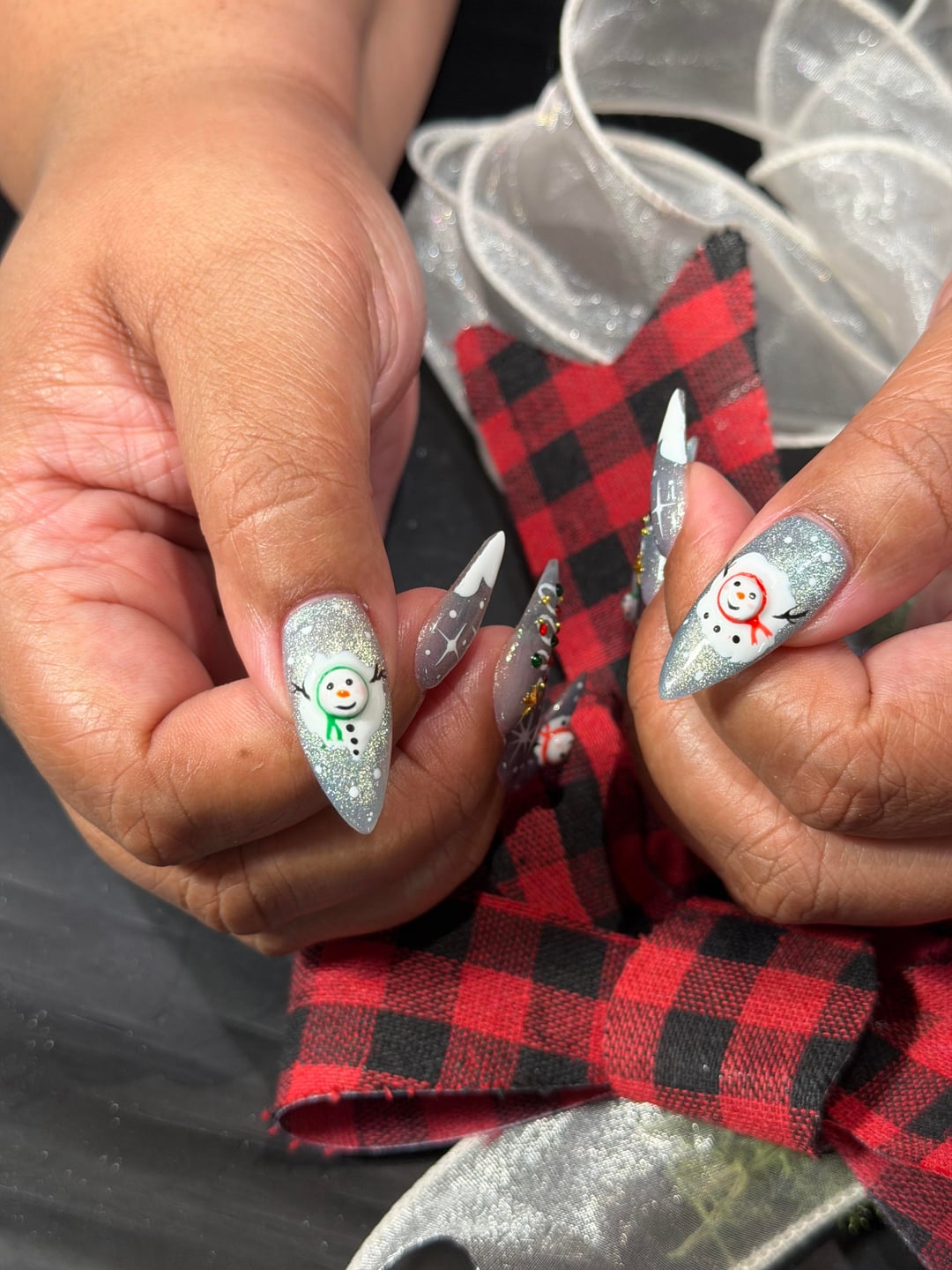 These are done with gel x tips and cat eye polish. The little snowmen heads were did with some whiteish colored sculpting gel and then painted over white. by anonnynonny123