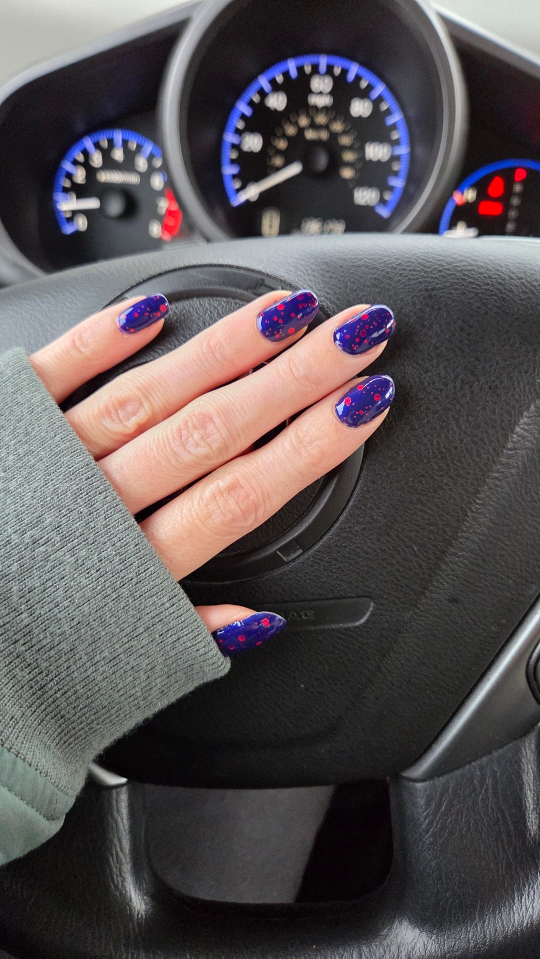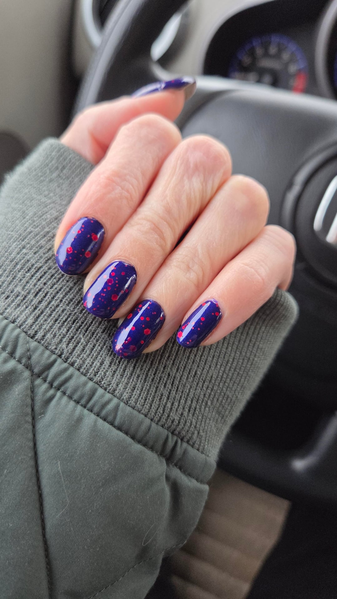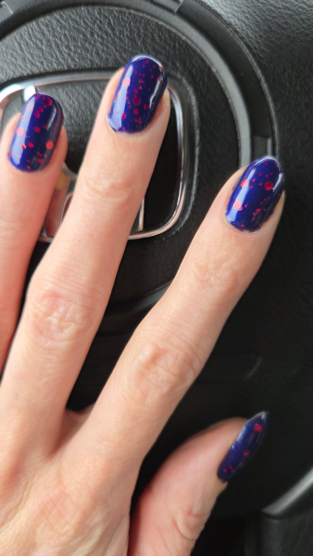 My first Swamp Gloss purchase (I Am the Alpha and the Beta) and I am in love. (Red hex glitter? Swoon!) The formula was great to work with. Underneath is Mooncat's Twilight Sonata, which isn't my favorite thermal–the blue/purple color shift is just kinda meh for me on its own. But together? I'm truly digging this polish combination. It turned out so juicy and it feels so good to look at! Plus the polish name references Avenue 5, which is a great show. 🙂 The thermal is super subtle under the purple jelly, but I do notice a difference when my hands are warm, and that's fun. I know I'll be reaching for this combo again and again like a favorite song on repeat. 💜❤️💜