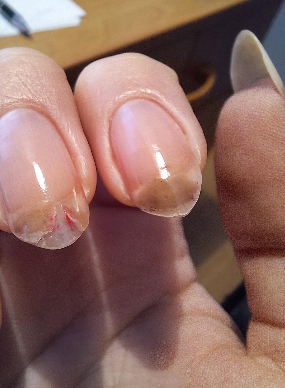 That being said, i think you should cut those nails down because the splitting cannot be repaired and in my experience they’ll continue to split from the existing damage.