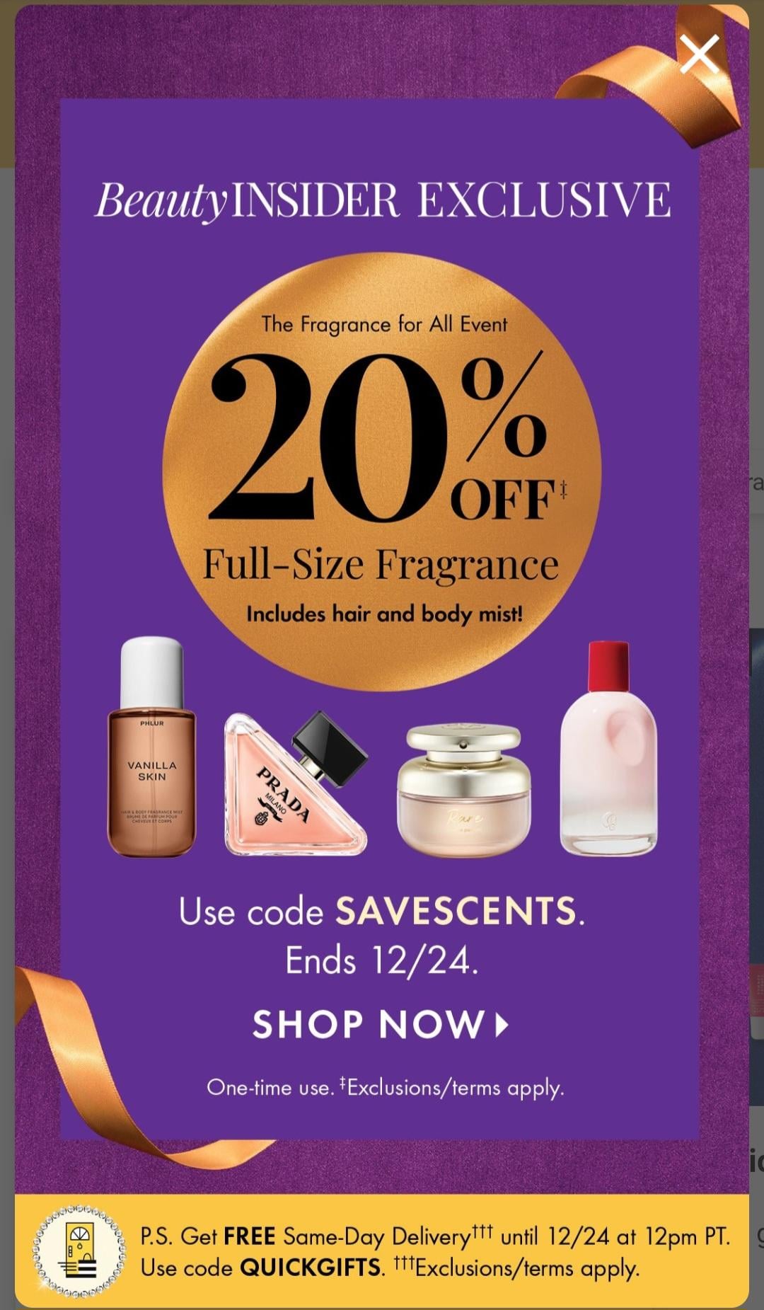Some exclusions apply. Use code at checkout for discount. For free same-day delivery, log into your Beauty Insider account and move all items to your same-day delivery basket using the "Get It Sooner" option in the cart. Discount and shipping codes are stackable.
