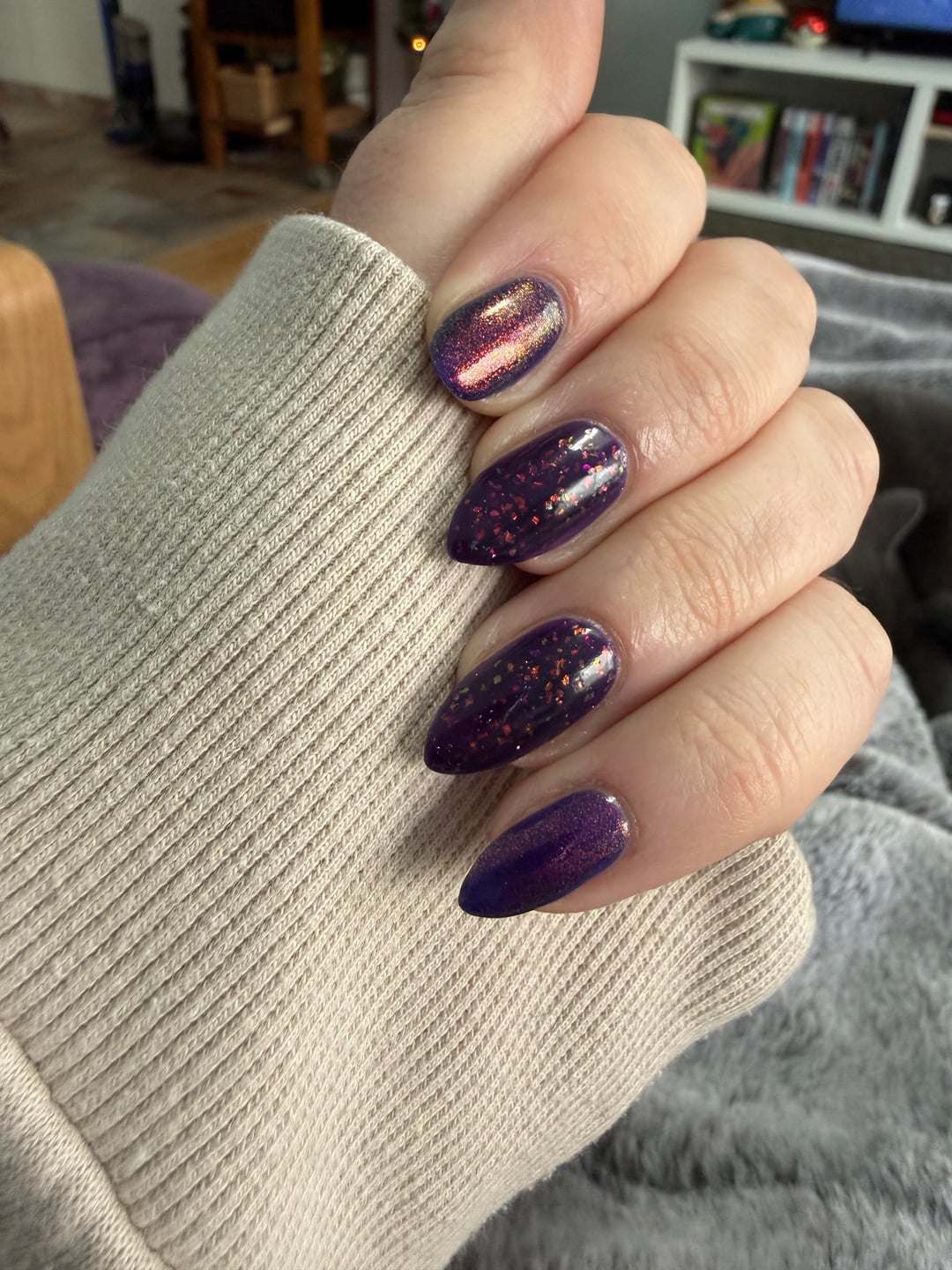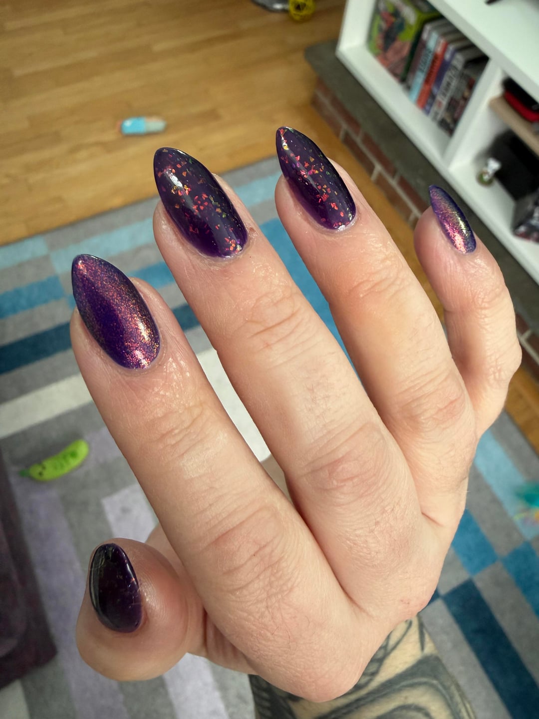 just had to do a mani in my favorite color (purple) with two of my newest polishes (from my humble 4-bottle BF haul) ILNP jinx & hallucinate; KBShimmer fillin’ groovy & clearly on top by bigfatcoffeeslut