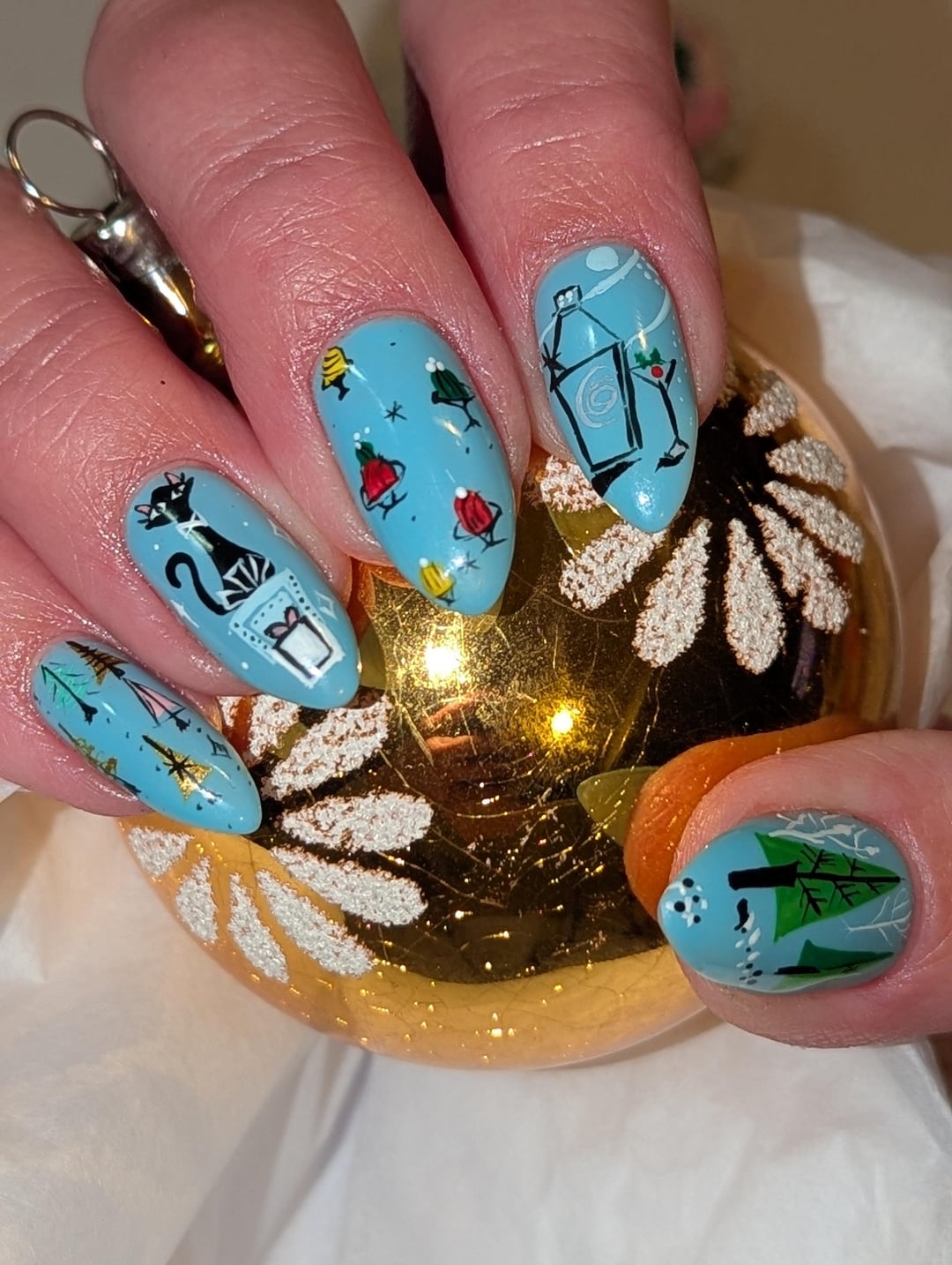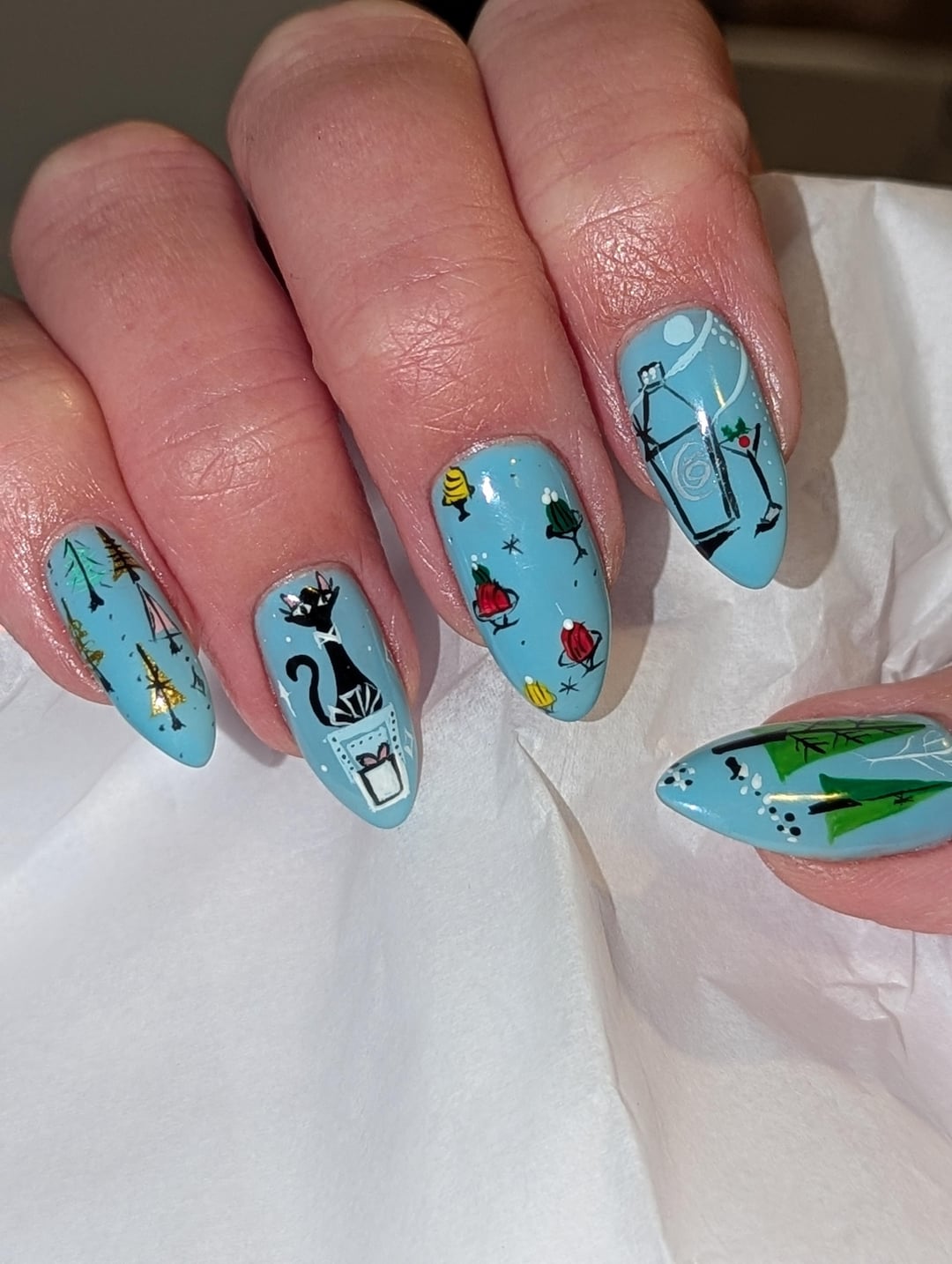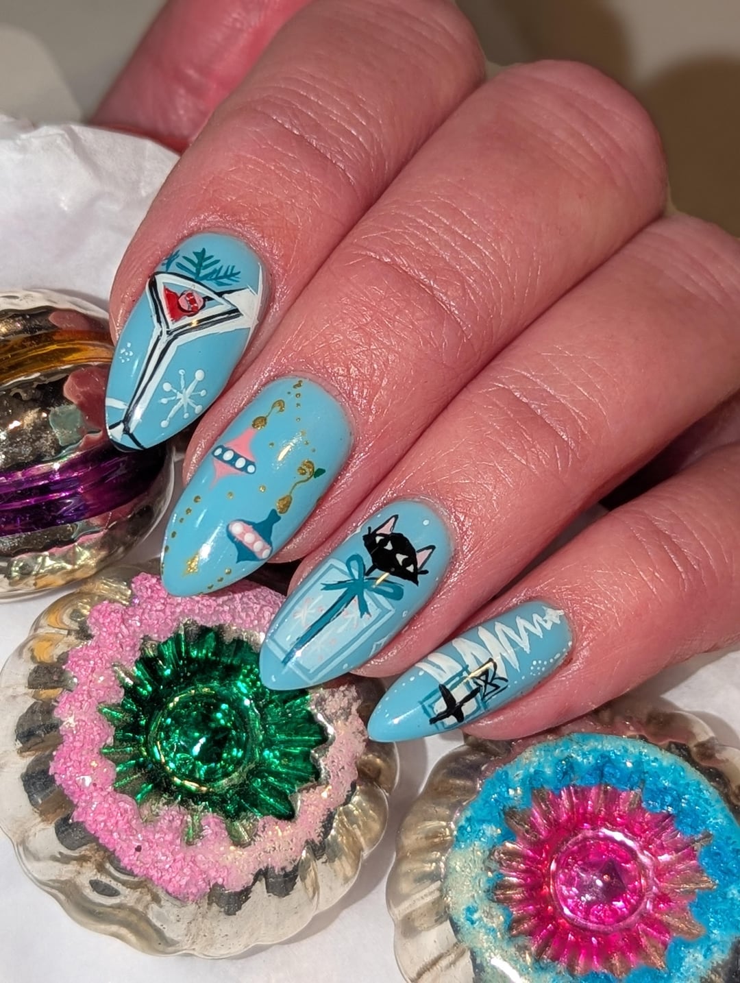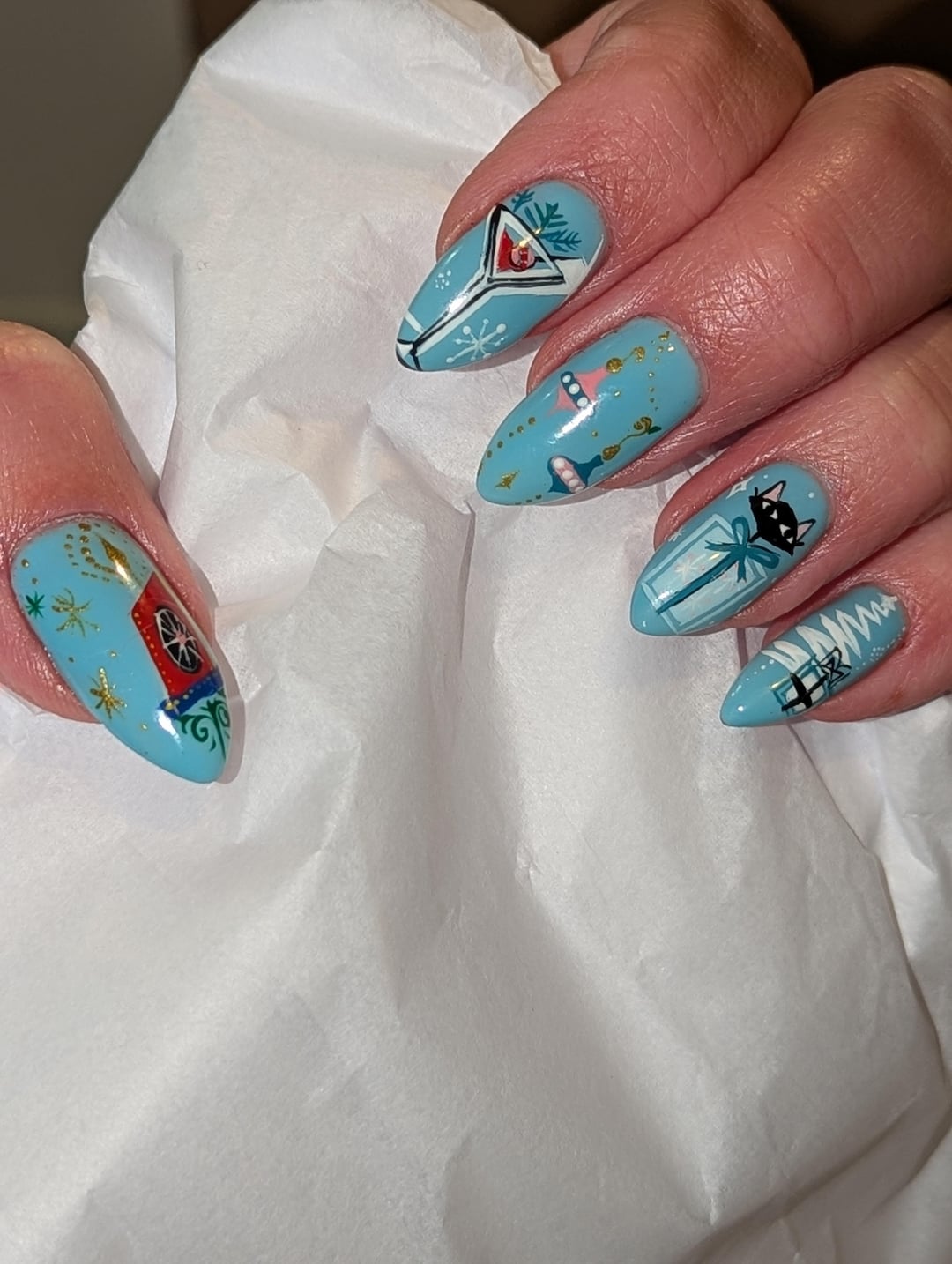 I wanted Midcentury Modern Christmas nails and I couldn't find any inspo. I took inspo from greeting cards, wrapping paper, backgrounds…and my nail tech KILLED IT. I AM OBSESSED!!!