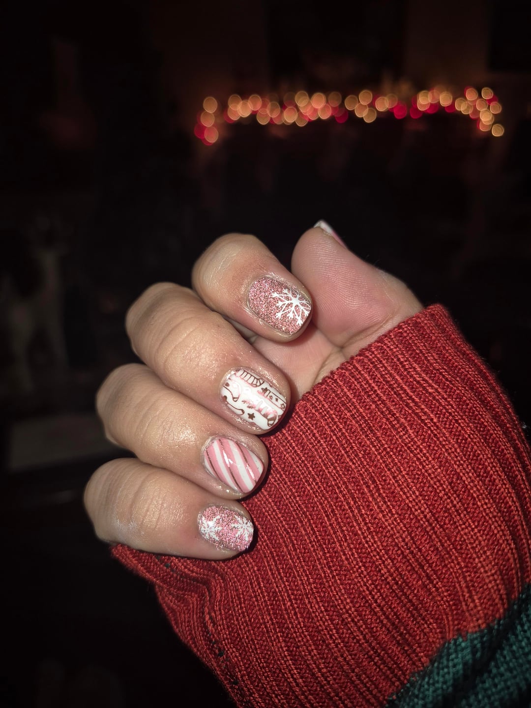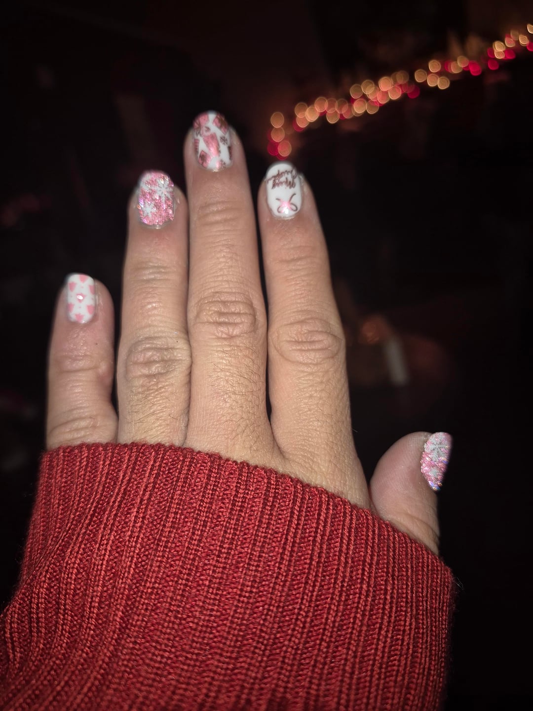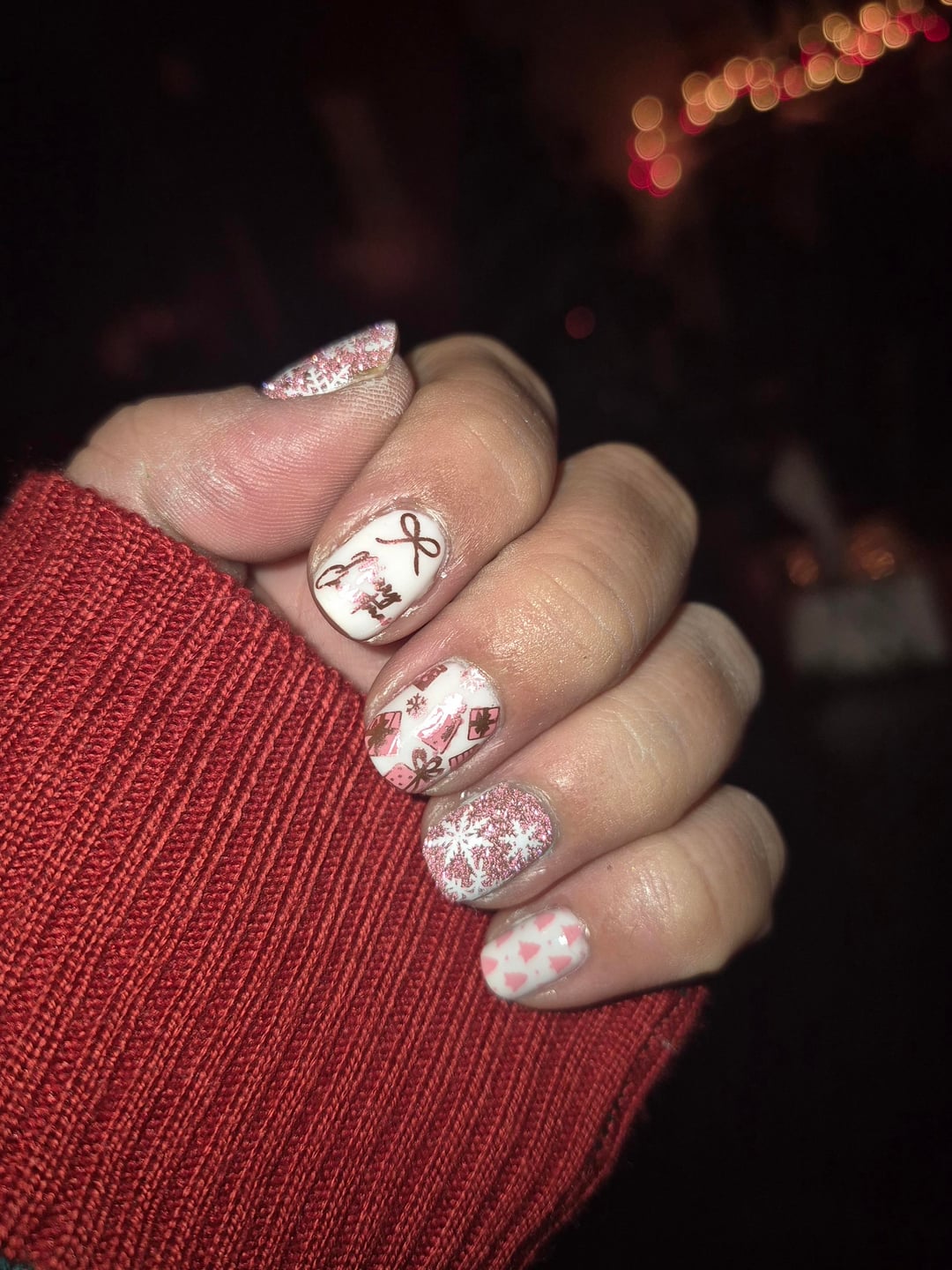 Taking a break from my greens and reds to go pink for christmas. Used 2 coats of Polished For Days Soft Focus basecoat in Snow as my white, and 2 coats of Fancy Gloss Rose Stardust for my accent nails, which is reflective because I can't go without glitter for the holidays. Stamping polish is (ugh) Maniology Juicy Sweet Peach, Satin Blush and Bam White, who I don't support anymore but I have so many plates and polishes that I will still use them because I already spent the $$ on them. Plates are from Maniology, Beauty Big Bang and a few random Amazon brands.