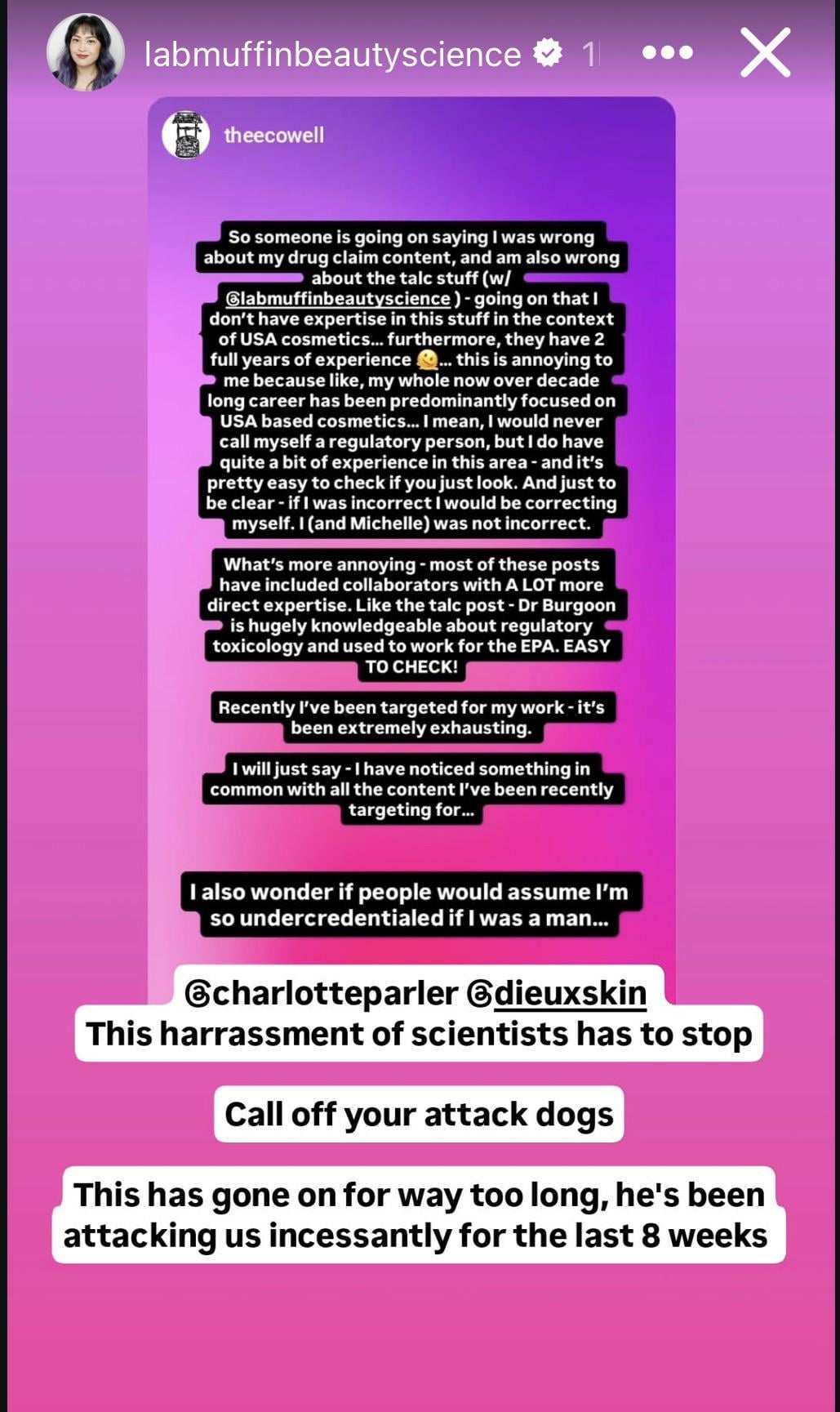 Could someone please explain what’s going on? I casually follow both creators (and use Dieux products) and have had trouble making sense of it. Labmuffinbeautyscience has made quite a few posts like this one. I thought they had a friendly relationship? Is there someone clearly in the wrong?