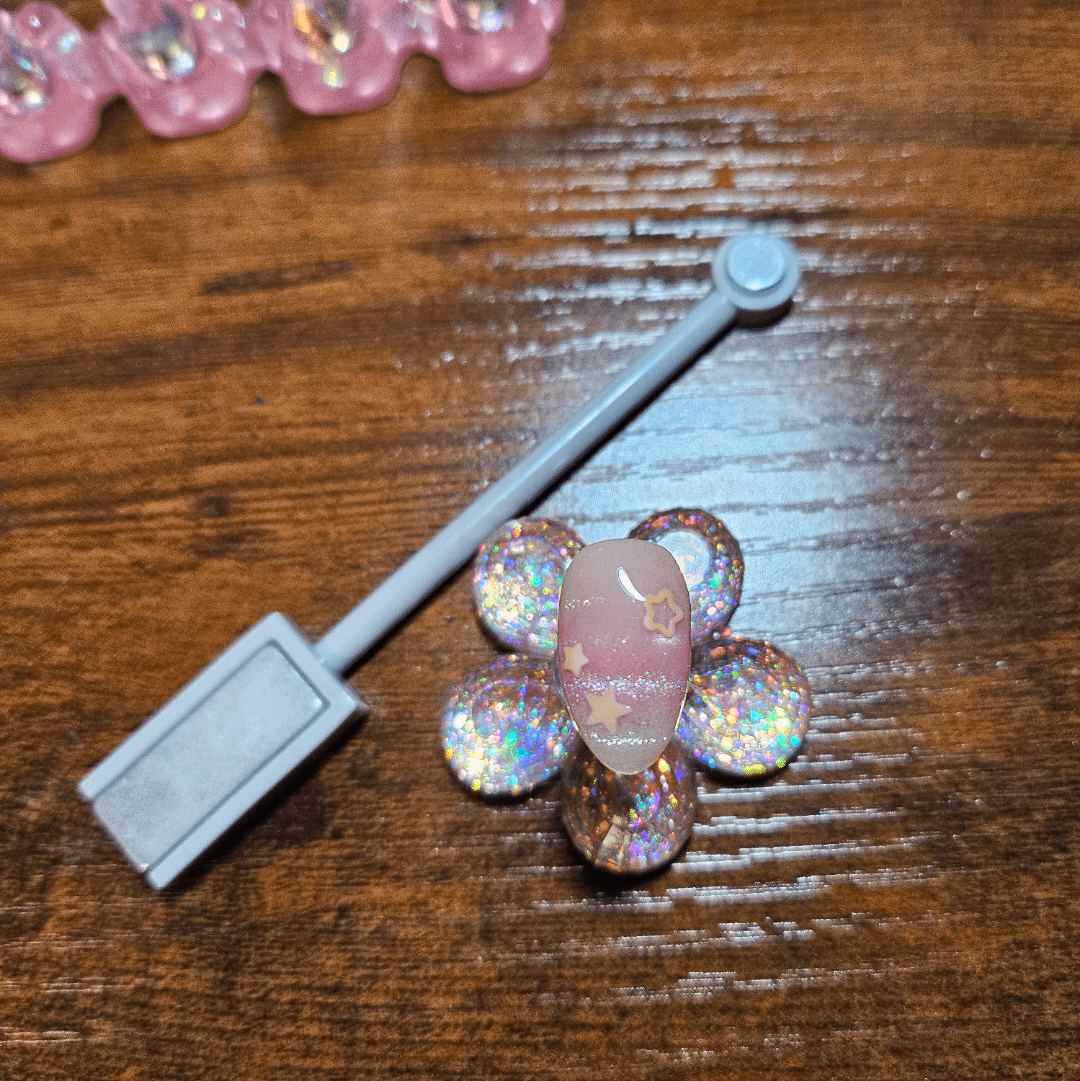 I used 4 different magnetic polishes similar in shade and used a brush to get the gradient. the only star shaped glitter I had were pink iridescent ones so maybe I just need to increase my glitter stock ✨️