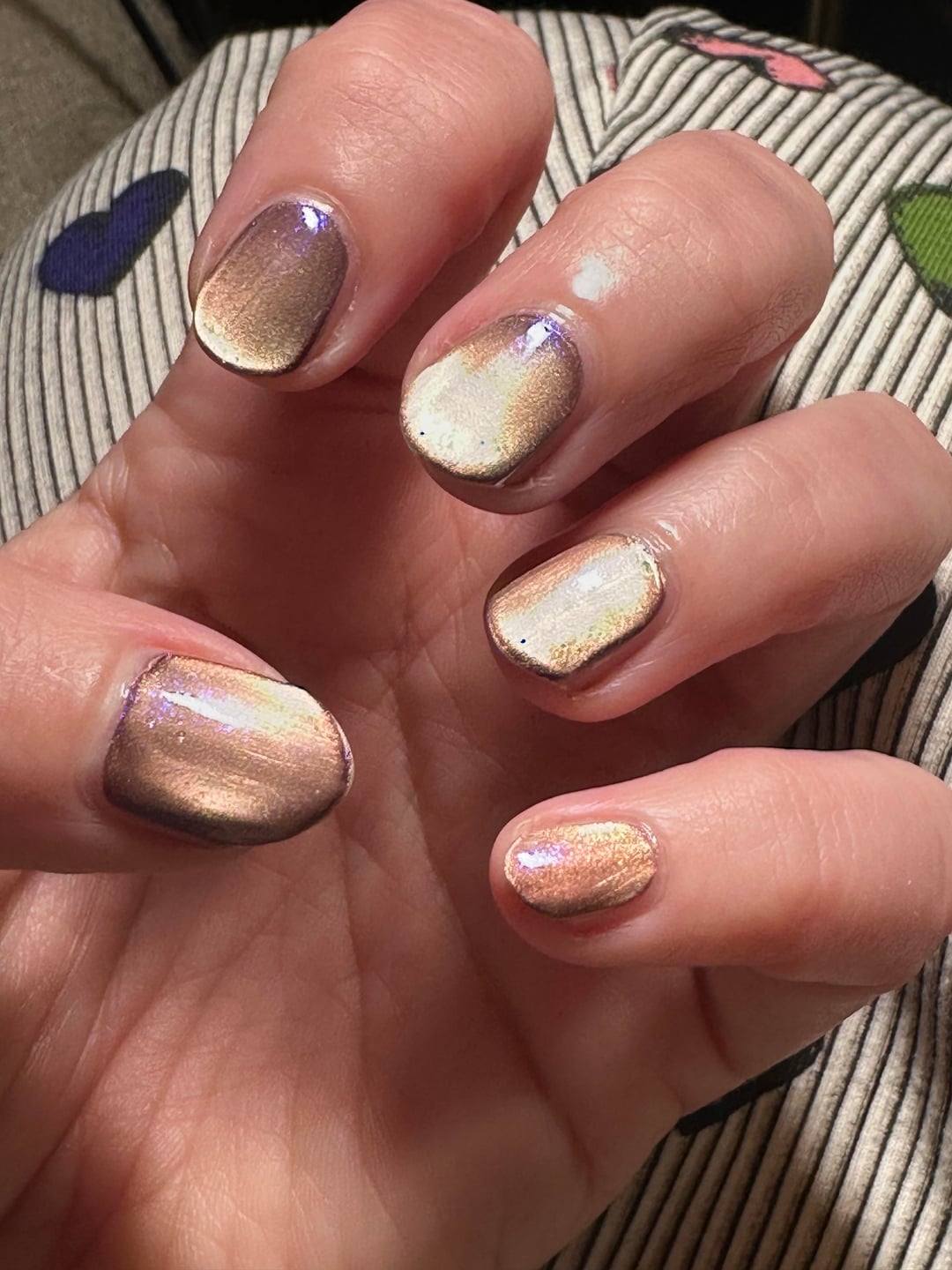 The particles on this one need a good amount of polish to float in if you want a more precise bead. I currently have it on my natural nail as well and it looks like labradorite. Don’t tell the mods but I use UV cure gel top coat because I have more time to work with the product and insure there are no bubbles and it has a smooth glassy finish. I’m using the ‘ Perfect Glass Bead Tool’ from 5dPrint Factory. I will post both sets tomorrow!