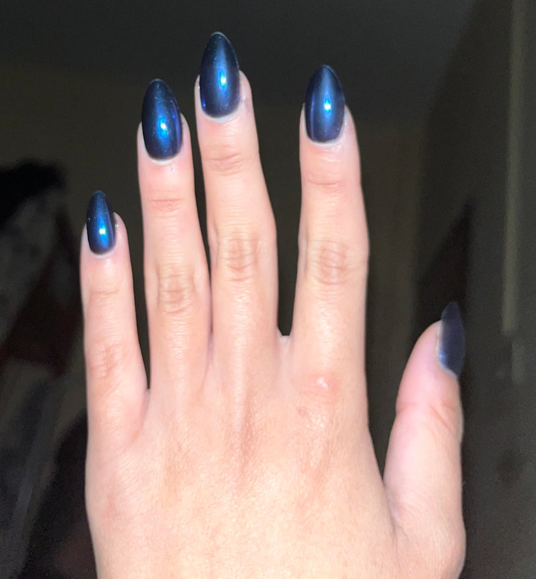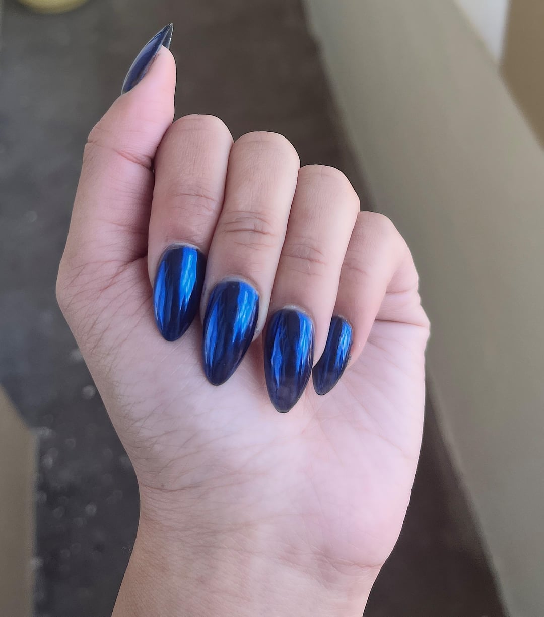 It's my first time getting nail extensions and i wanted a navy blue chrome colour and i did get it last night but i feel like it doesn't suit my skin tone and i feel like my nails are too wide and my fingers are too short to look good with long nails.
