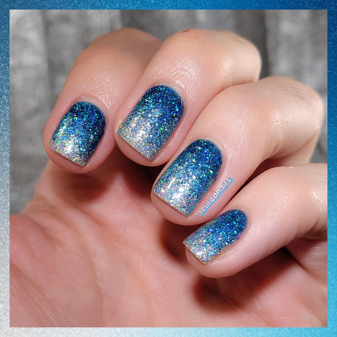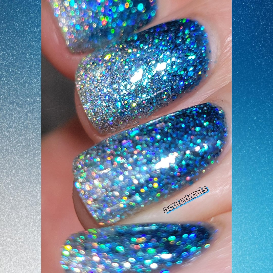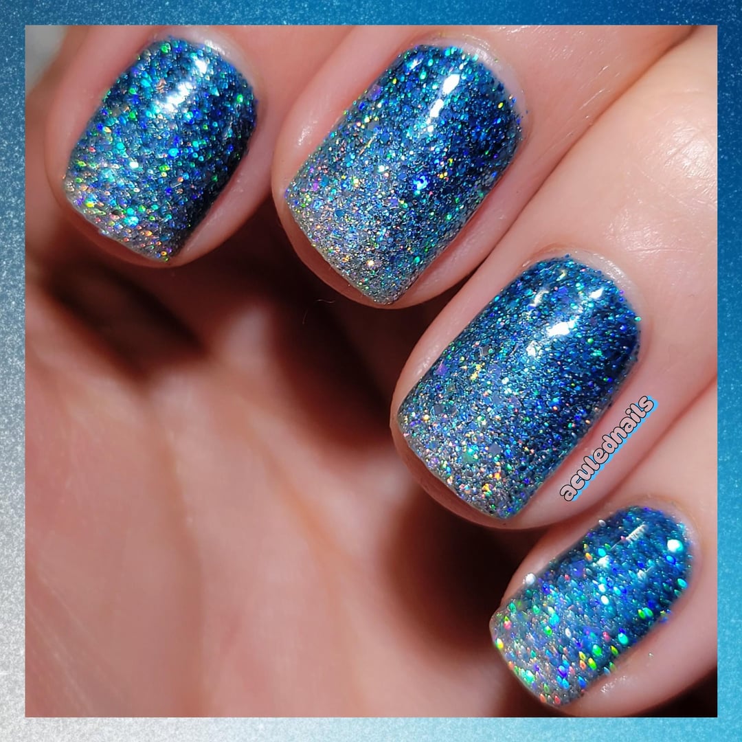 It's no secret that the gorgeous CERULEAN BLUE is my favorite color. A bright blue, with just a fart of green, a lovely cousin to turquoise or aqua, with a little more joie de vive than royal blue. She's perfect. Holo Taco decided to give me my holy grail…an OG Holo Glitterbomb in a luscious cerulean. I bought it within SECONDS, and I couldnt be happier. I had to do my fave nail art…a gradient DUH. Mixed her with two other faves, 8-Bit Blues and Rainbow Snow to make this frosty fucking DREAM. I havent painted my nails since last Thursday…(who am I?!) and breaking the curse with this beauty is everything I needed. Glorious Holo Cerulean. I can ascend now.