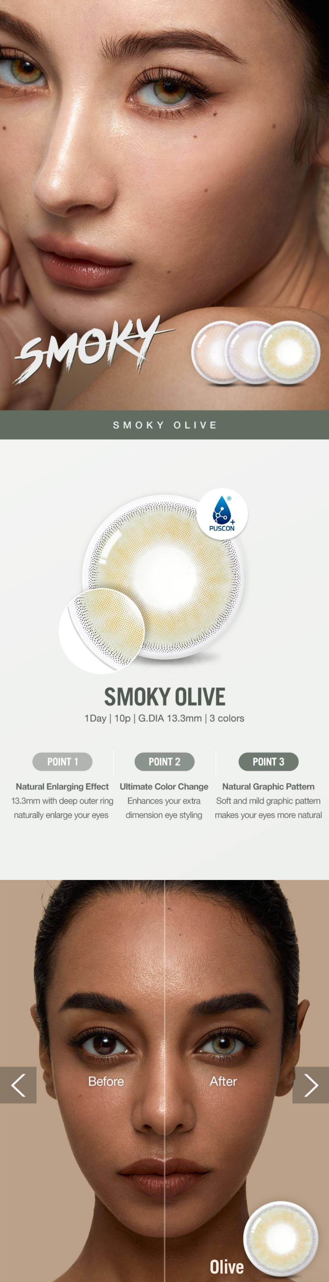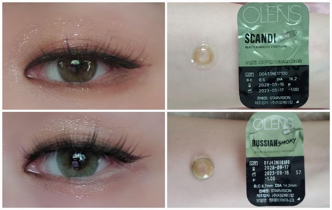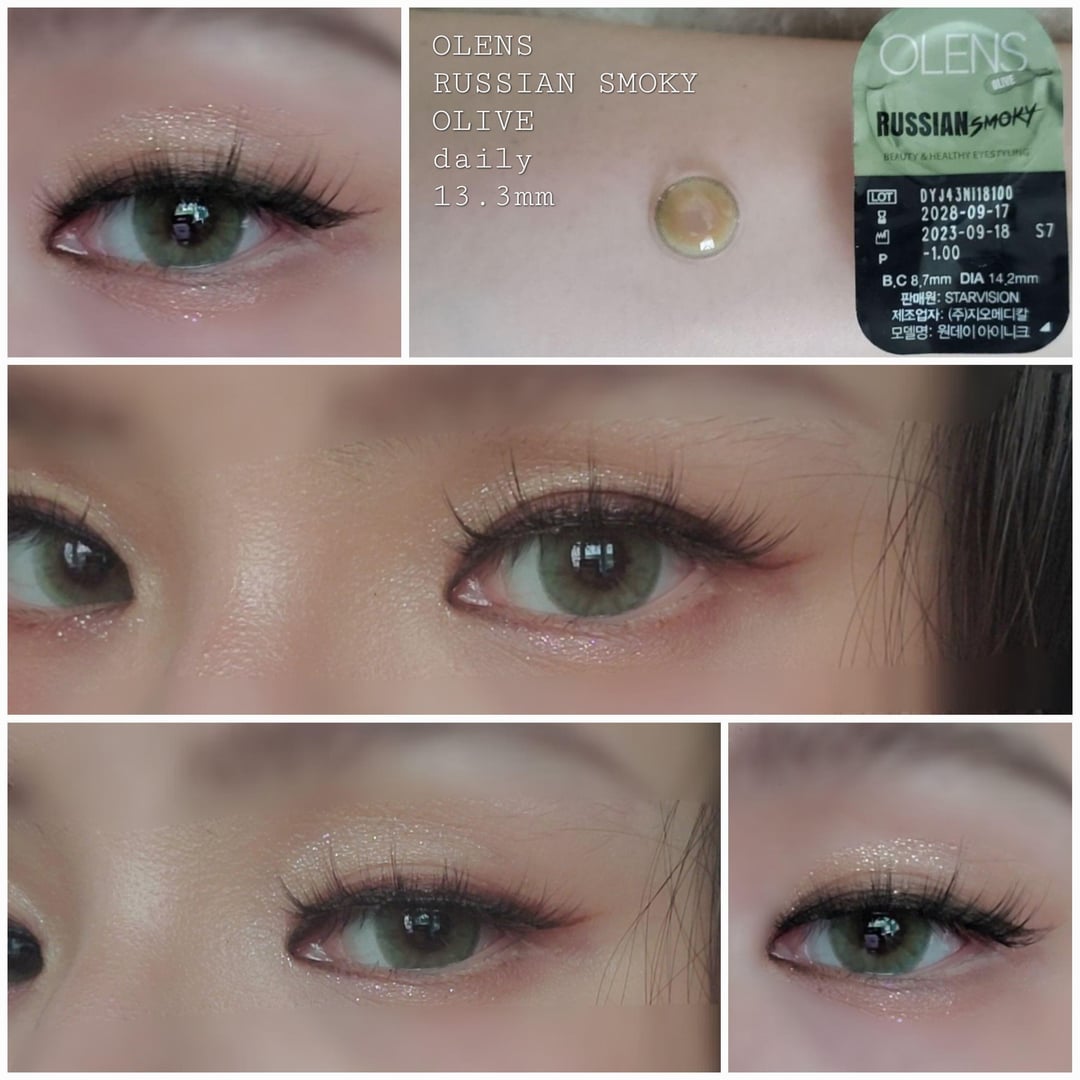 russian smoky olive is a lovely light-medium cooler green lens with some brown blending at the pupil and a darker olive limbal ring. it’s quite an opaque lens offering obvious colour change on my dark irises, but with a very soft pattern that gives it its dreamy smoky effect with a gentle greyed olive tone, reminiscent of glossy jade pearls irl. it does have a bit of a subtle blooming pattern. because of the light colour, on dark eyes the enlarged pupil hole is more obvious; personally im not a huge fan, but the dilated dolly pupil look is considered cute. overall tho, i have to say it’s a gorgeous lens that’s gotten multiple compliments every single time. i can see why it’s a bestseller for fairytale green eyes.