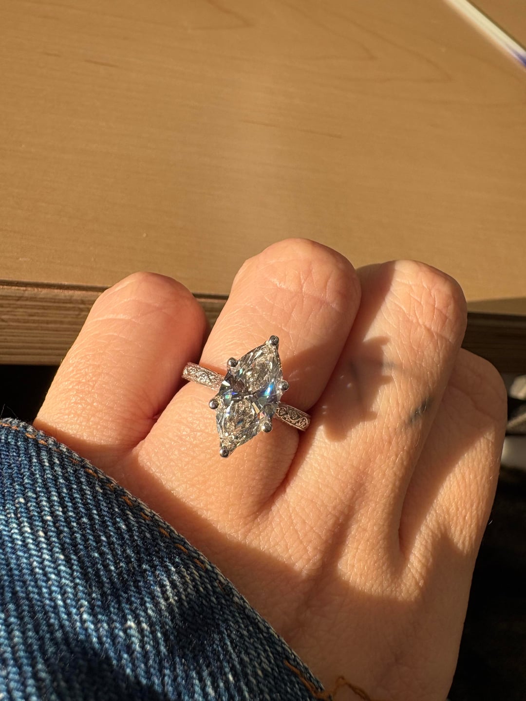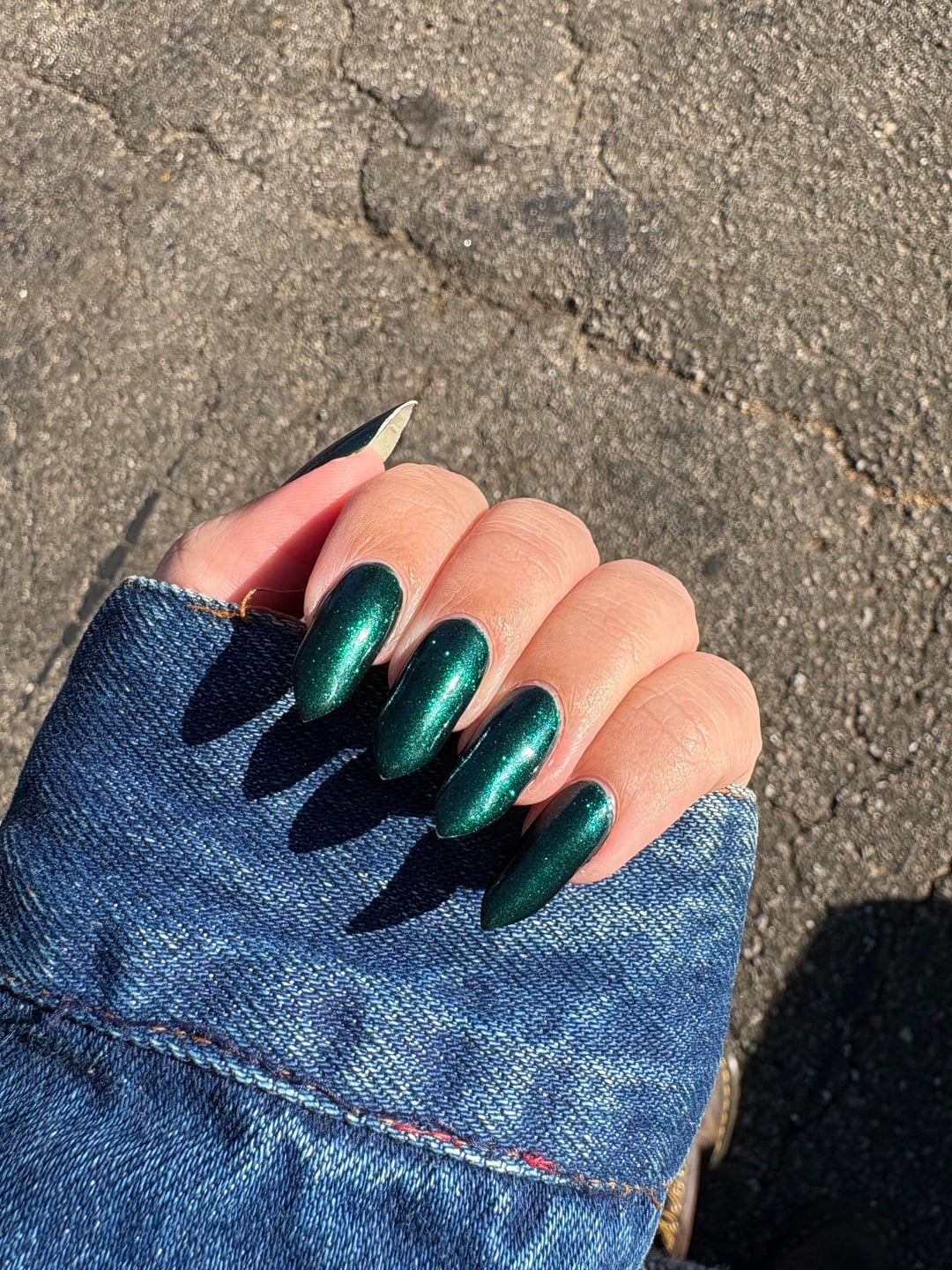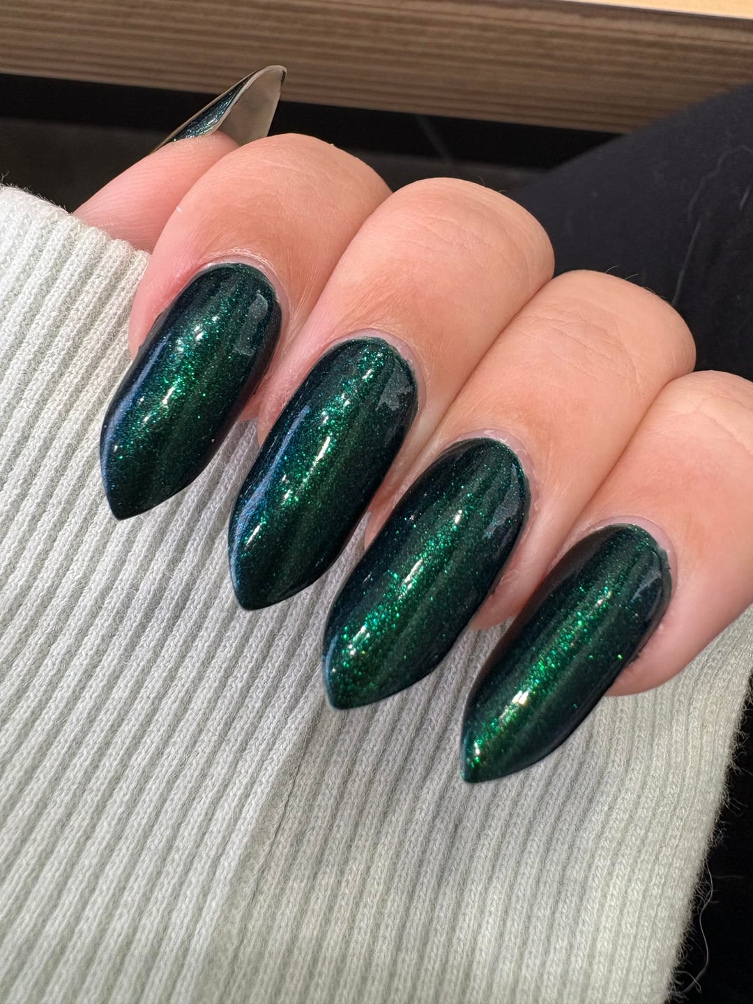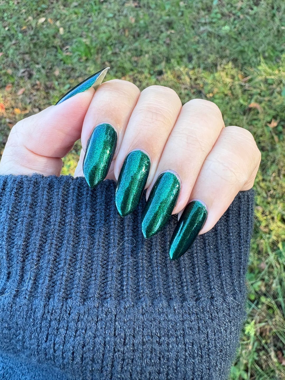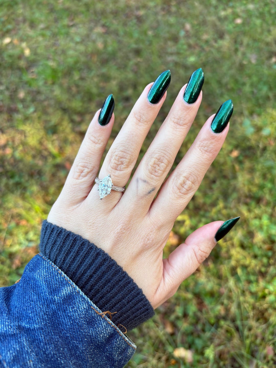 my fiancé proposed to me this past saturday and i couldn’t be happier!! i knew it was going to happen this month so i had a different color picked out for every week that i would be okay getting engaged in (last week was lurid tibberz!! and next week was going to be ilnp merlot) but i’m really glad it ended up being this beautiful green. i haven’t been able to stop staring at my ring or my nails since it happened 😋 last slide is a close up of my ring for those who want to see, i know i always do!