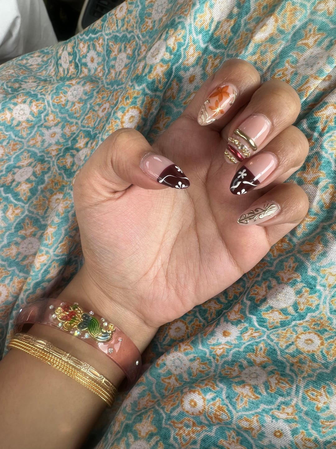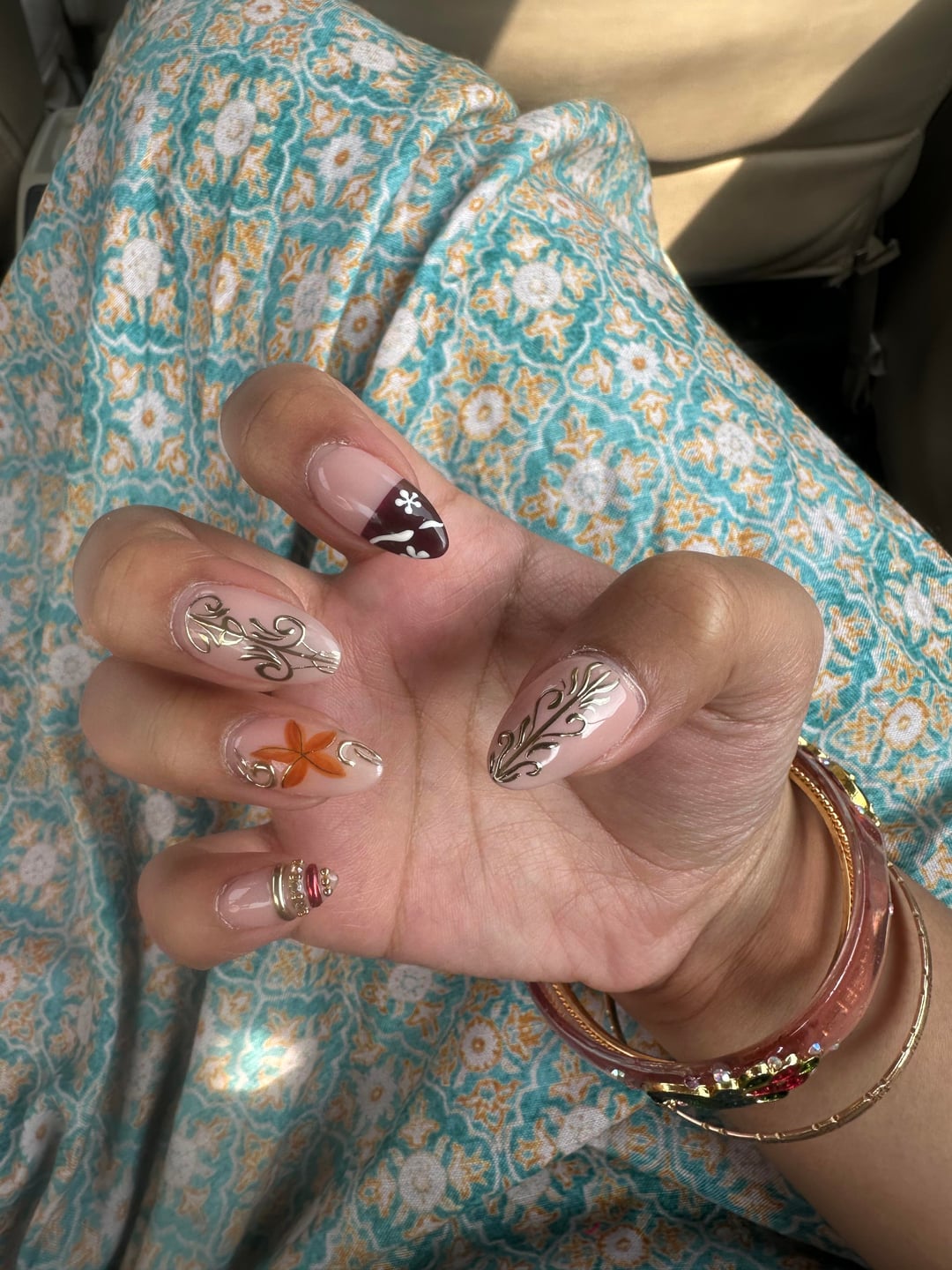 Tried to make these super Indian themed lol๐ญ the flowers are similar to some I saw on my last trip, the red french nails are supposed to look like henna, and duh I had to do some bangle nails. My nail tech is actually the goat I love love love these๐ค๐๐ฝ