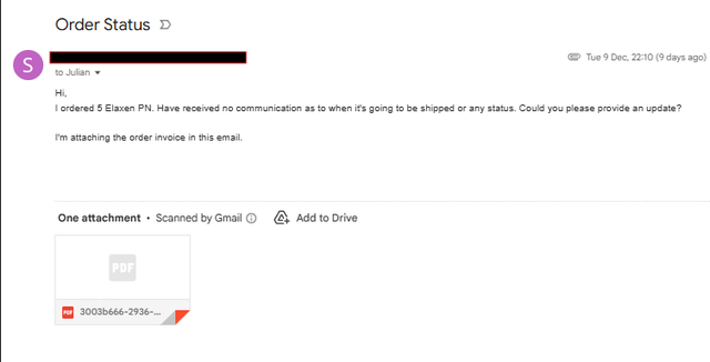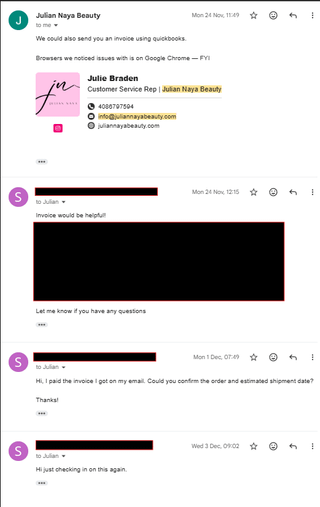 After payment, I heard nothing from the company, no order was placed or follow up. I gave them some time but eventually sent them a follow up email on 1st December. Gave them 2 days and again followed up on 3rd December to which no one replied.