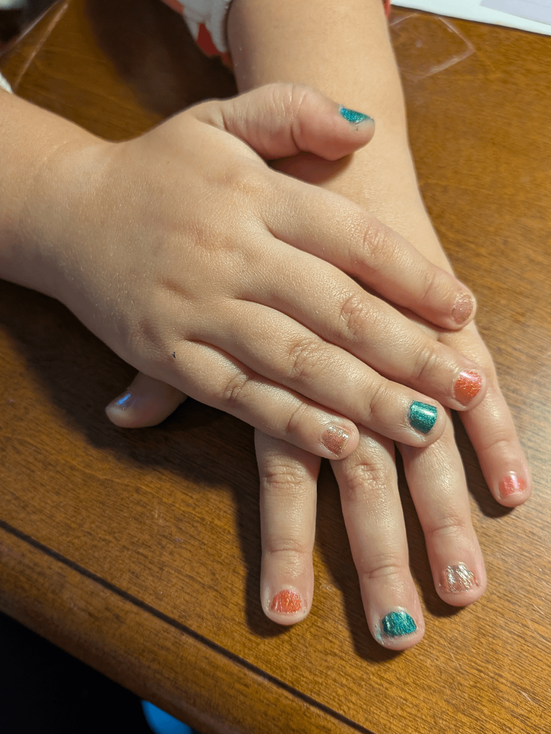 We don't base or top coat her nails because she is building patience with her nails! She desperately wanted to have sparkly nails for Christmas, and is now running up to everyone we meet hands first showing off. Tbh kind of my spirit animal, I wish I could just shove my nails in people's faces and say "Look!"