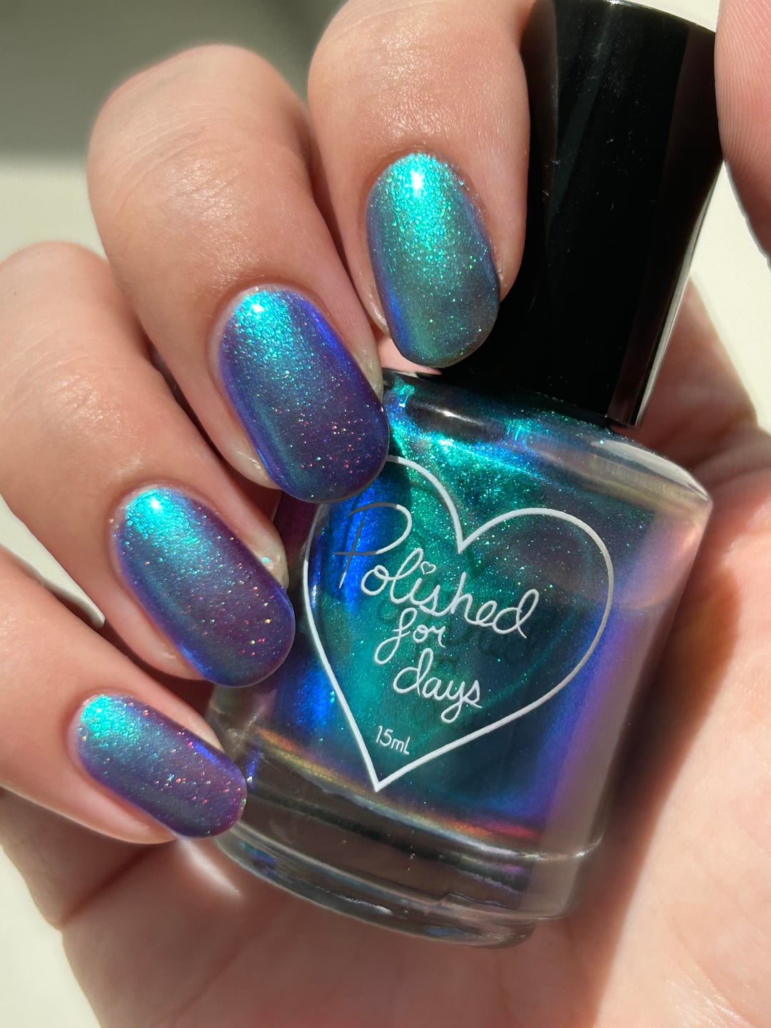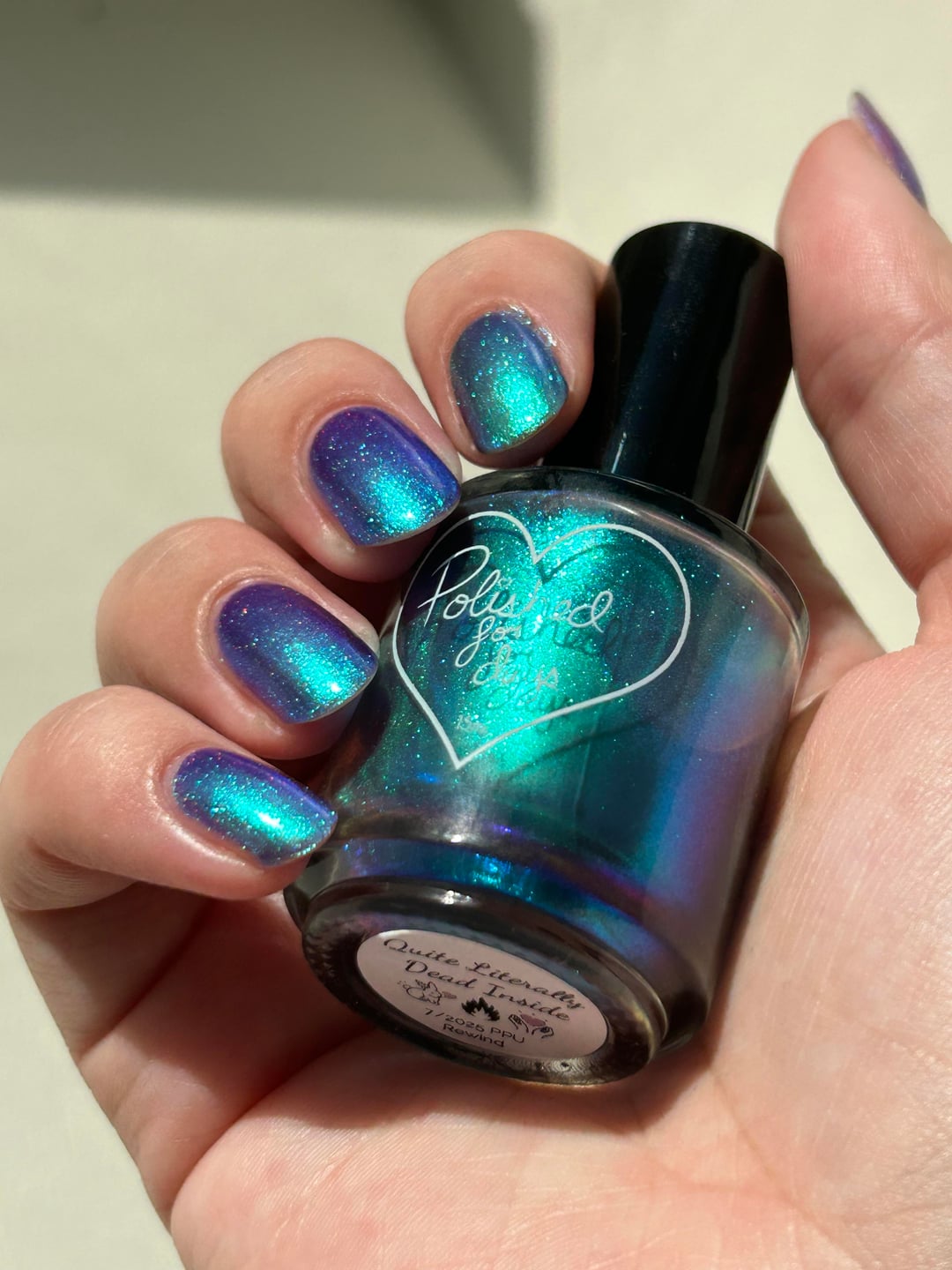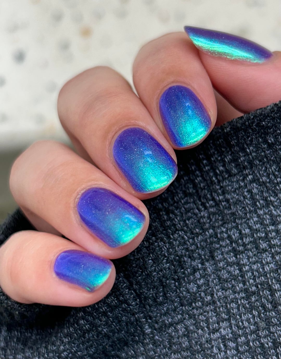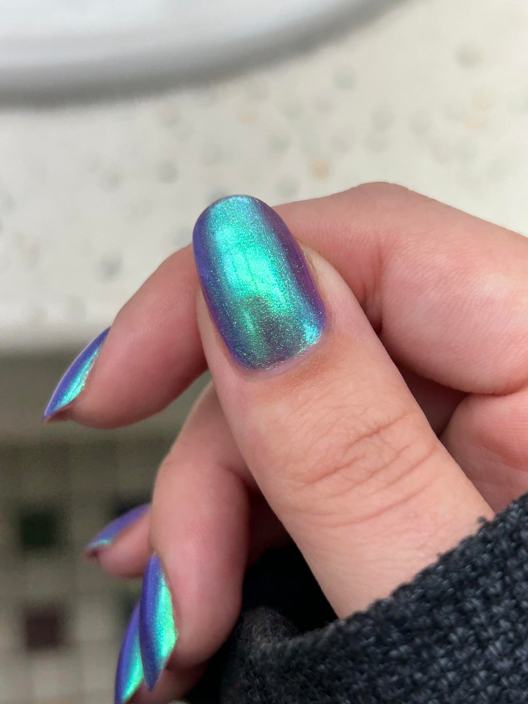 I thought this polish was going to be more blue than it is (strong green shimmer that I don’t remember from the product photos), but I still like it. The last 3 pics show it compared to Polished For Days- Quite Literally Dead Inside (swatched on pointer finger), as I was reminded of it when I noticed how green it was. But luckily I don’t think I duped myself since compared to PFD it’s a lot more purple/shifty