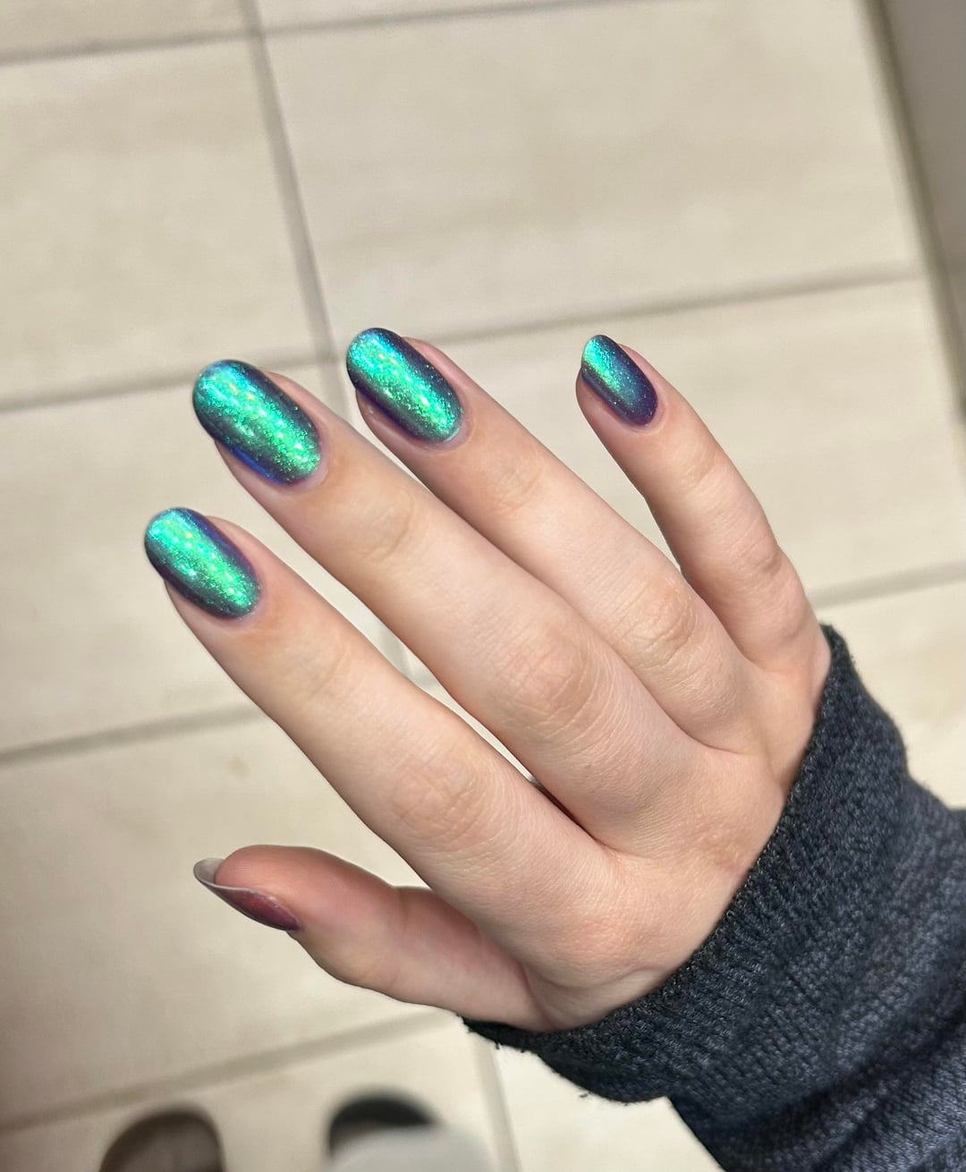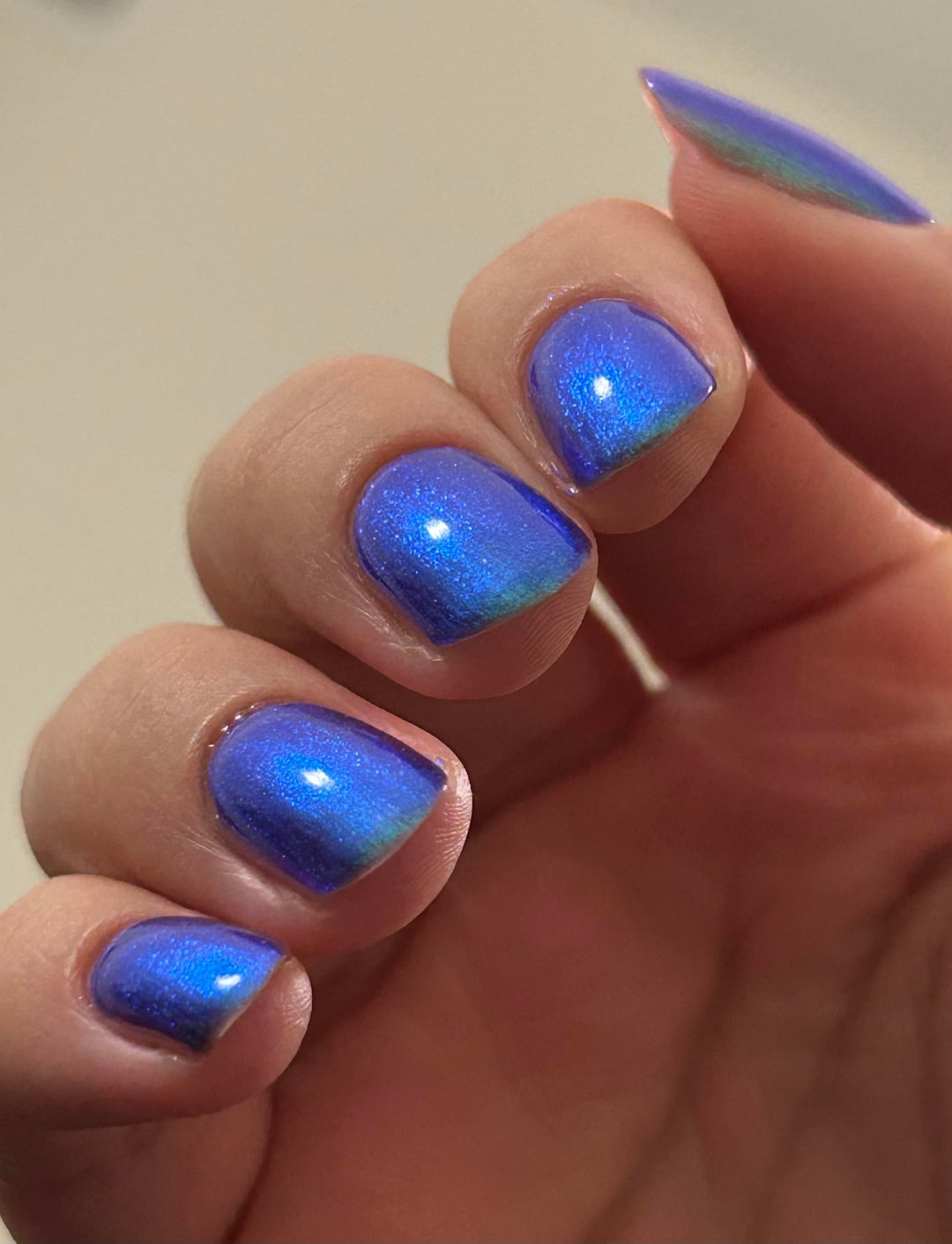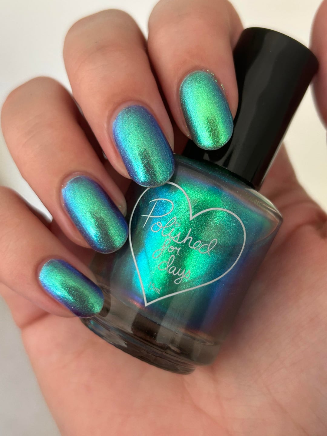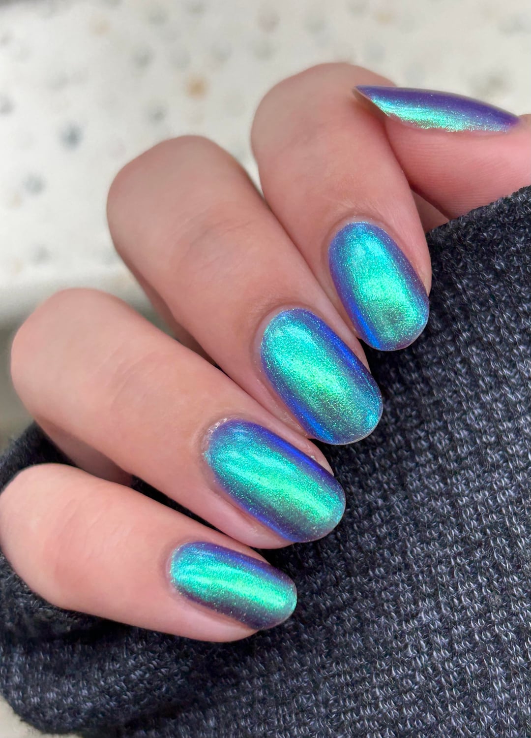 I thought this polish was going to be more blue than it is (strong green shimmer that I don’t remember from the product photos), but I still like it. The last 3 pics show it compared to Polished For Days- Quite Literally Dead Inside (swatched on pointer finger), as I was reminded of it when I noticed how green it was. But luckily I don’t think I duped myself since compared to PFD it’s a lot more purple/shifty