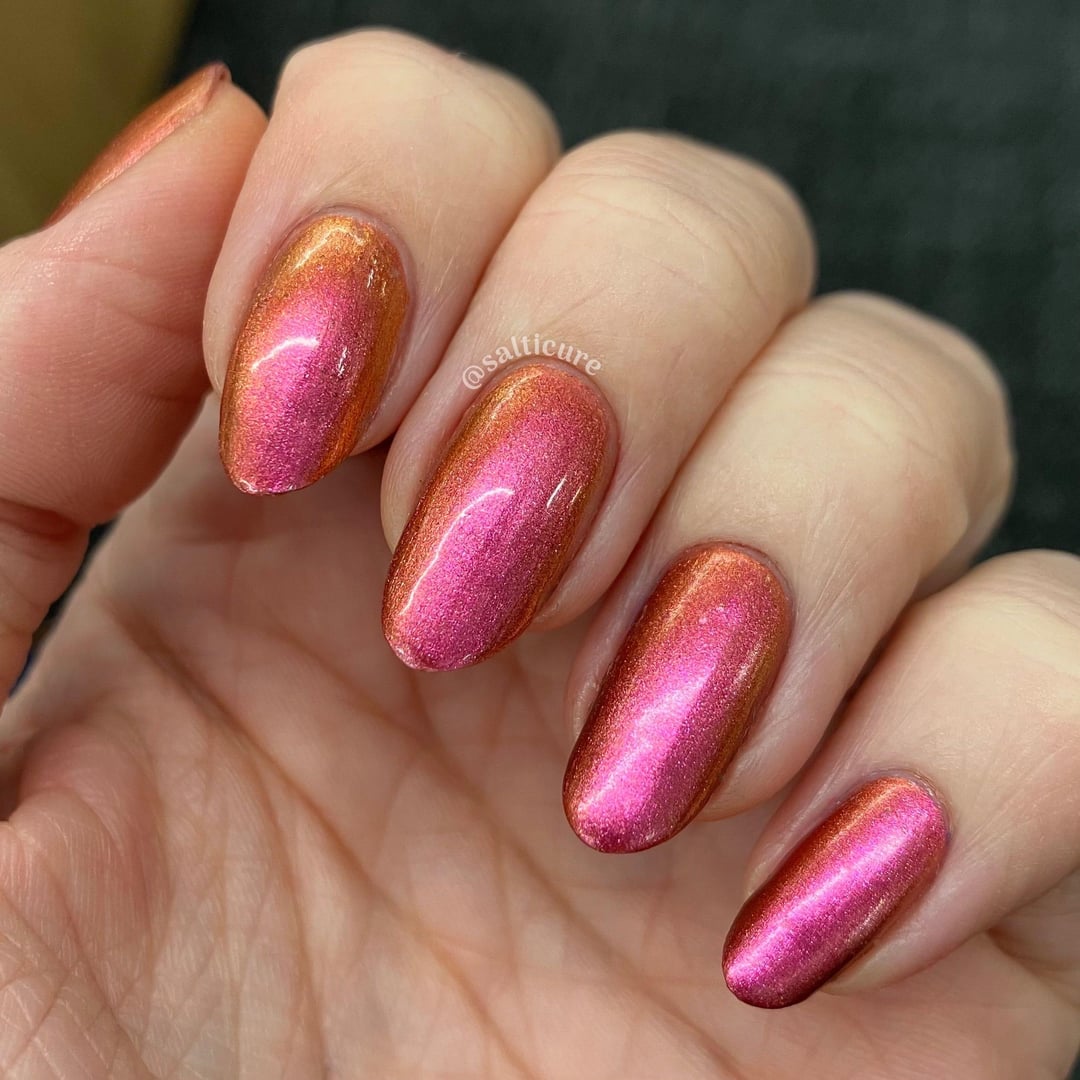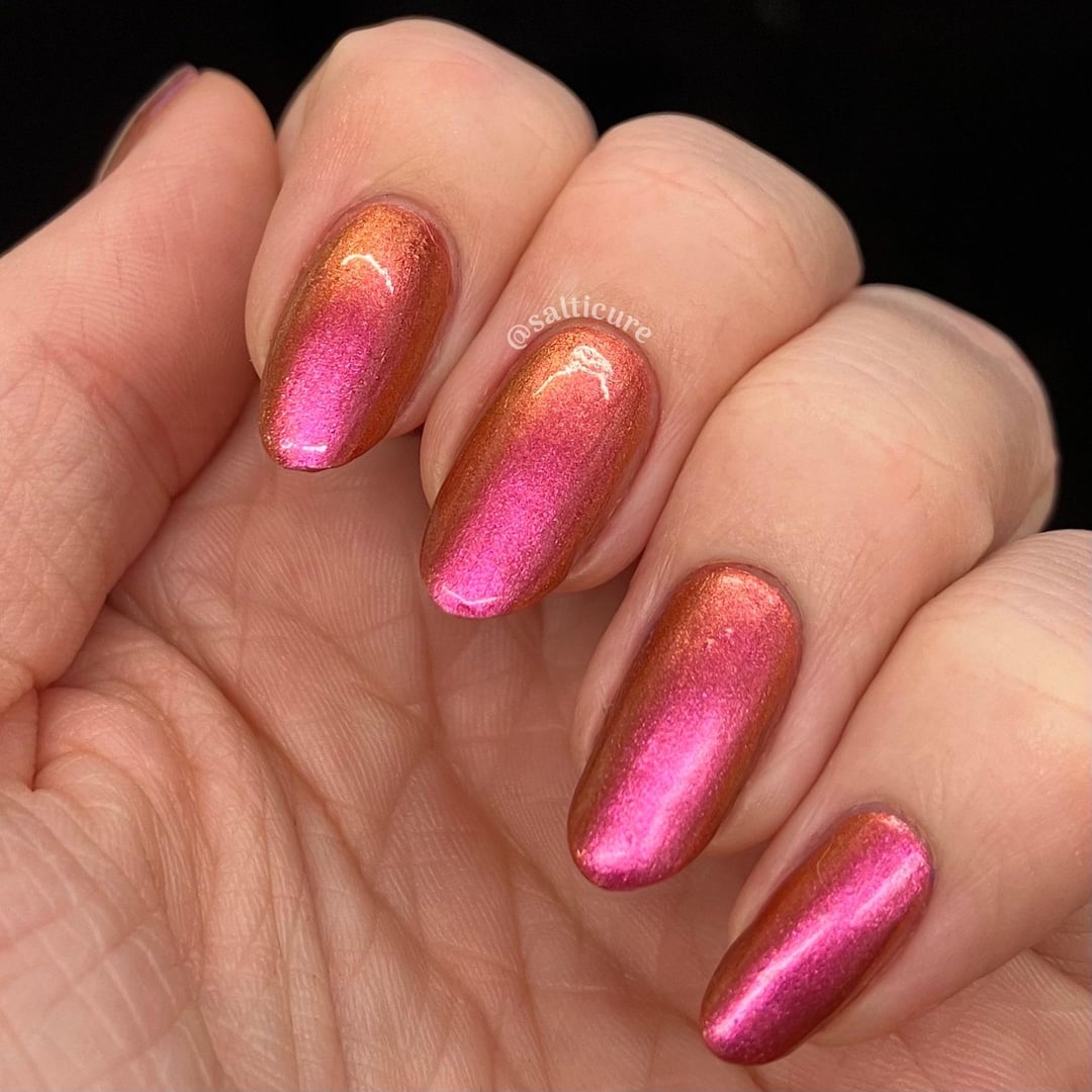 When The Sun Leaves looks so boring in the bottle when I first got it I thought I had made a mistake adding it to my order. Turns out she just needed a trip to my office lighting to really shine. You really get that flash of bright fuchsia in obnoxious LED office building lights.