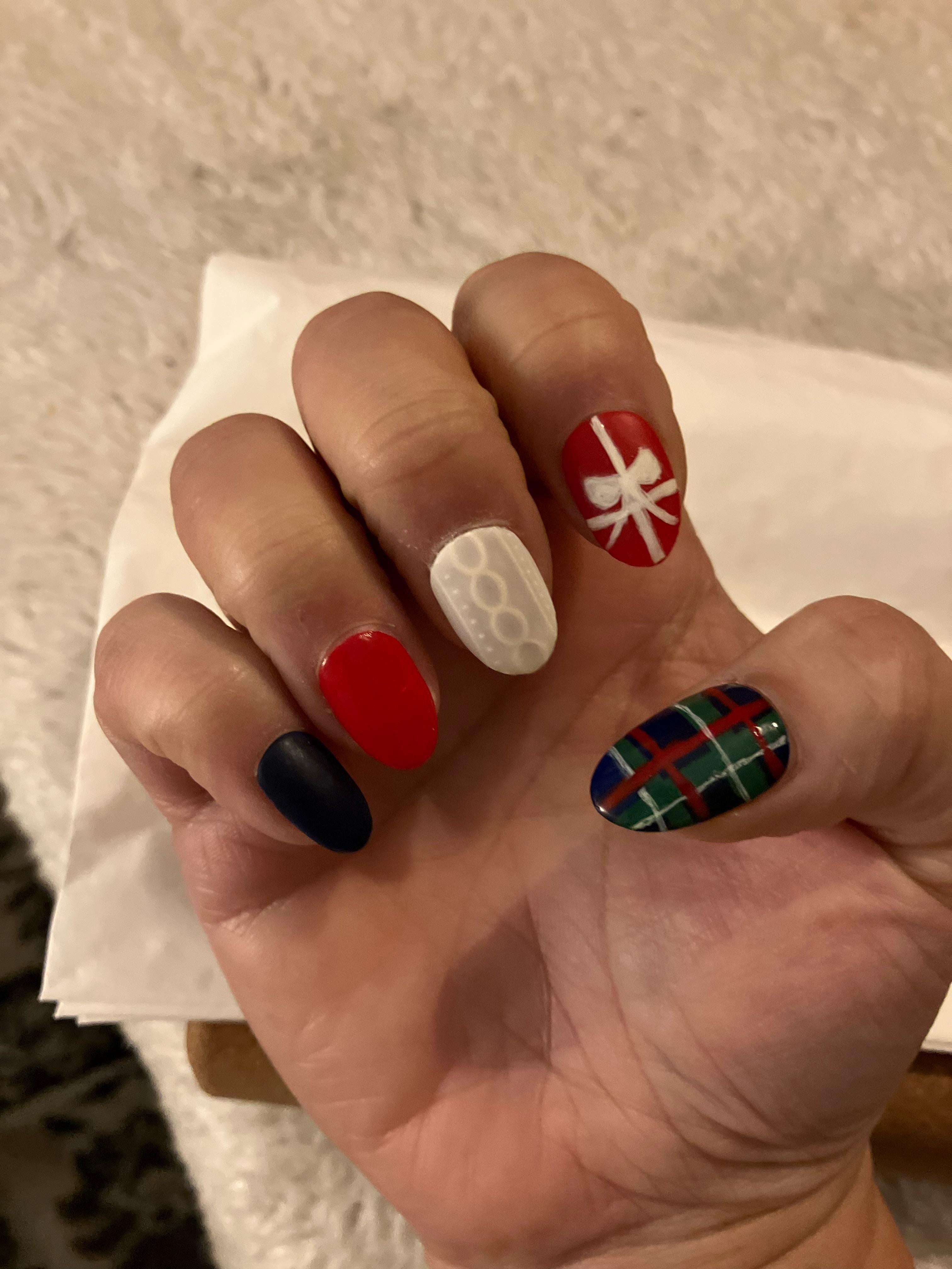 I’m pretty new (3 months) to actual nail art after many years of just painting solid colours. My colour collection is also very limited. So be kind 😆. I confess to using nail stickers for the sweater nails which I’ve never used before either. Have now worked out that I should’ve painted the first, then the stickers and then another coat of white before the matte TC. Live and learn. Regardless, I’m never doing tartan again. Or bows, I hate bows.