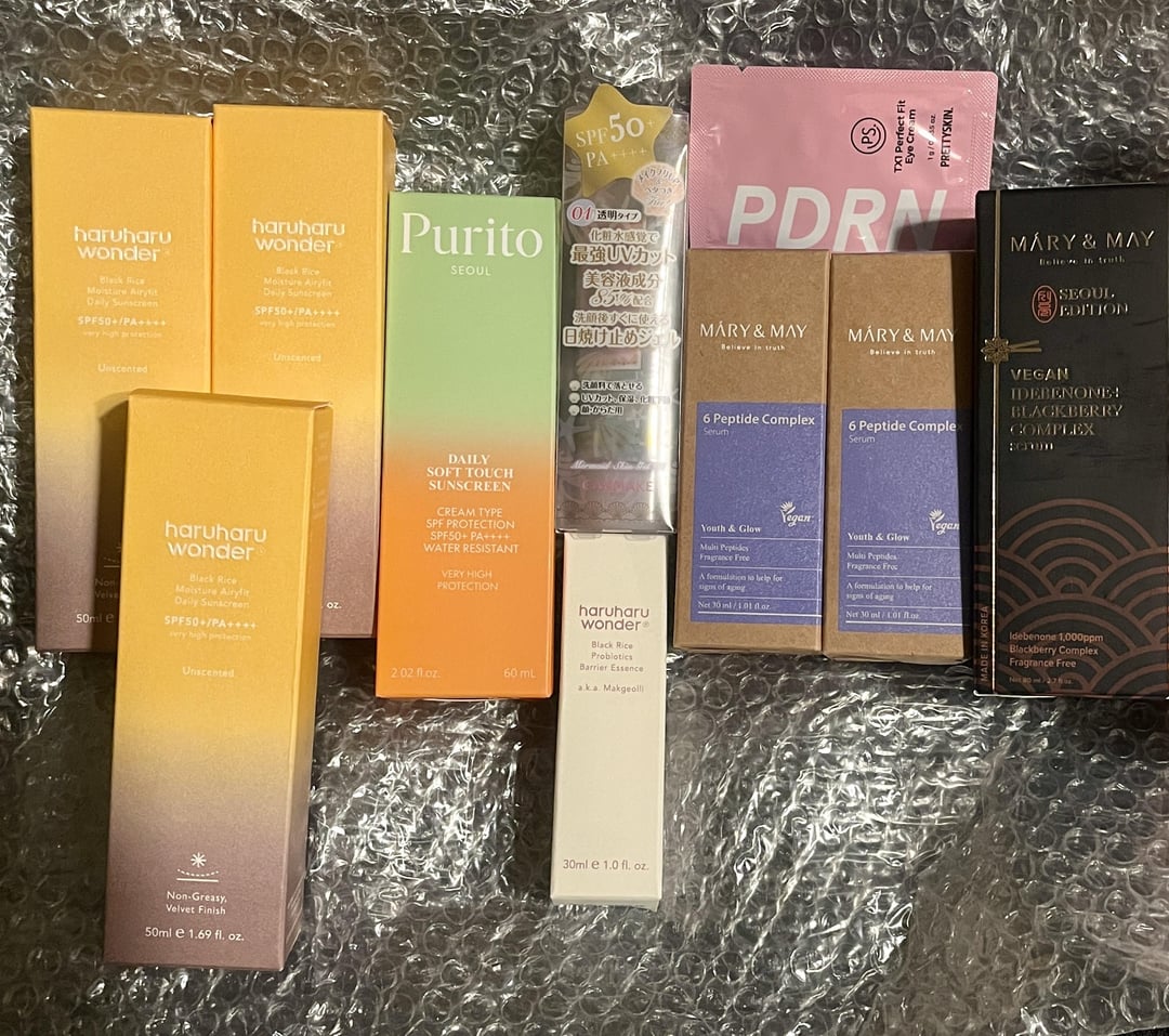I placed this order from Stylevana on November 29 with express shipping. It just arrived today with no issues – I’m in Texas. My main concern was the sunscreen getting through customs. With this order along with the sunscreens I already have that I bought in April, I probably have enough to last through 2026. All the sunscreens below expire in 2028, so I'm good there.
