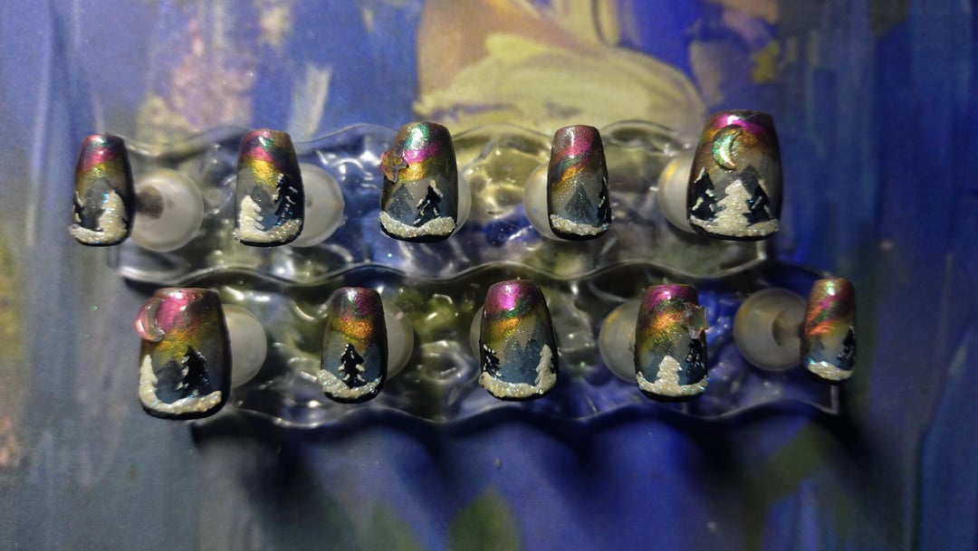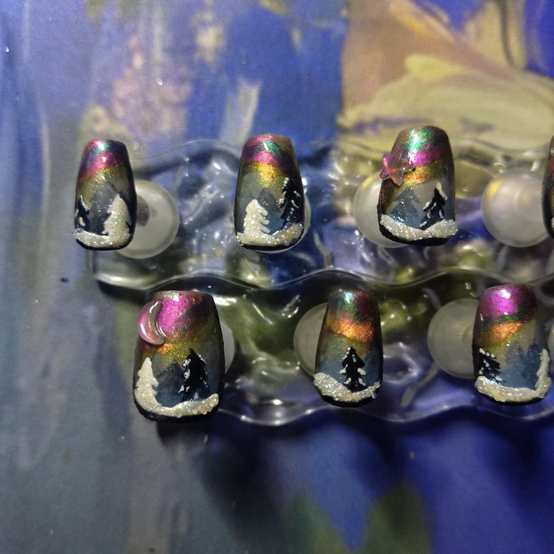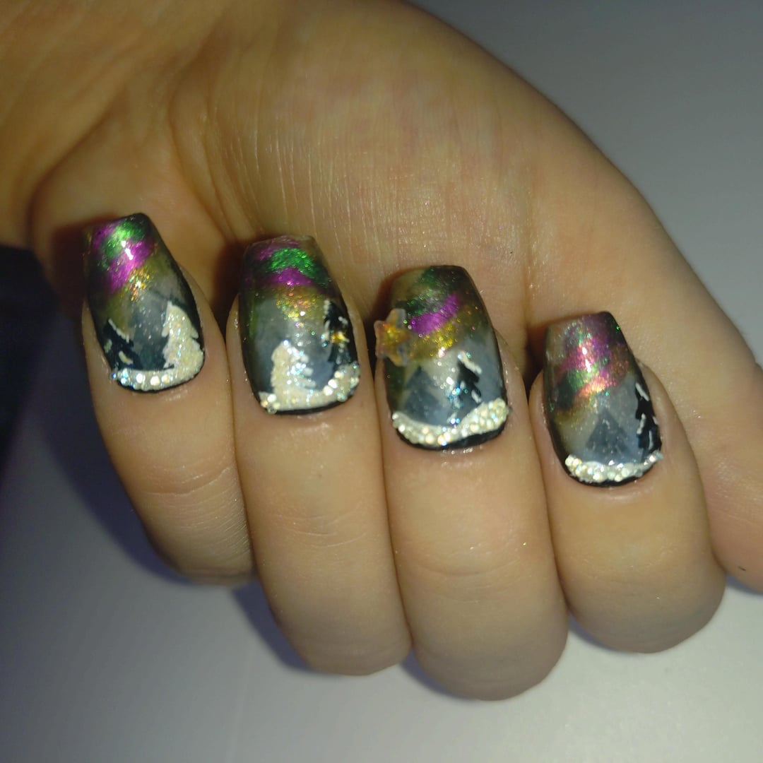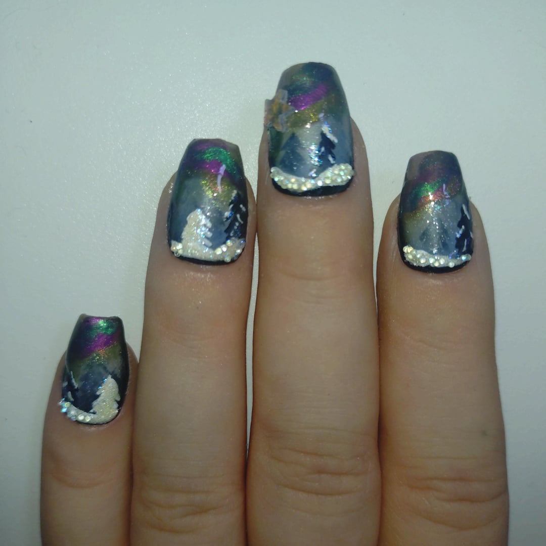 Aurora borealis inspired snowy nails. I hand painted these with regular polish and layered matte and magnetic polishes. The snow actually glows in the dark! The snow texture is very 3D. I used glitter and tiny iridescent balls for it. Hope you like them! I posted a video in my profile to show how they shift in the light. The pics really dont do them justice ~
