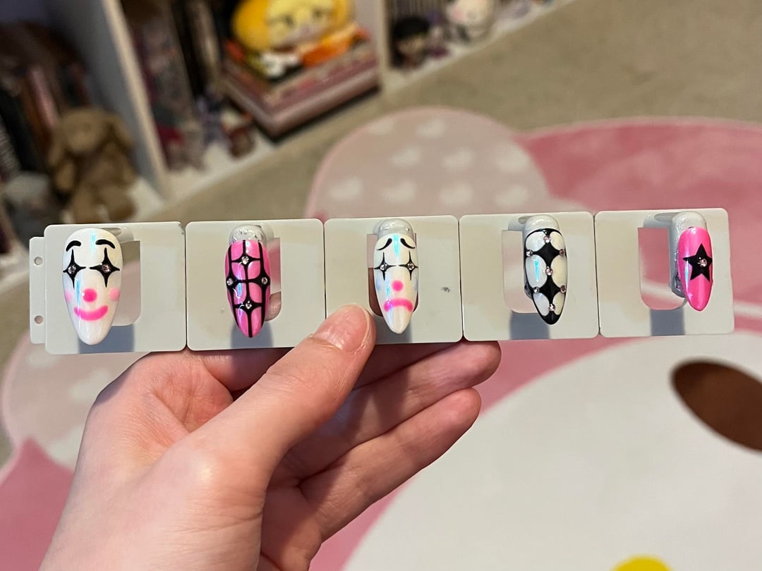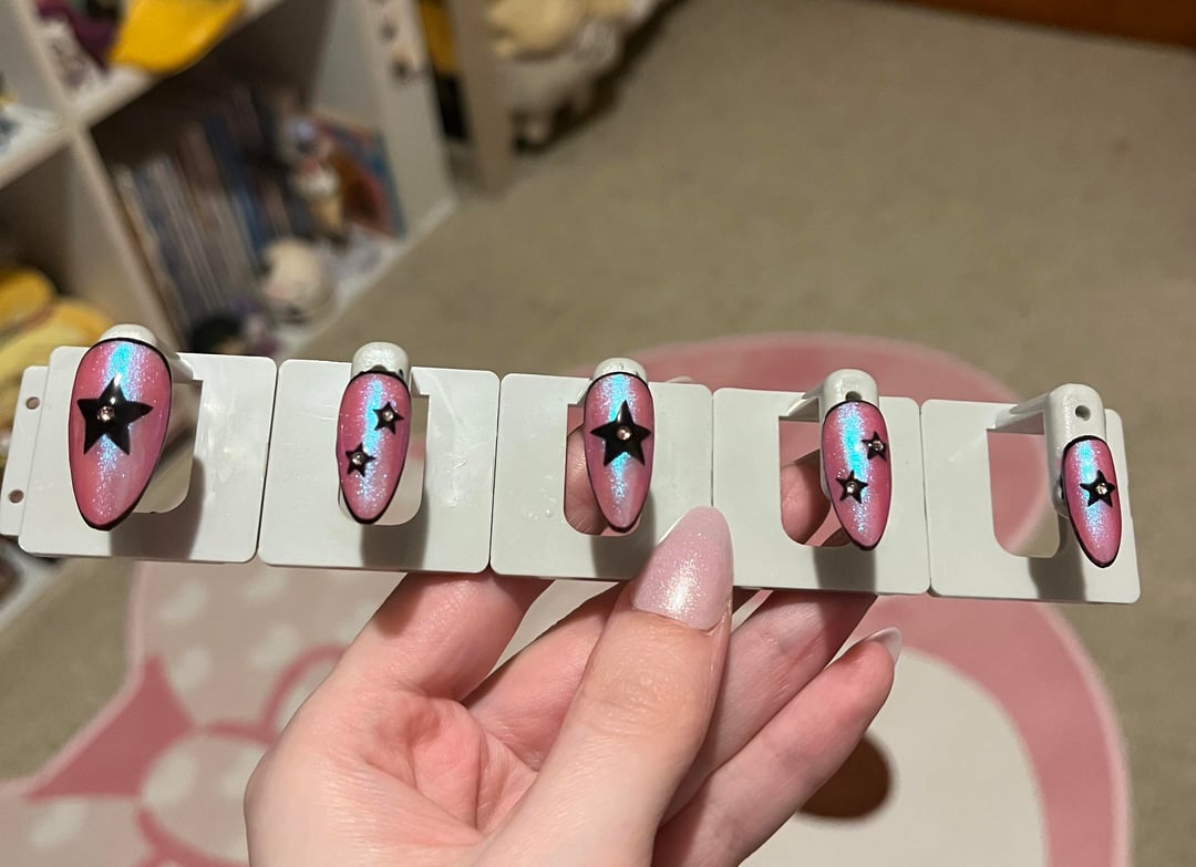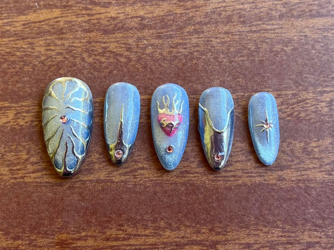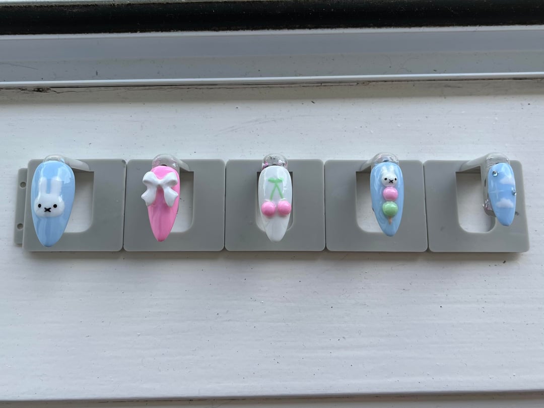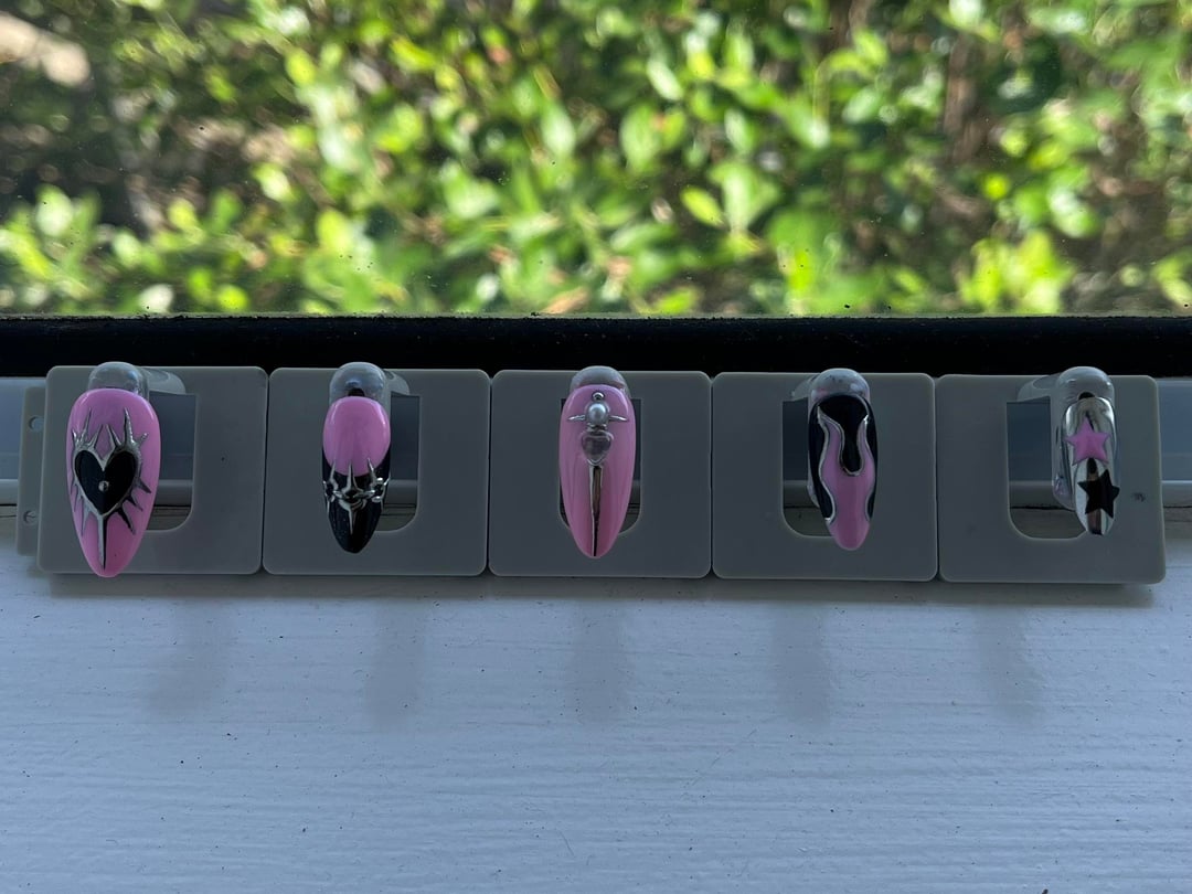 made an account just to post from my camera roll while i’m home for the holidays away from all my kit and going through withdrawals 😭 please excuse my damaged thumbnail from said press ons and applying the thumb incorrectly. my goal is to make my own press ons and just have fun being creative ✨ i’ve been teaching myself for a couple of months and loving it, thankyou for all the inspiration on this sub!
