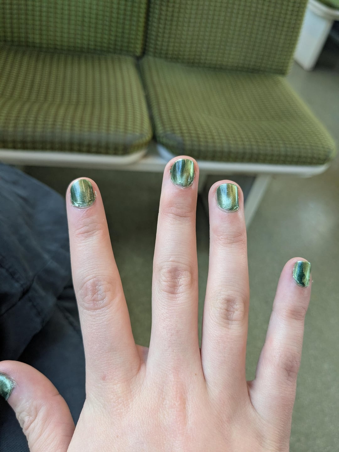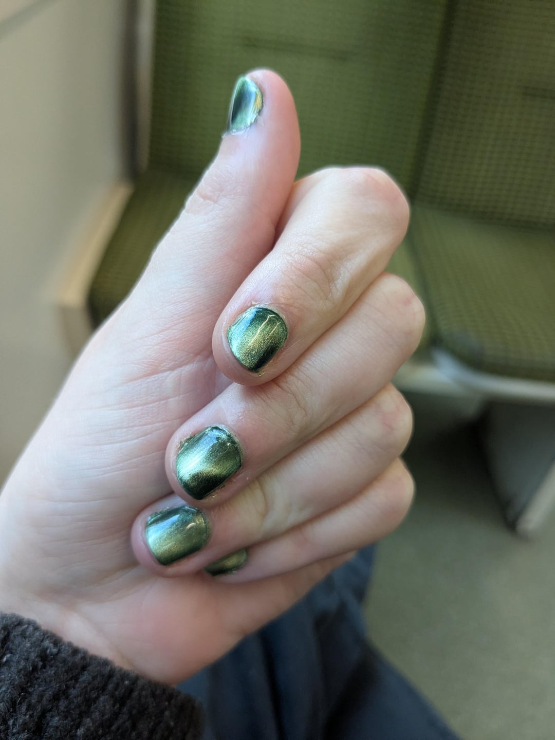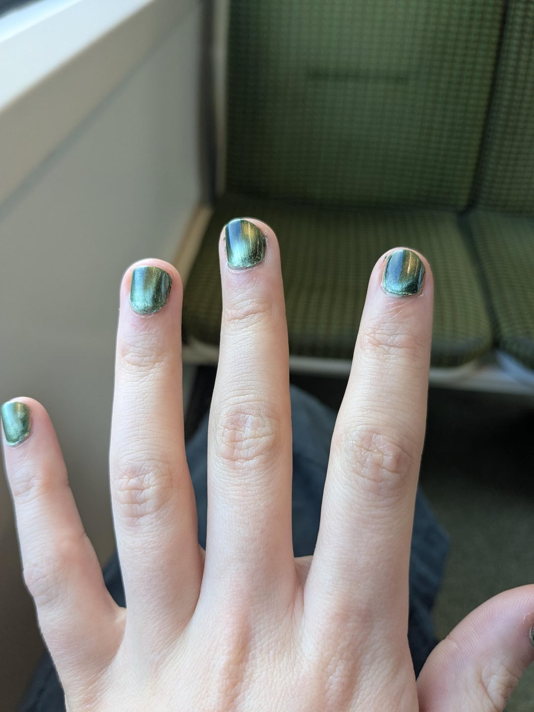 1. I used 2 coats of essence MAGIC MAGNETIC mini nail polish (shade 10 of the mini range) with (attempt at) cateye magnetize each time. Topped with 2 coats of Essie Stay longer top coat !